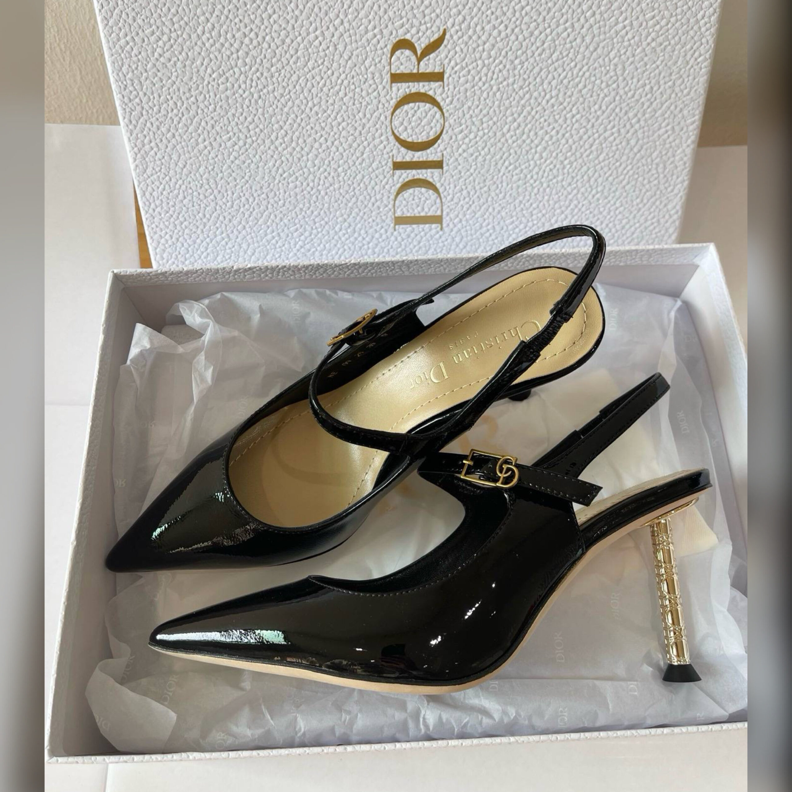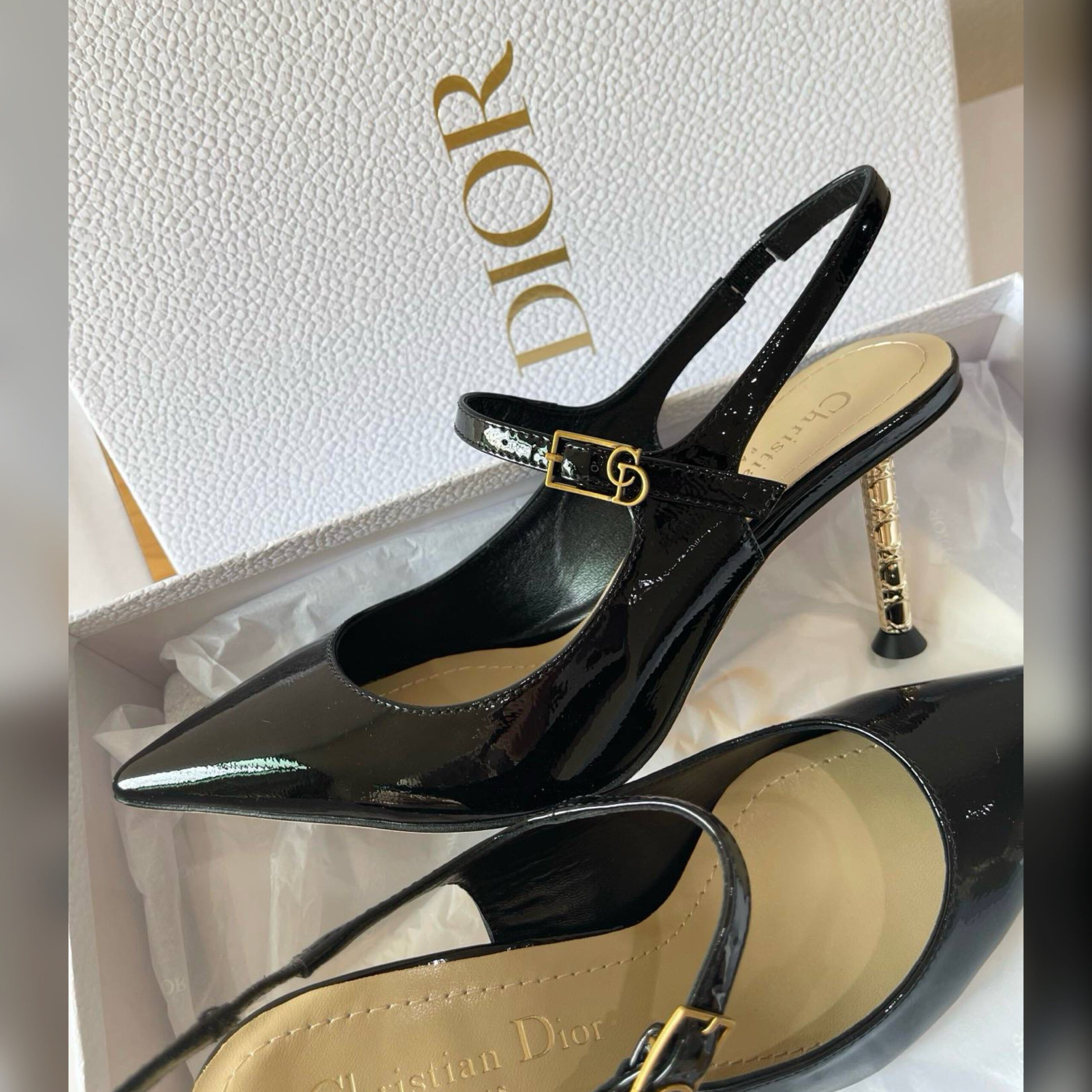 Туфли Dior Icon демонстрируют элегантную эстетику модного дома. Модель из лакированной телячьей кожи имеет заостренный мыс и регулируемый ремешок, украшенный переплетенной подписью CD, вдохновленной архивами марки. Тонкий 8-сантиметровый каблук из металла с золотистой отделкой демонстрирует мотив Cannage, подчеркивая эстетику пары изысканным штрихом.