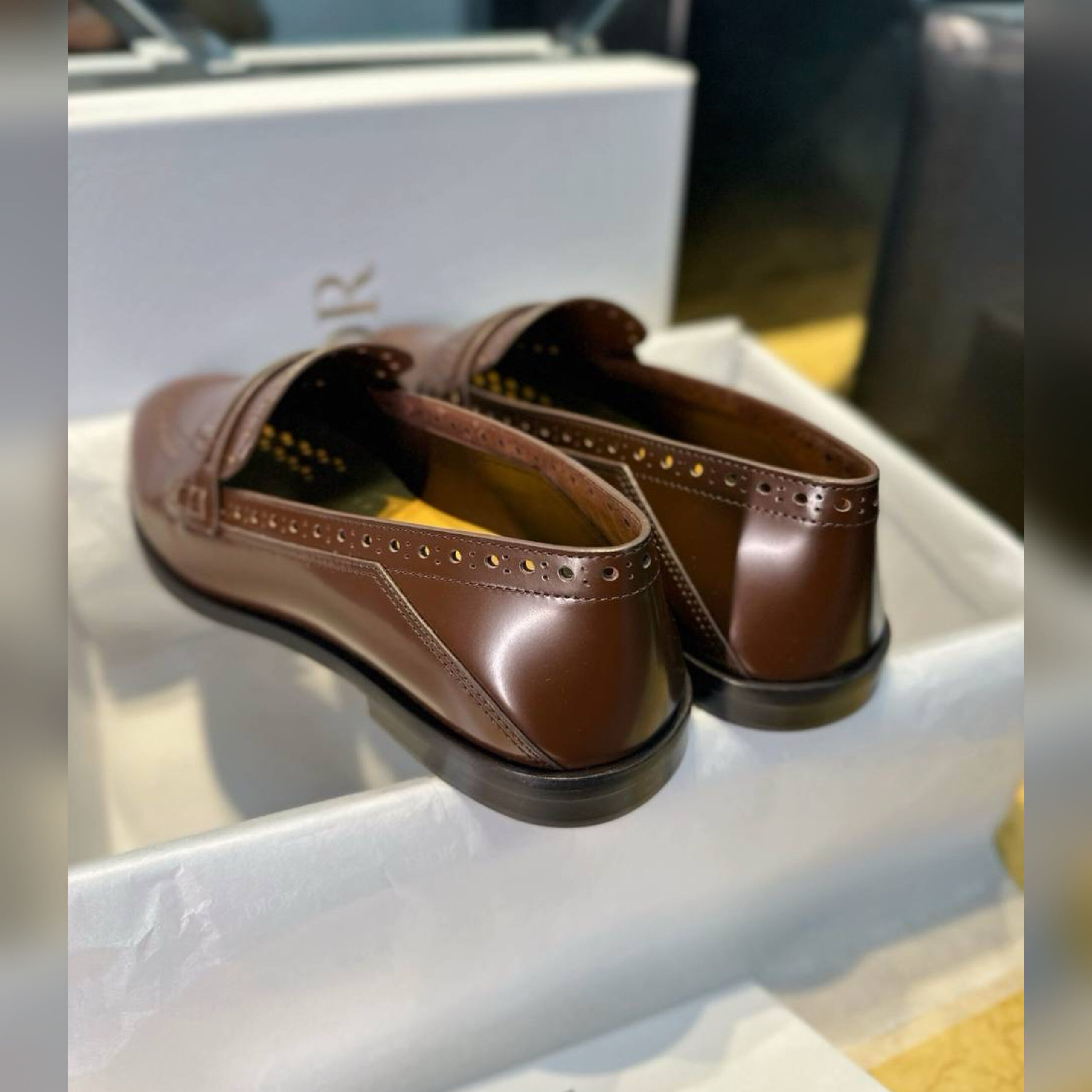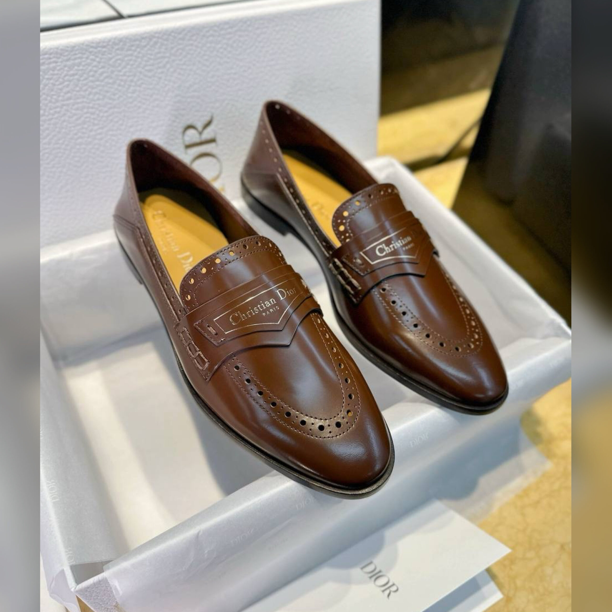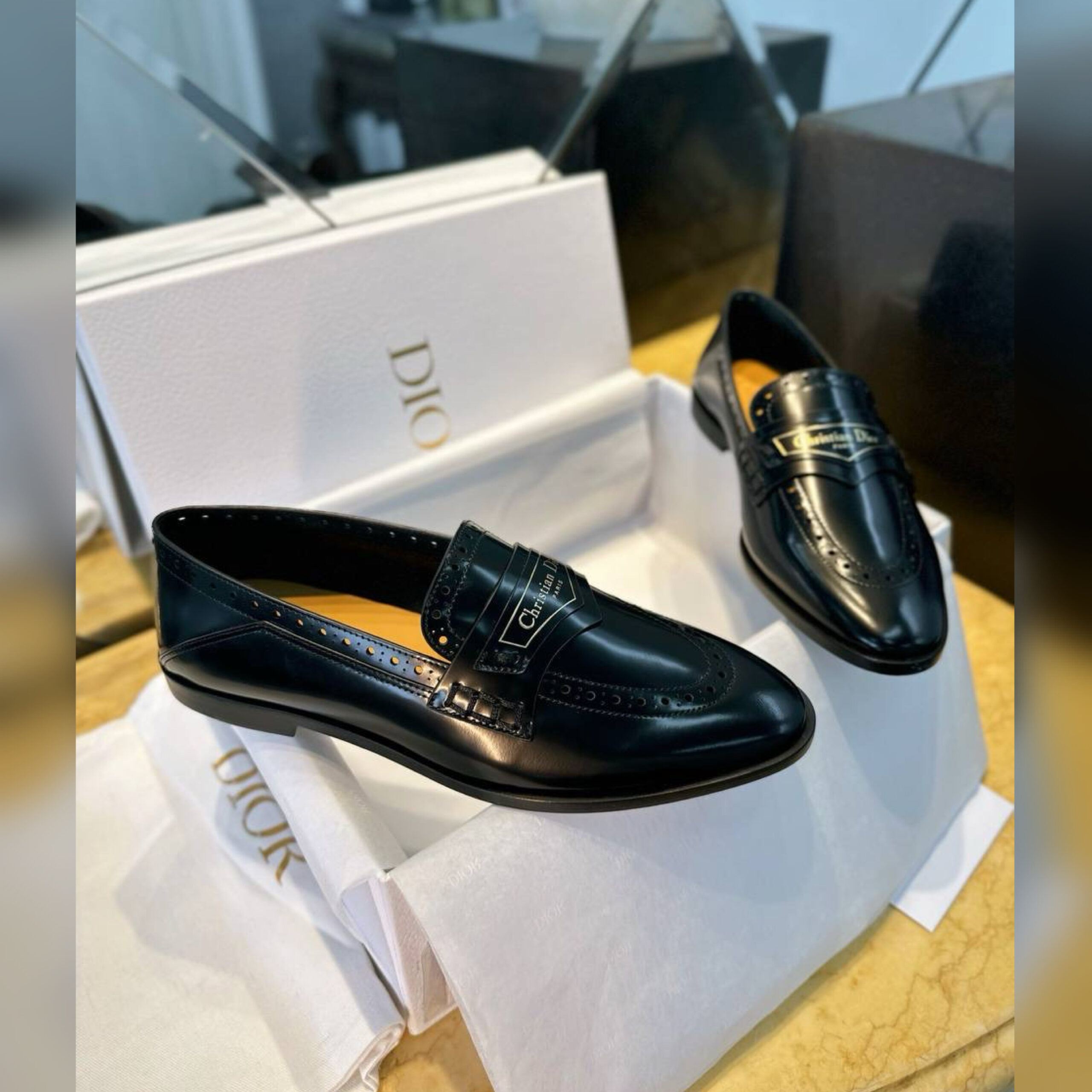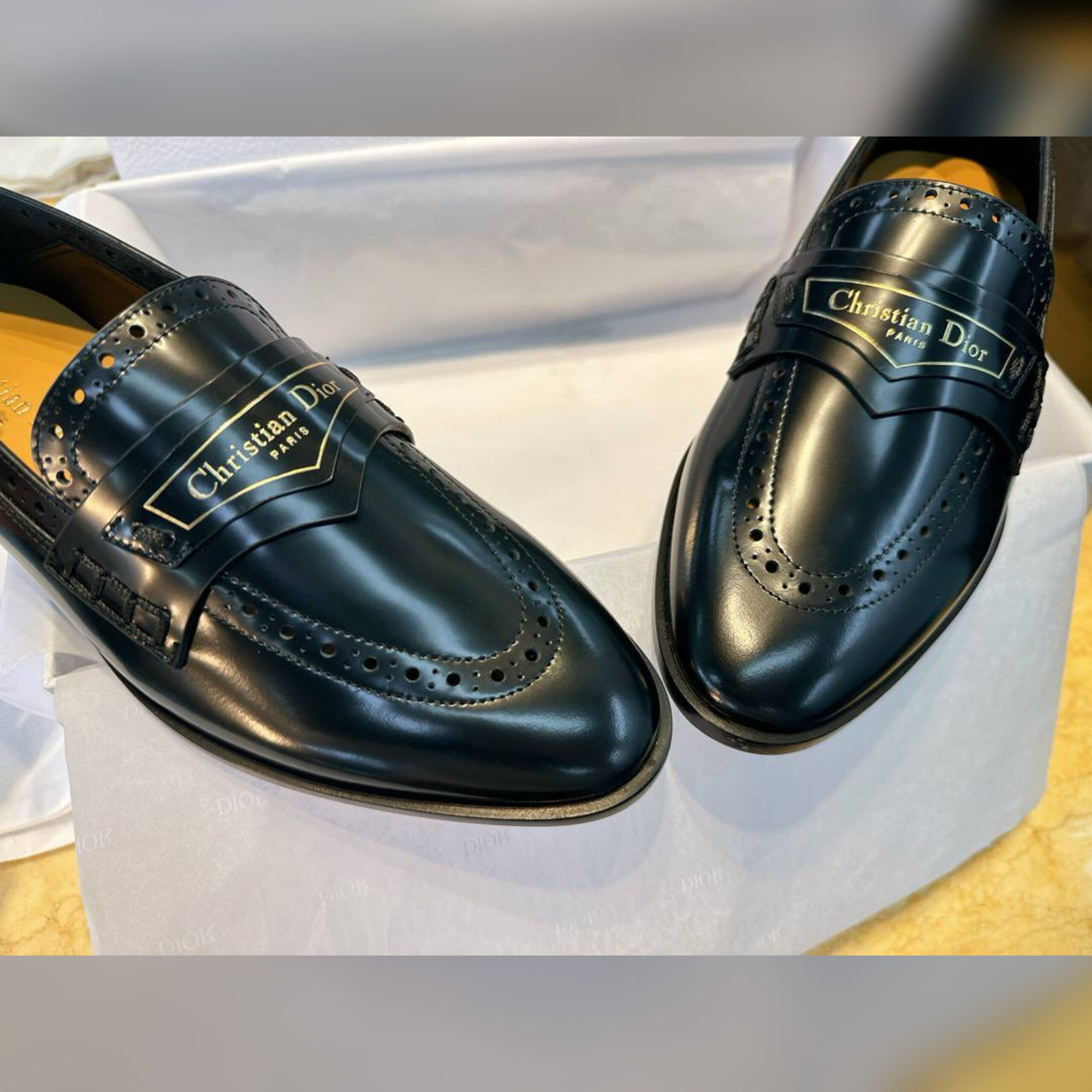 Верх из телячьей кожи имеет перфорированные детали, а союзка модели подчеркнута золотой подписью Christian Dior Paris на кожаной вставке спереди.