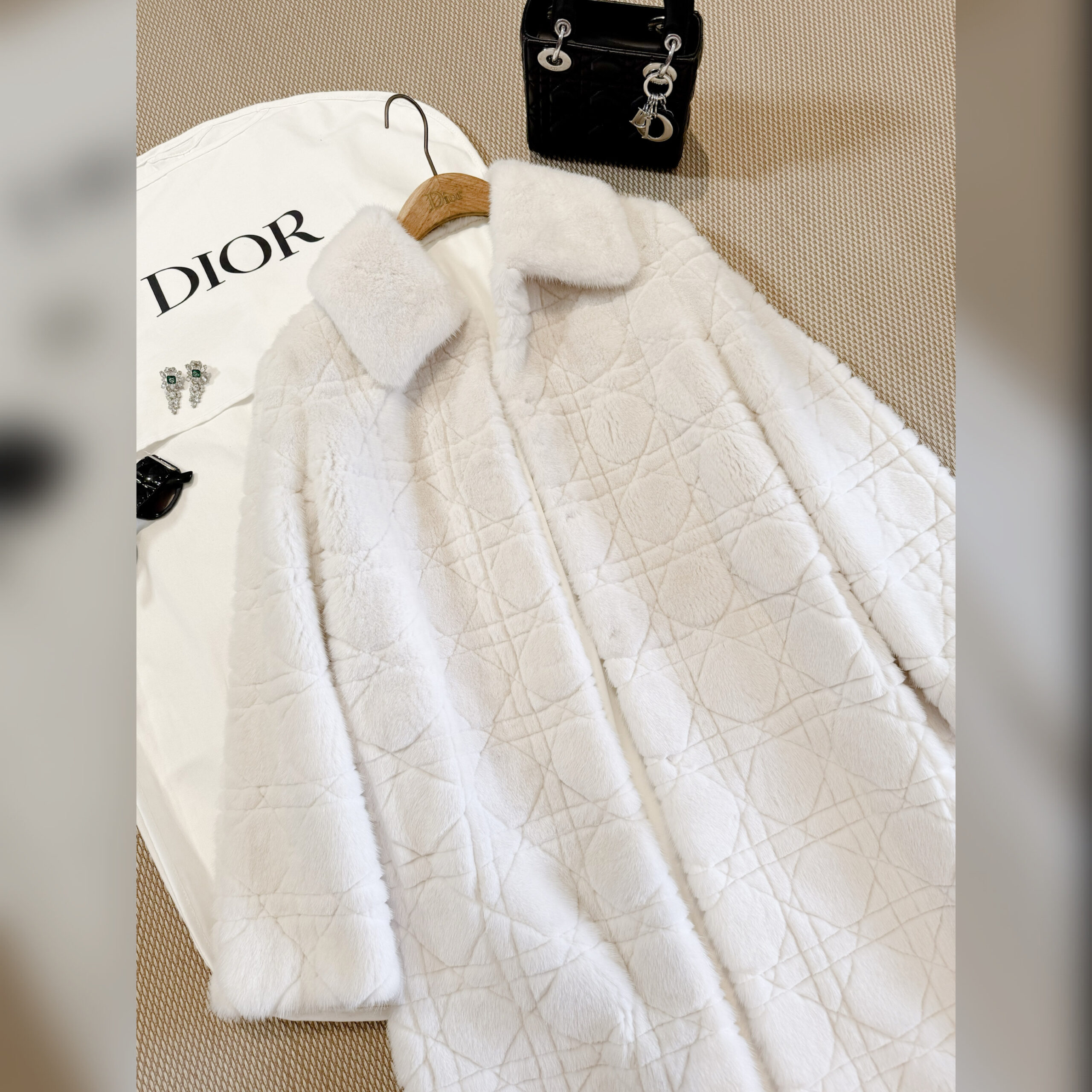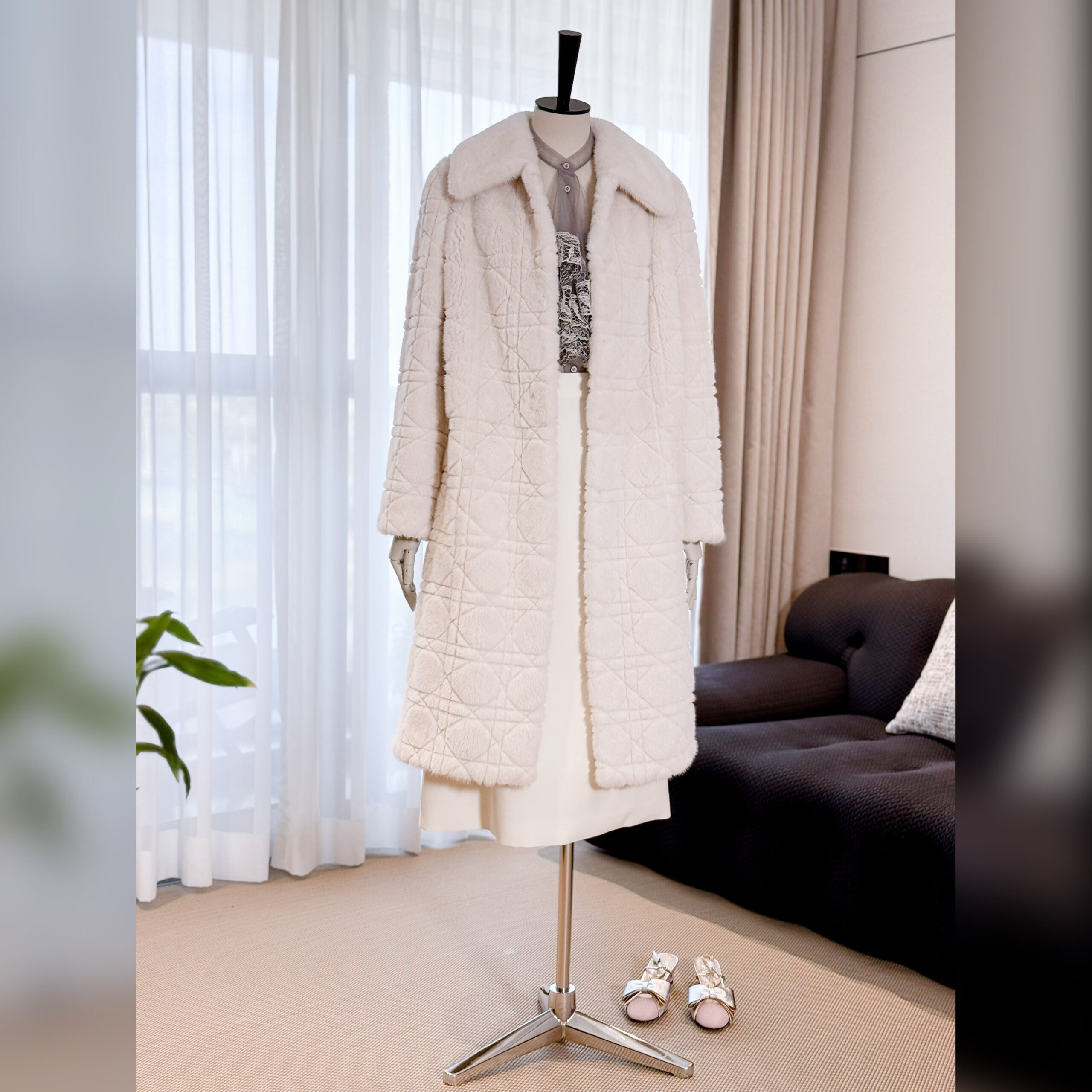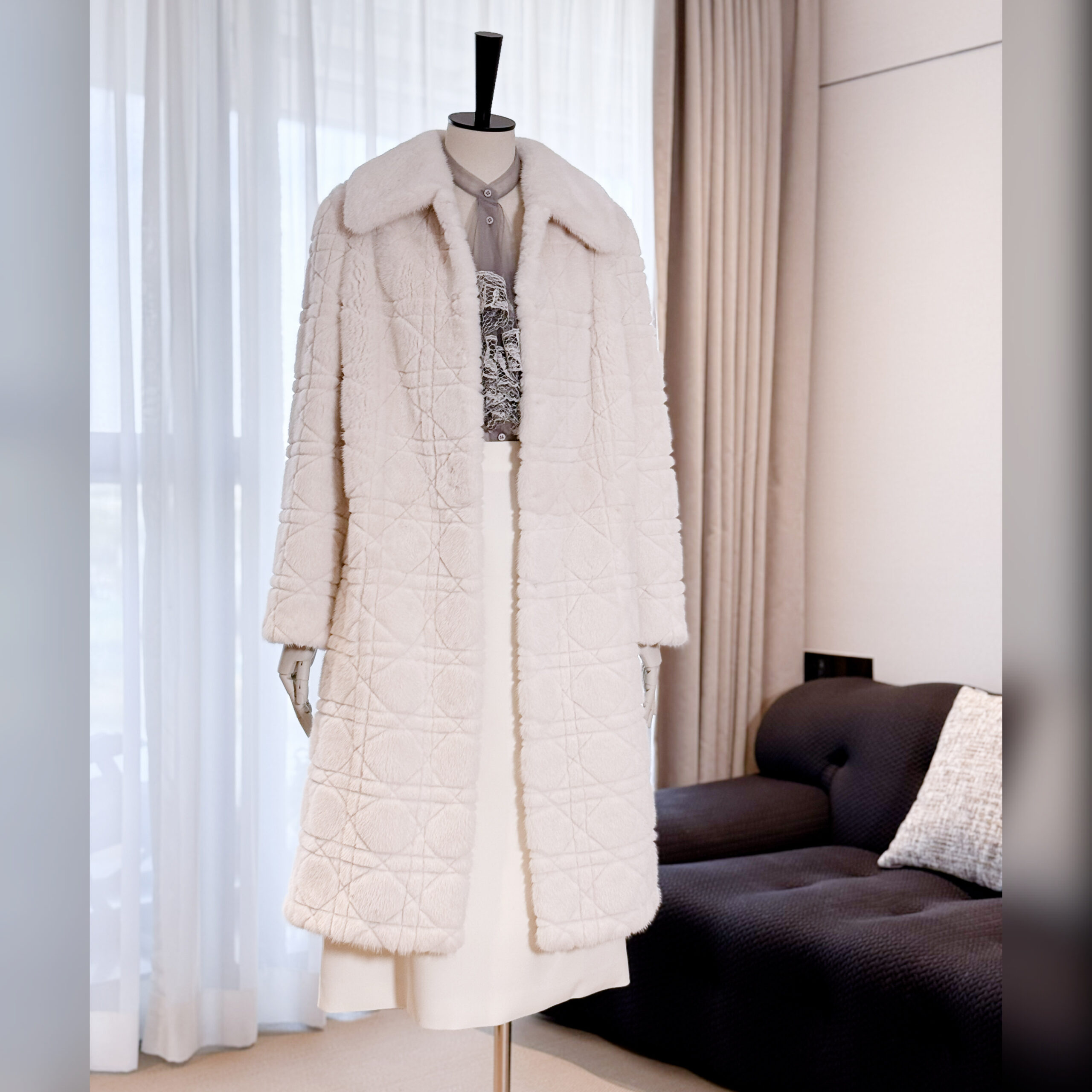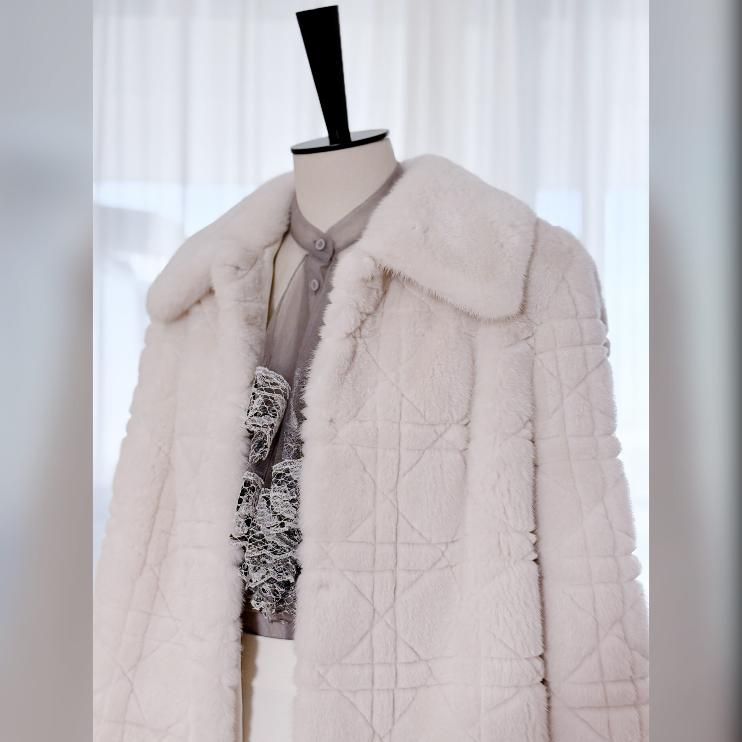 Длинная шуба с широким отложным воротником и двумя врезными карманами сшита из шелковистого меха норки. Модель украшена фирменным мотивом Cannage в дань уважения наследию модного дома.