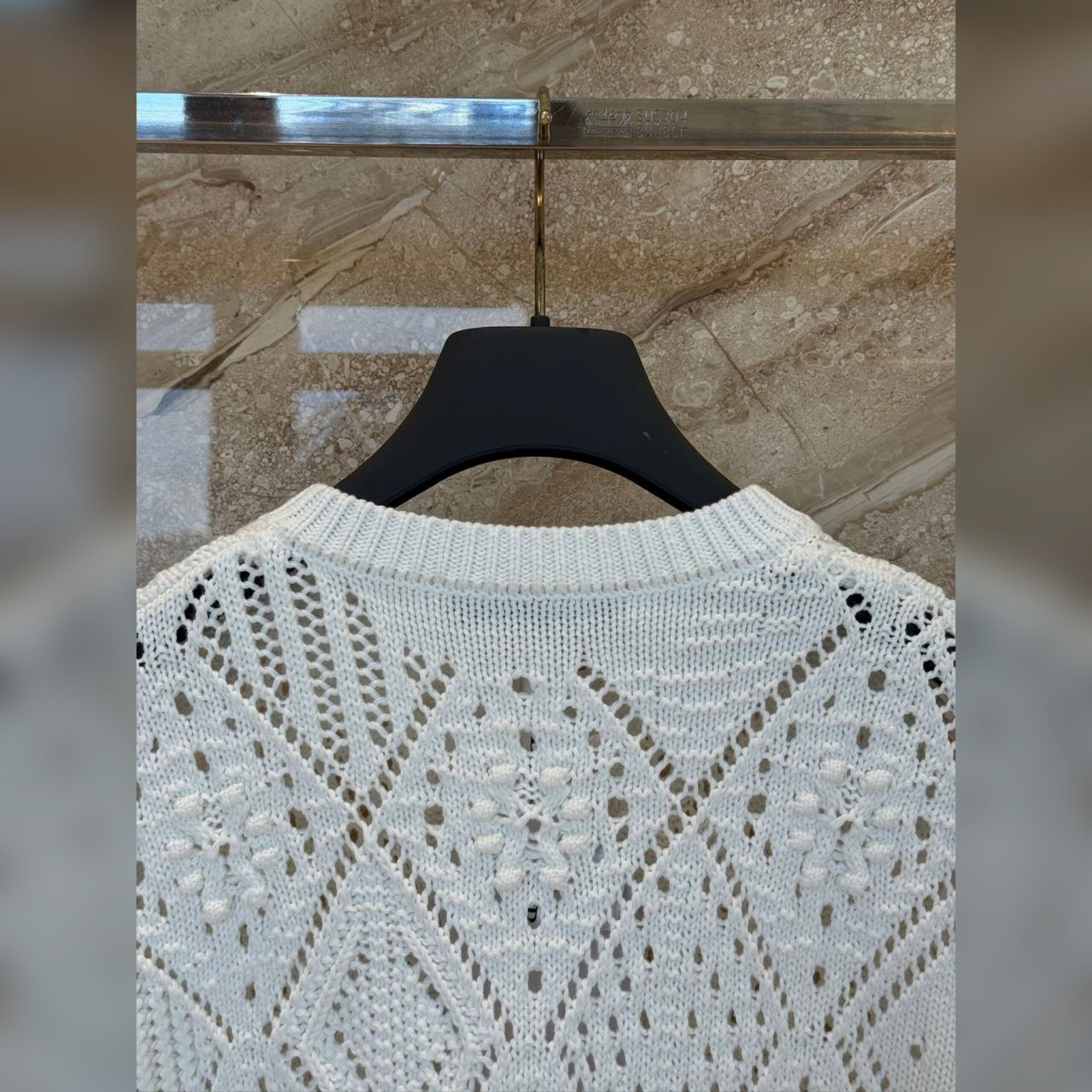 Изделие выполнено из белого ажурного хлопкового трикотажа с эффектом вязания крючком и дополнено пуговицами Dior Tribales— жемчужинами из смолы, вдохновленными культовыми серьгами.
