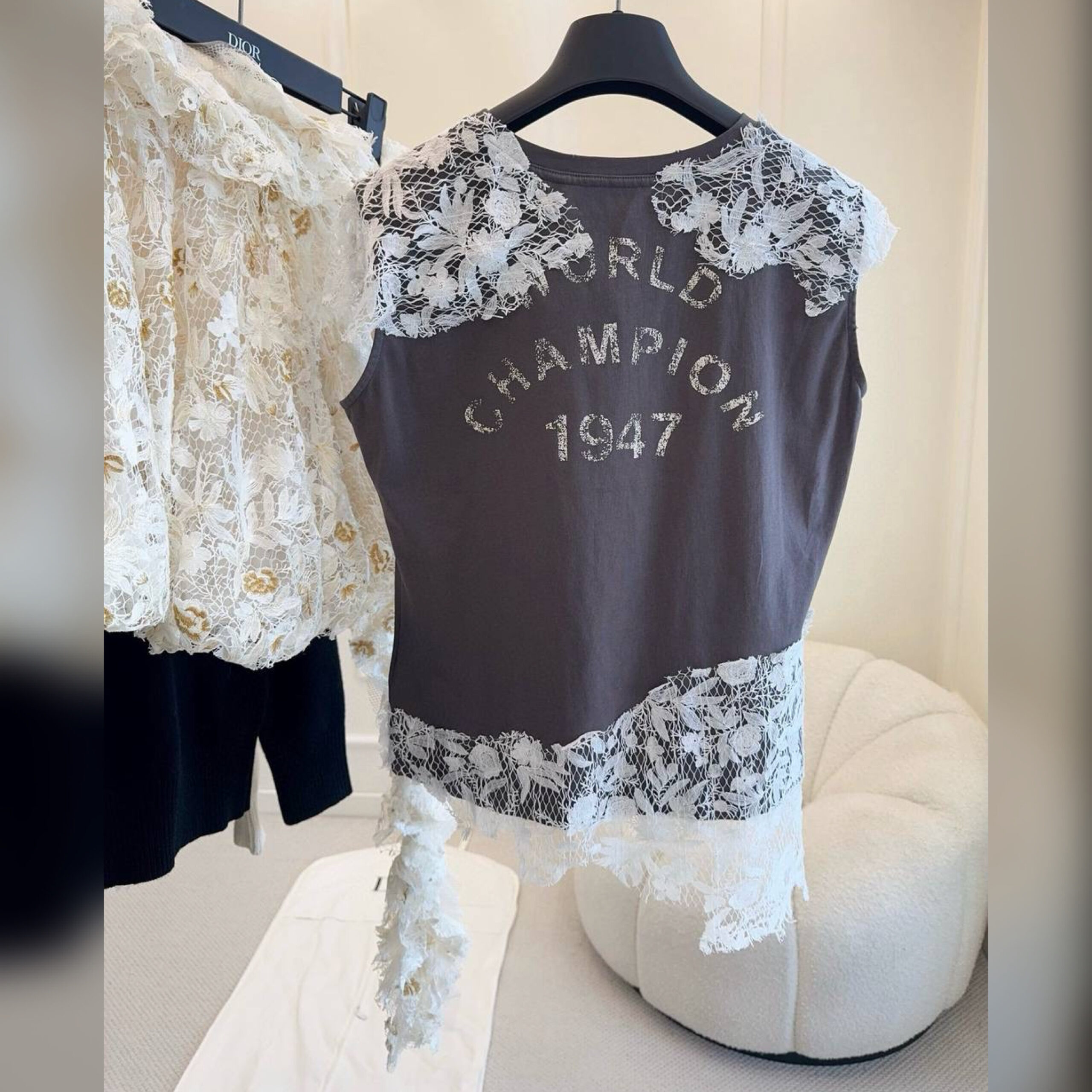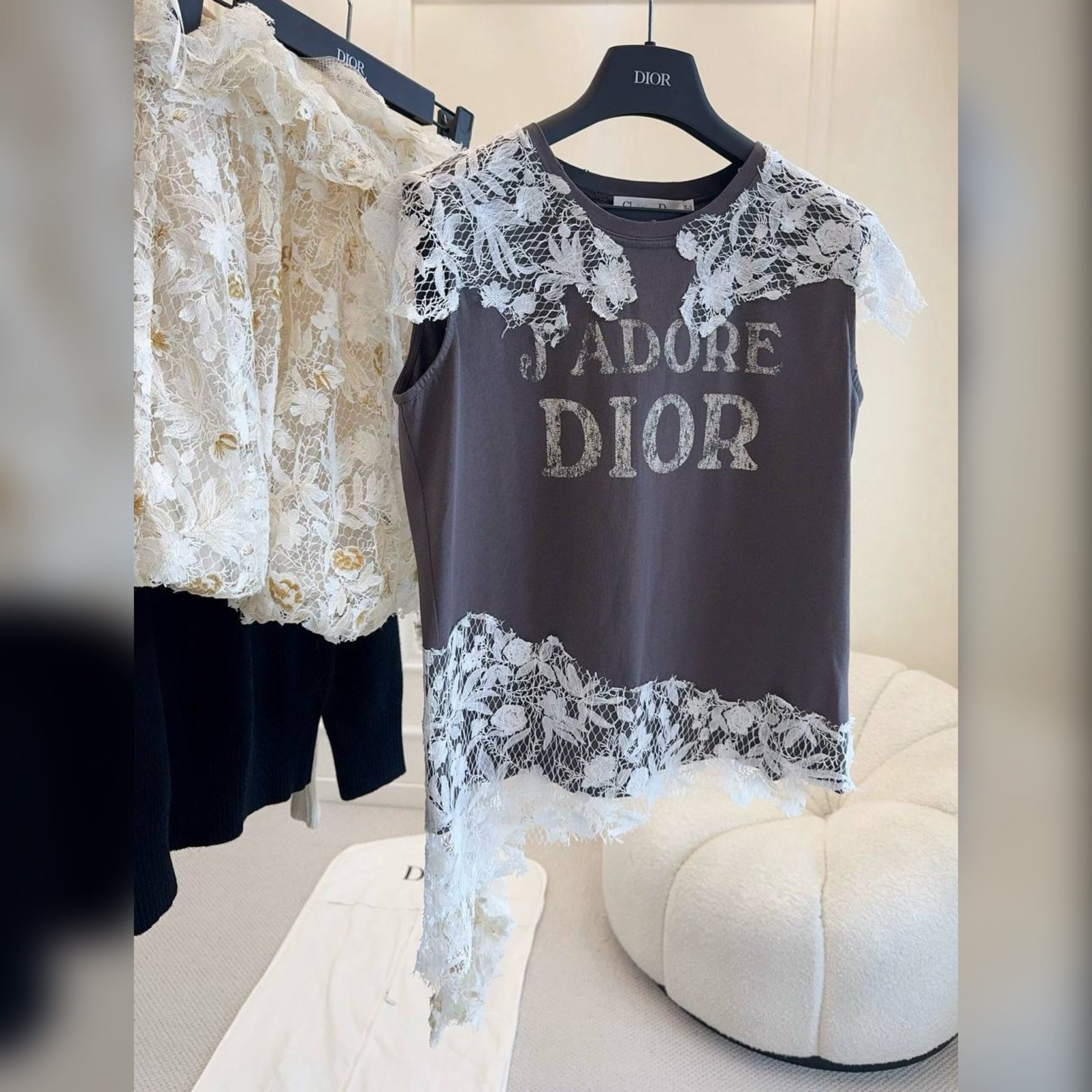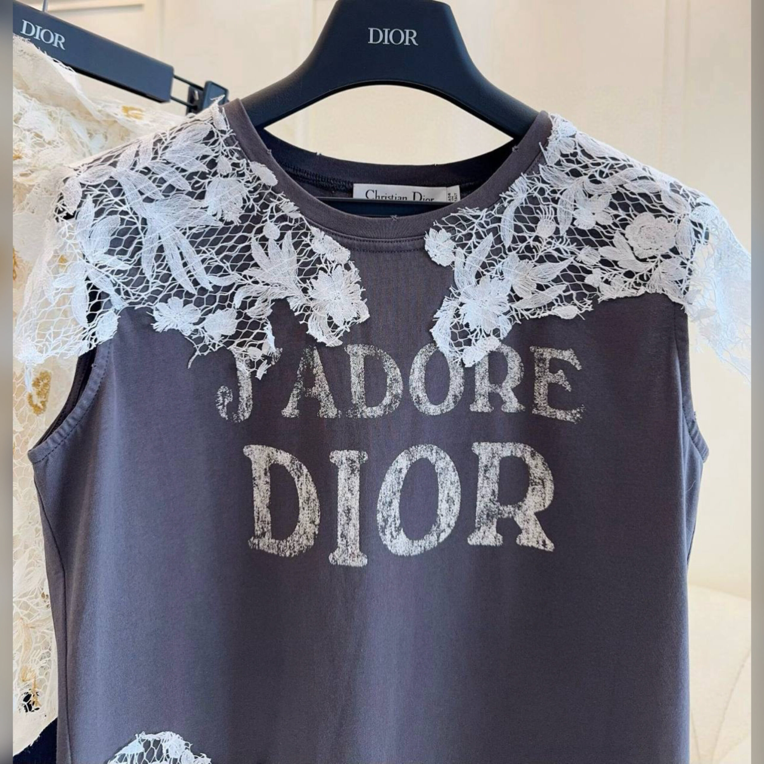 Топ, украшенный надписью J’Adore Dior, изготовлен из хлопкового трикотажа. Модель демонстрирует прямой силуэт, подчеркнутый кружевной отделкой. Топ дополнит множество образов в любое время года.