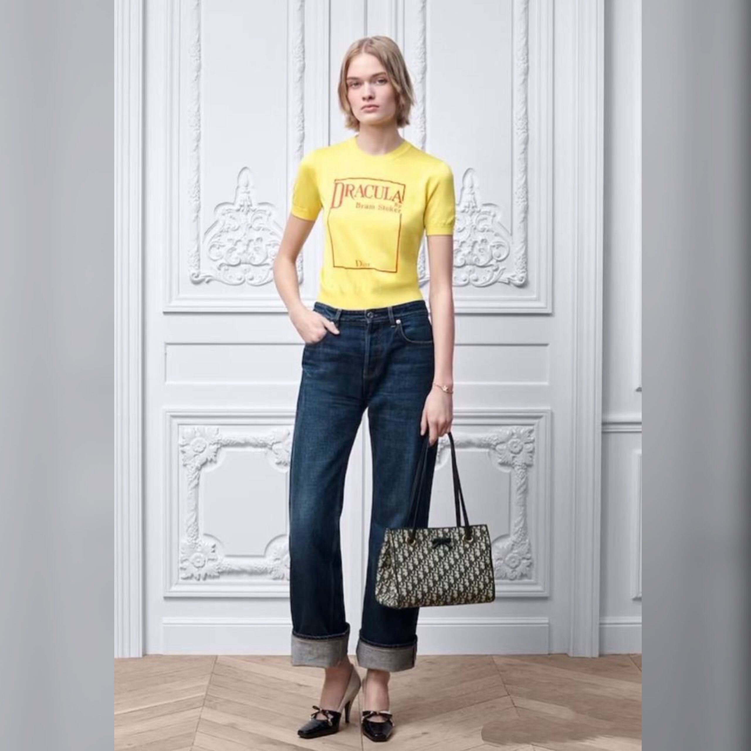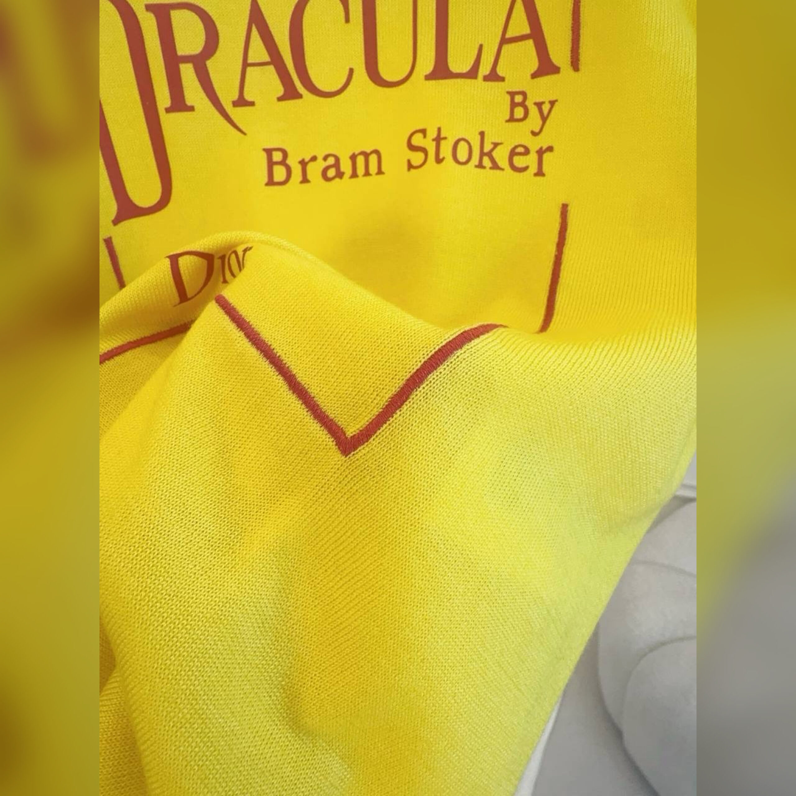 Джемпер с короткими рукавами является частью библиотеки мечты Джонатана Андерсона, демонстрируя обложку первого издания Dracula от Bram Stoker. Изделие из трикотажа на основе шелка имеет укороченный силуэт, дополненный ребристой отделкой. Модель впишется во множество образов в течение всего года.