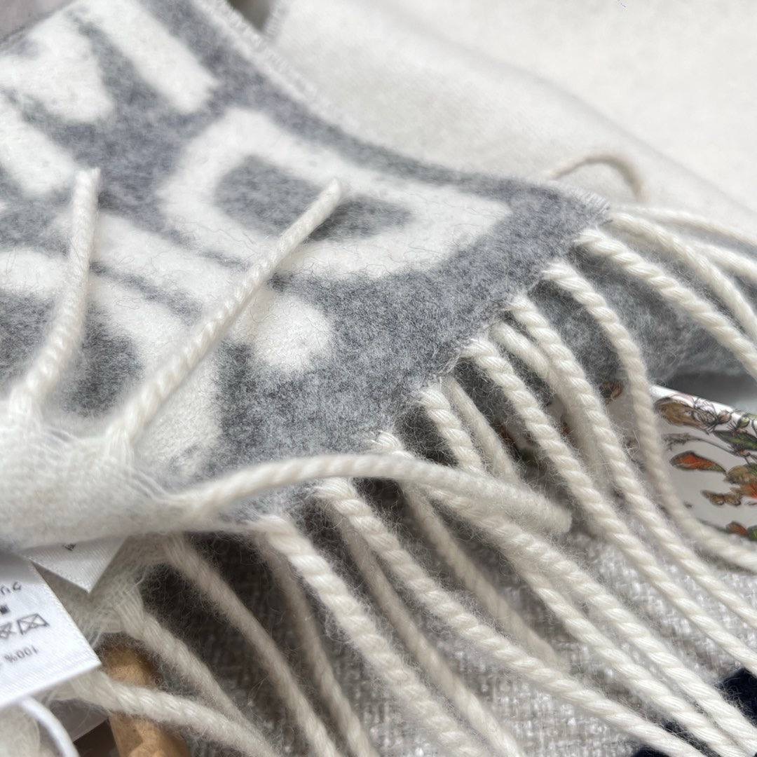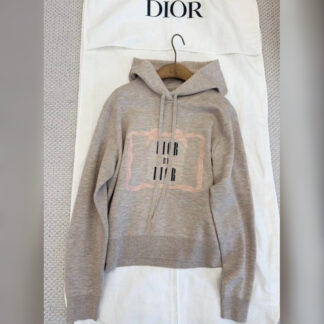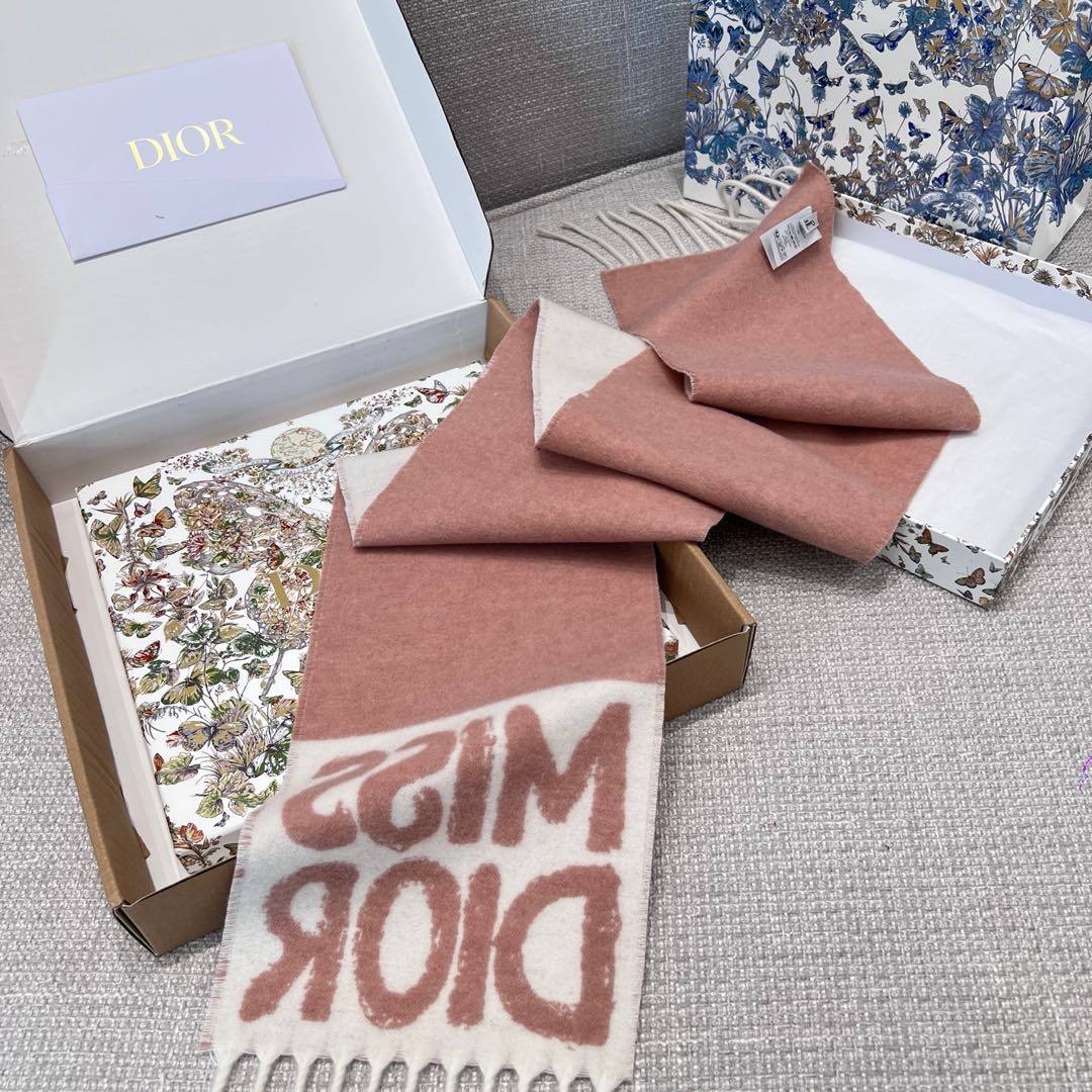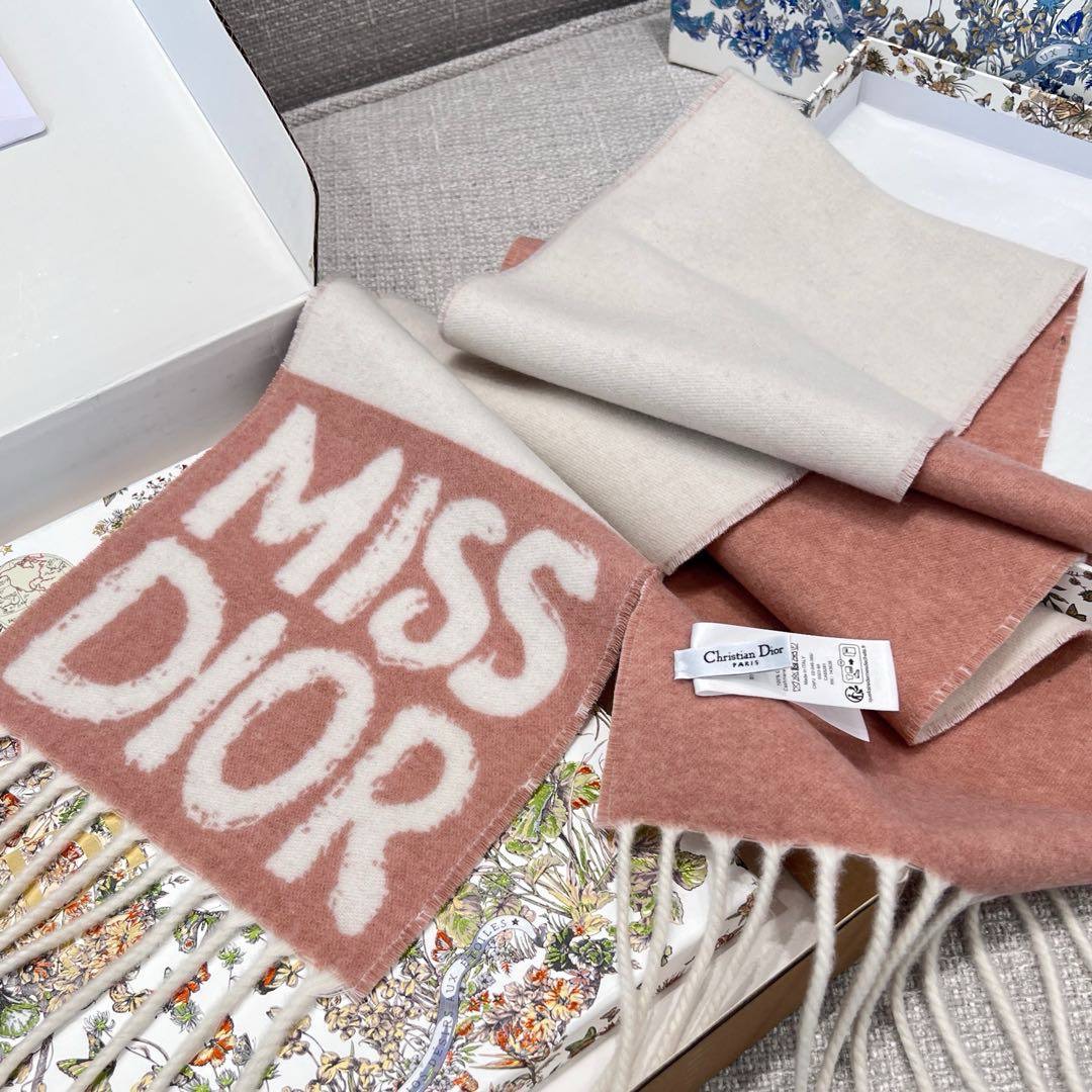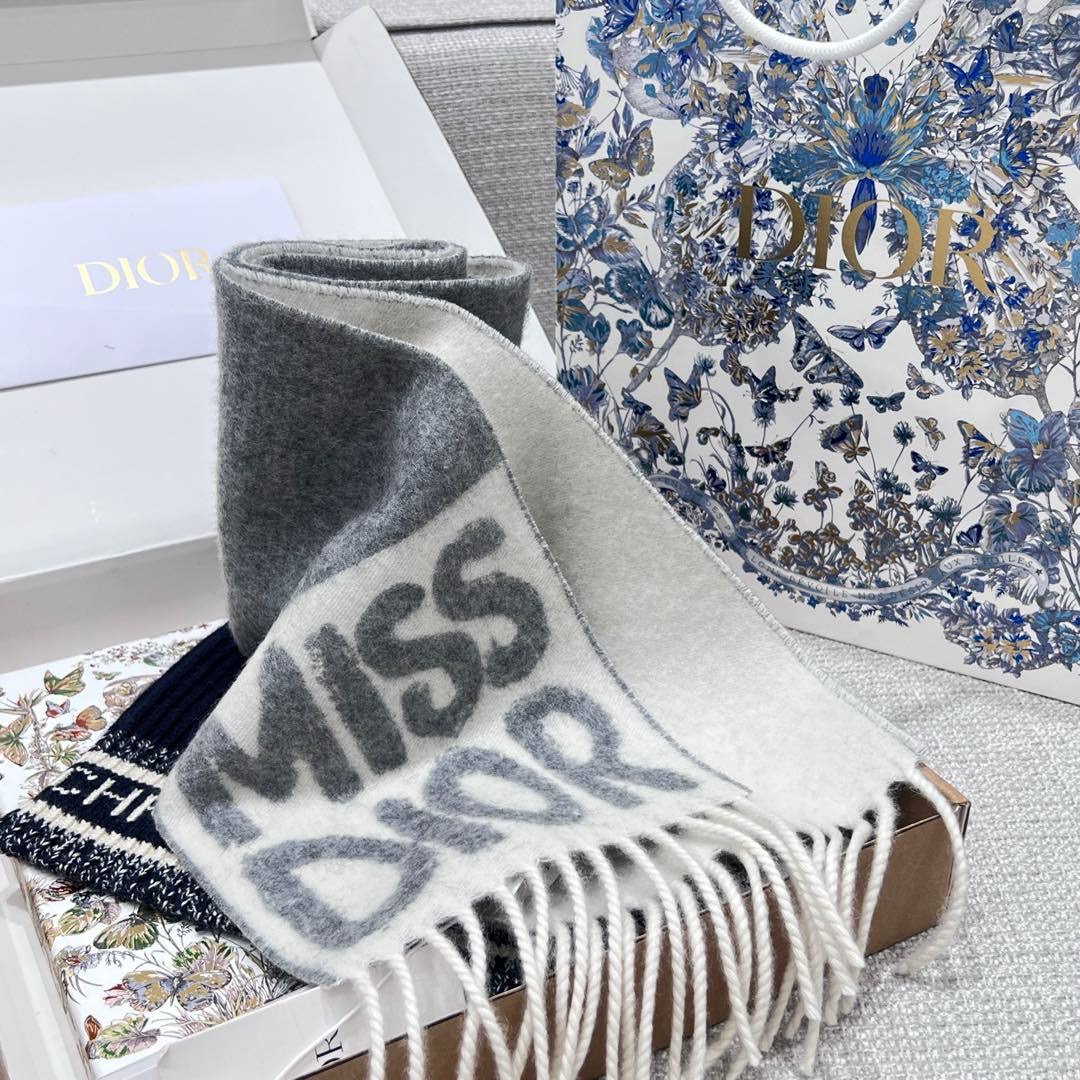 Шапка украшена контрастными полосками, подчеркивающими надпись «Christian Dior» заглавными буквами, а шарф— подписью Miss Dior graffiti и длинной бахромой.