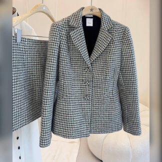 Изготовленная из легкой шерсти и мохера модель имеет расклешенный крой с застежкой на пуговицы спереди. Изделие демонстрирует офицерский воротник, украшенный вышитыми пчелами, карманы с клапанами, подчеркивающие талию, и манжеты с элегантными черно-белыми полосами.