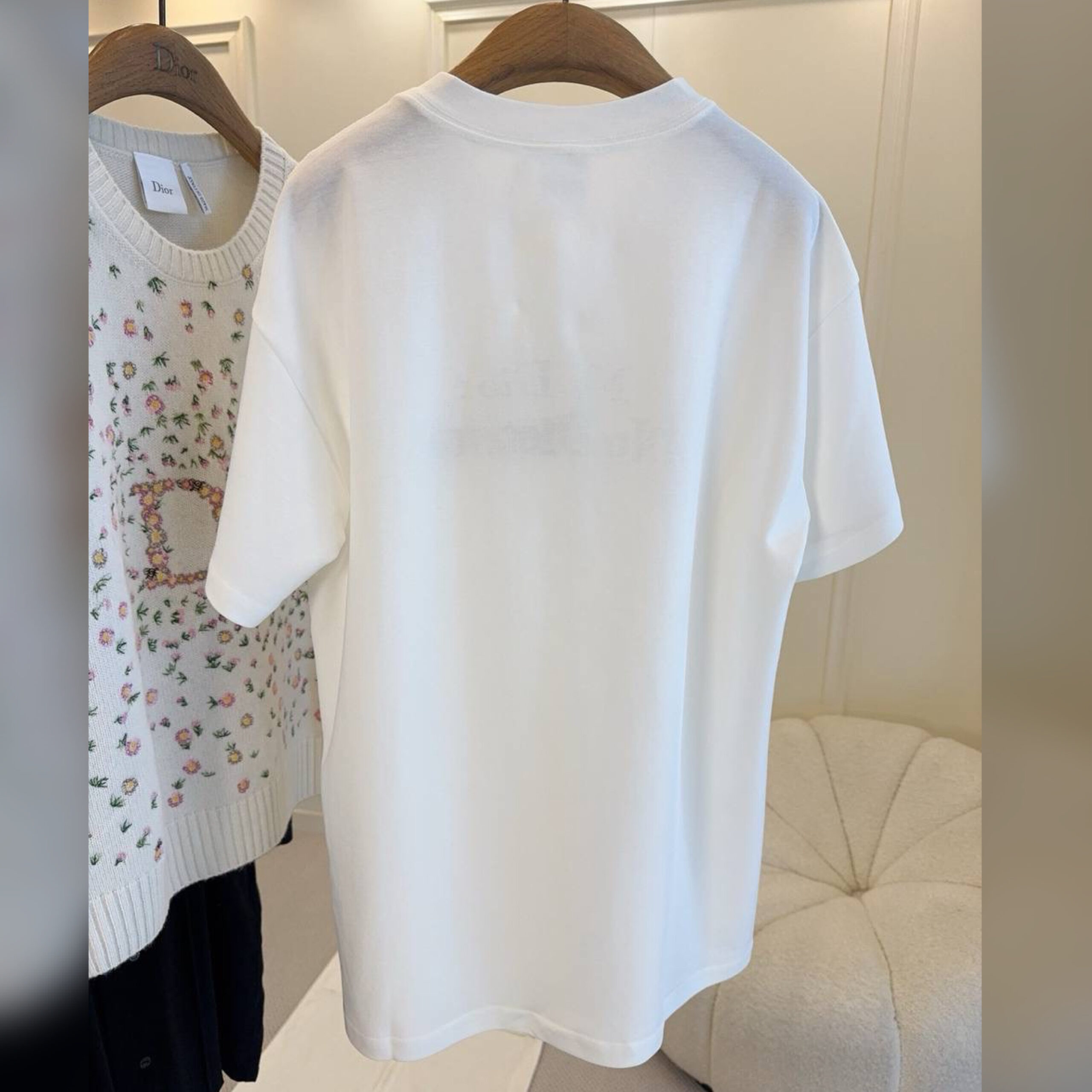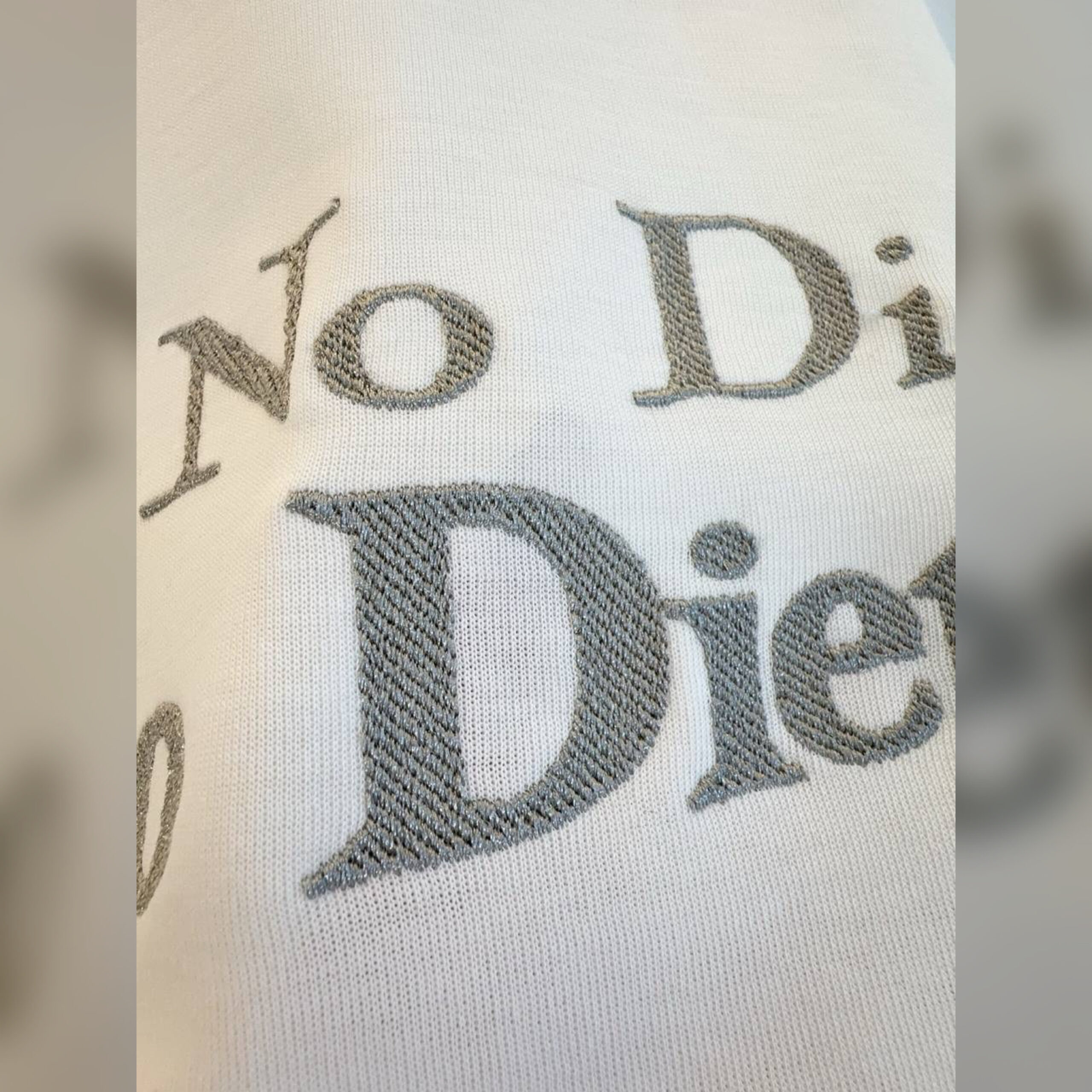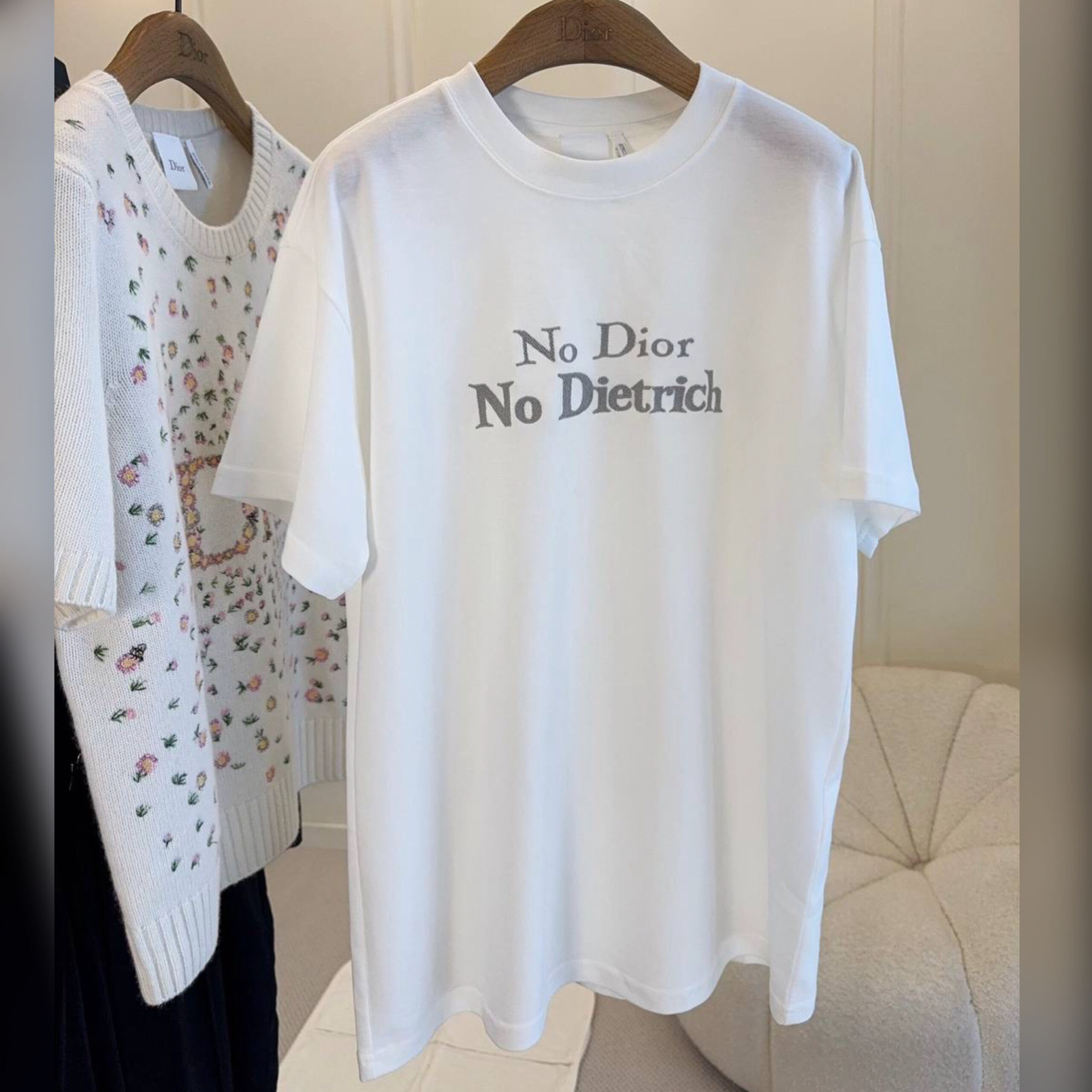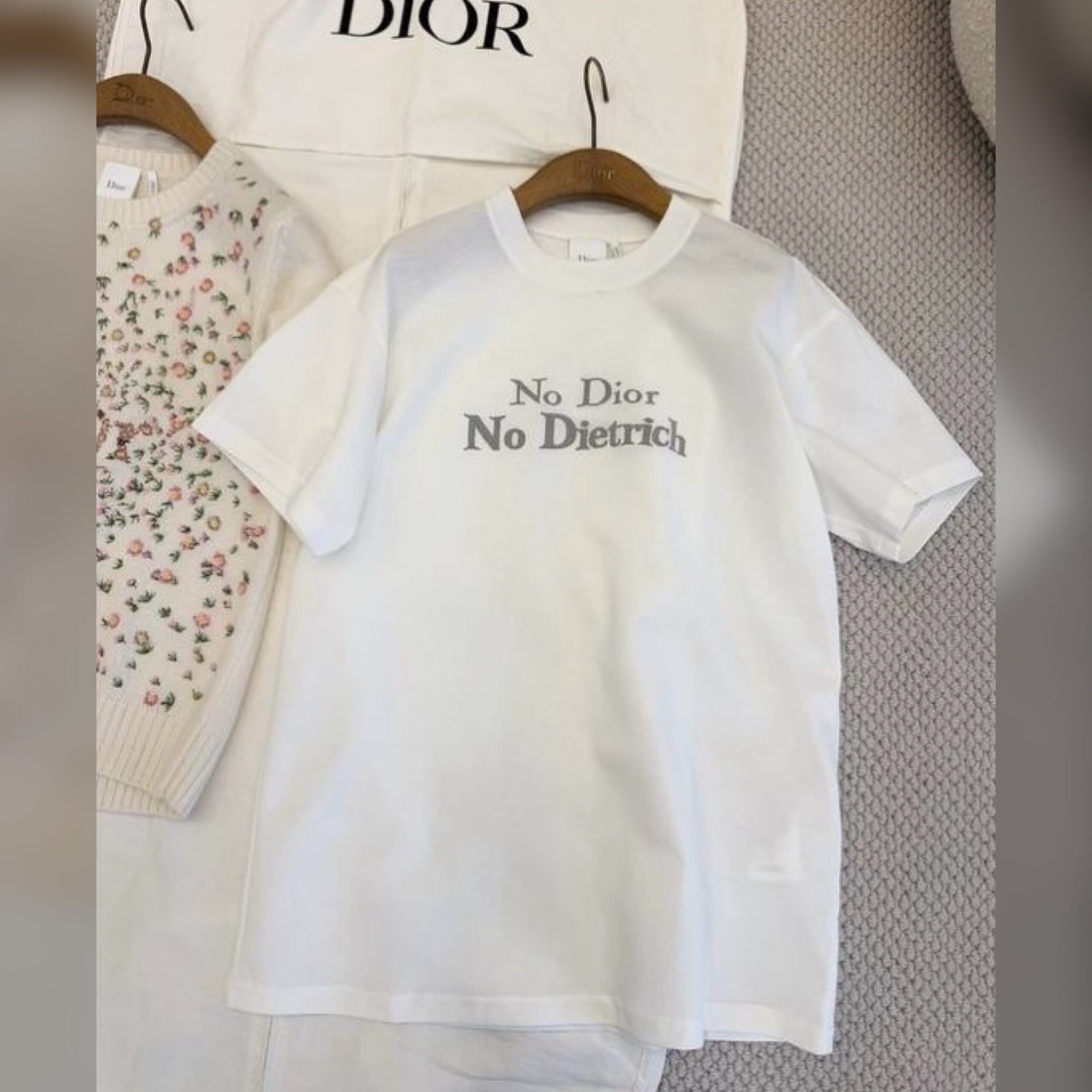 Манифест первой коллекции Джонатана Андерсона, футболка демонстрирует знаменитый ультиматум Марлен Дитрих Альфреду Хичкоку: «Нет Диор, нет Дитрих». Изготовленная из белого хлопкового трикотажа модель будет сочетаться с любым образами в течение года.