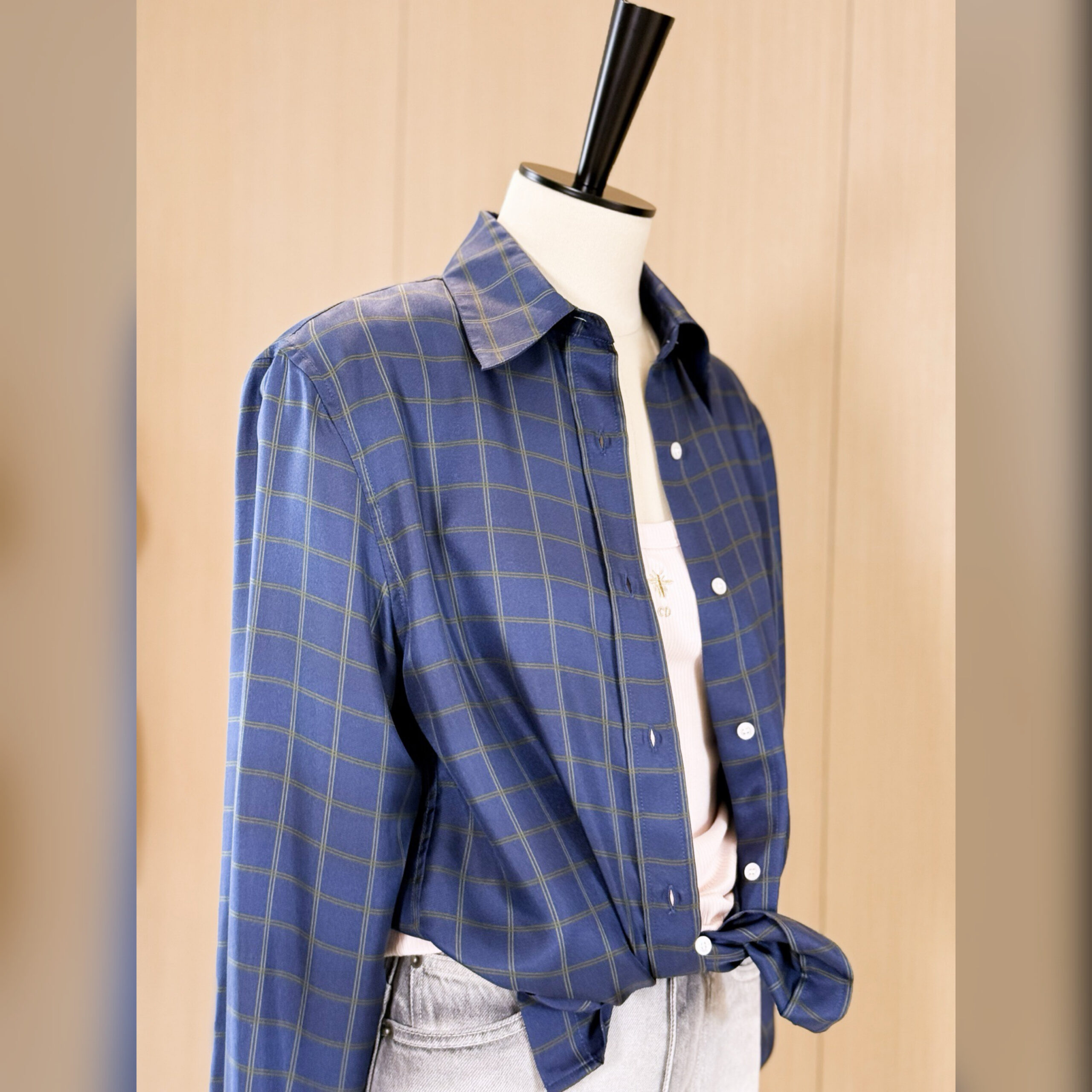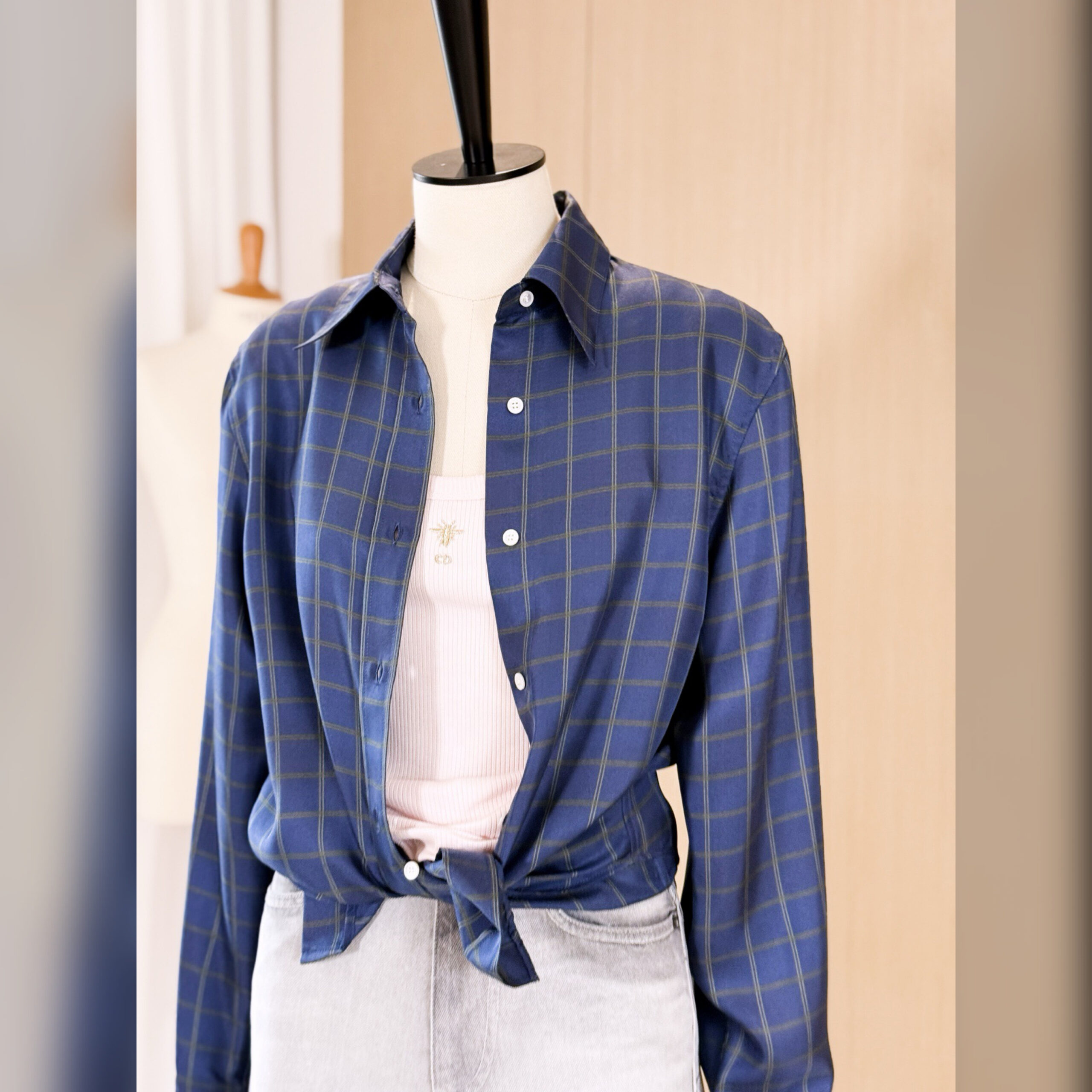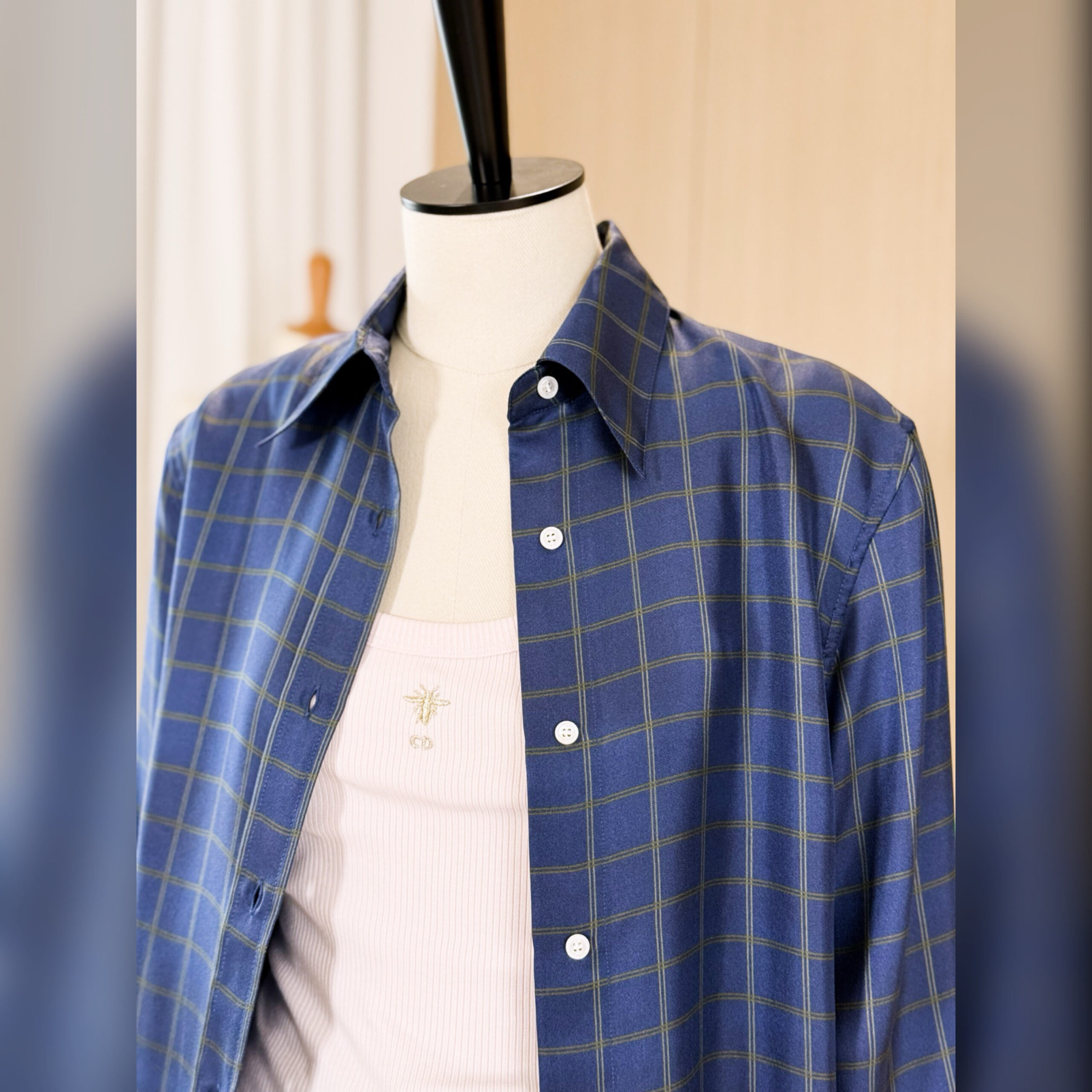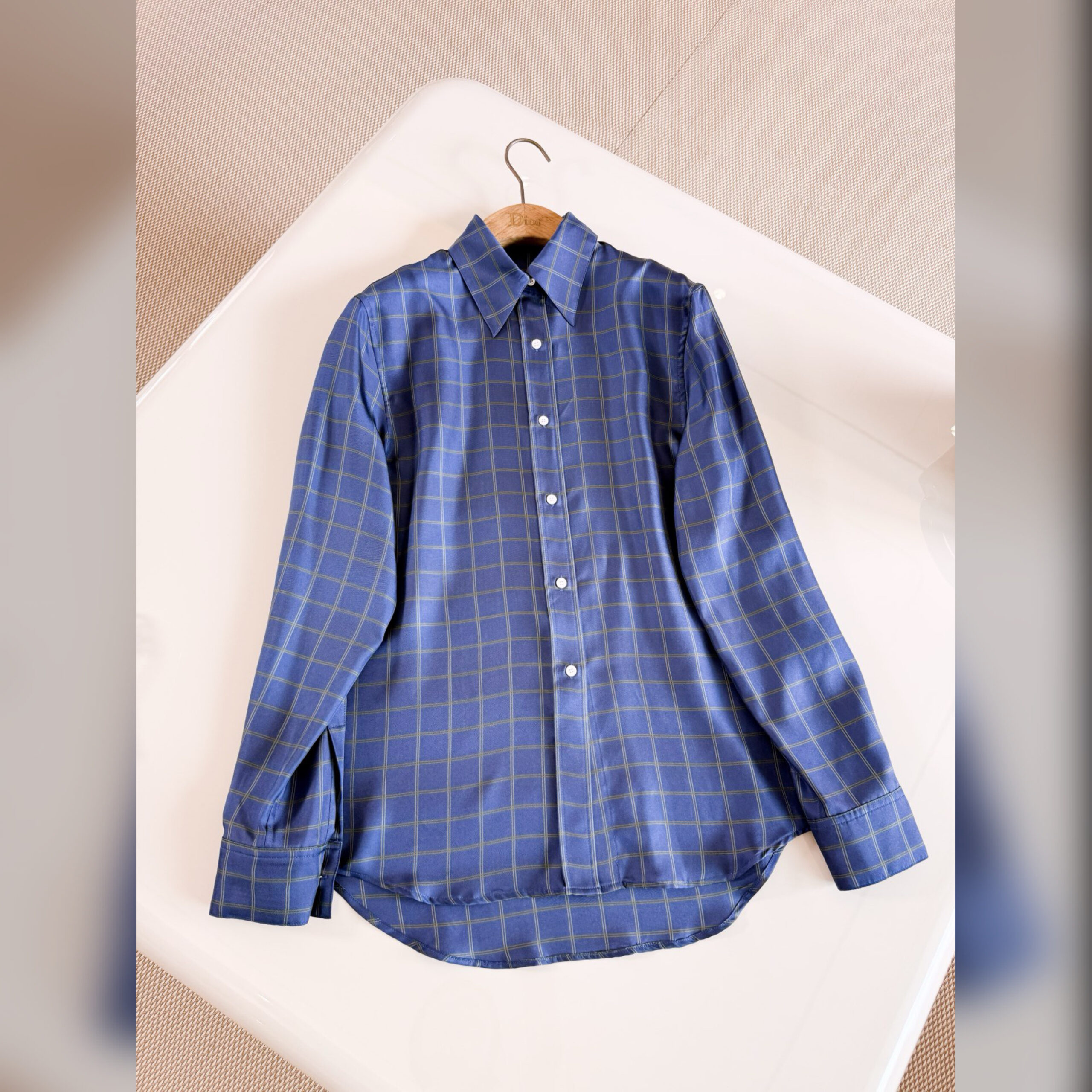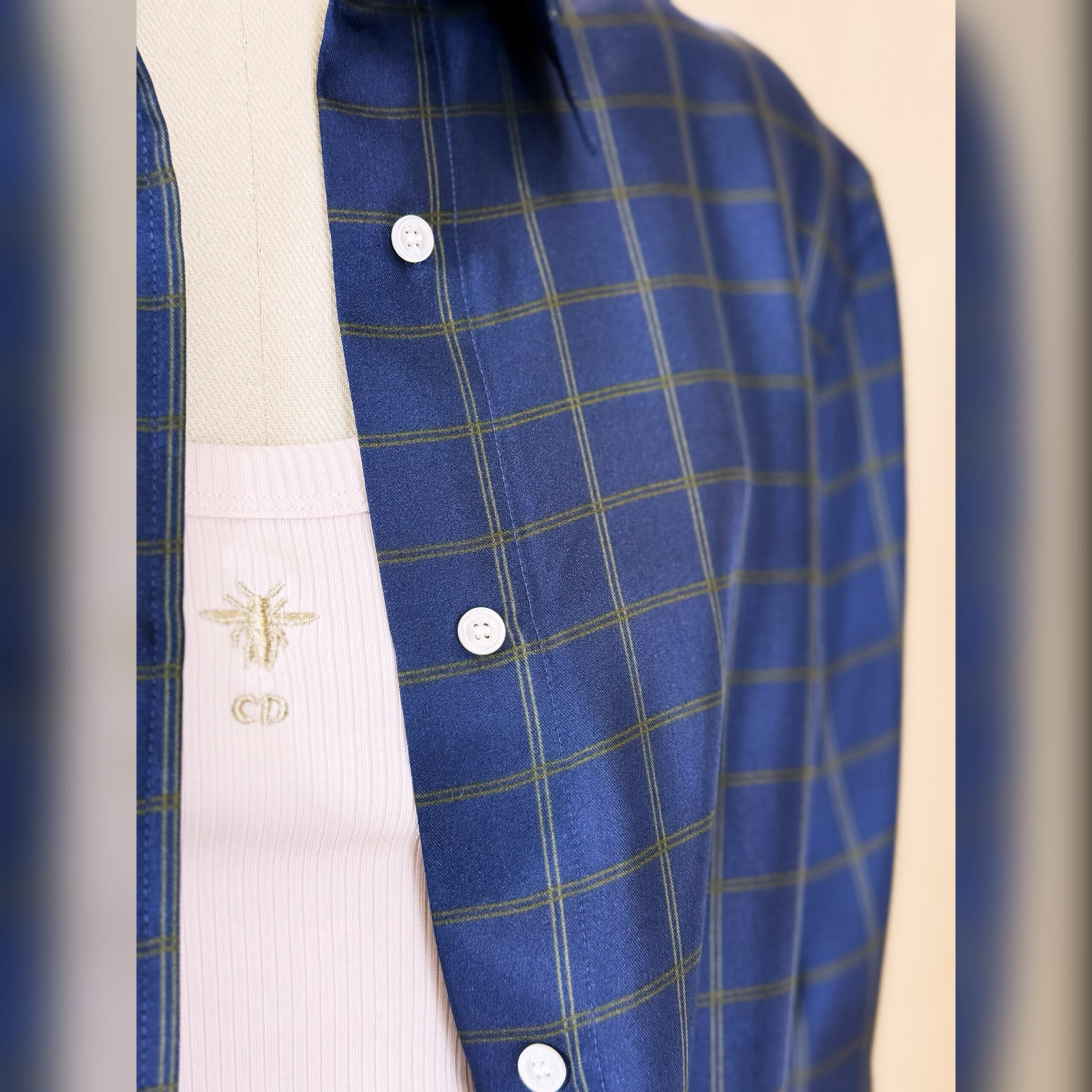 Представленная на дебютном показе Джонатана Андерсона, рубашка демонстрирует мотив Check’n’Dior, вдохновленный британскими традициями, переосмысленный в современном элегантном ключе. Изготовленная из темно-синего шелкового саржа модель имеет стандартную посадку и длинные рукава. Рубашку можно сочетать с другими творениями Check’n’Dior для создания завершенного образа.