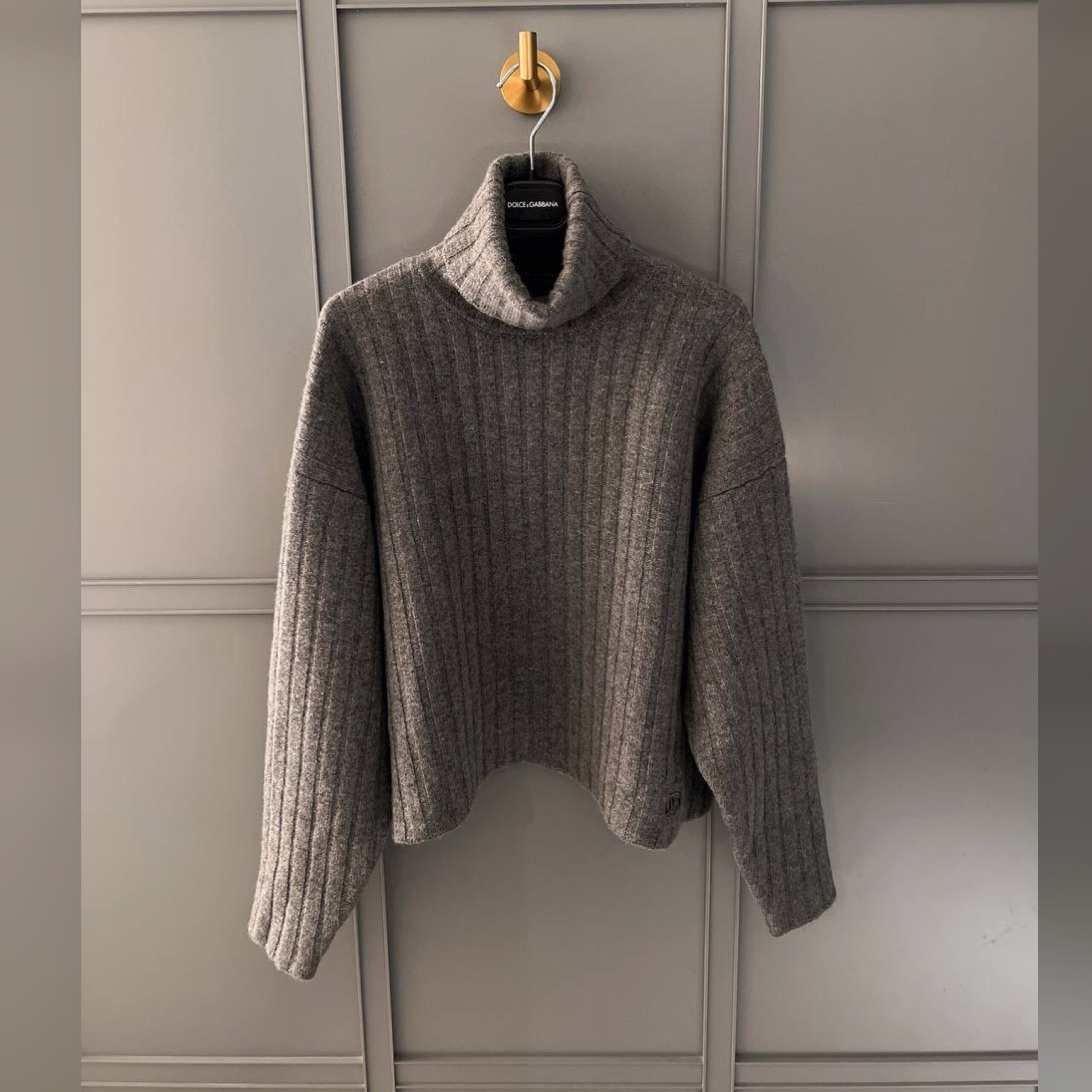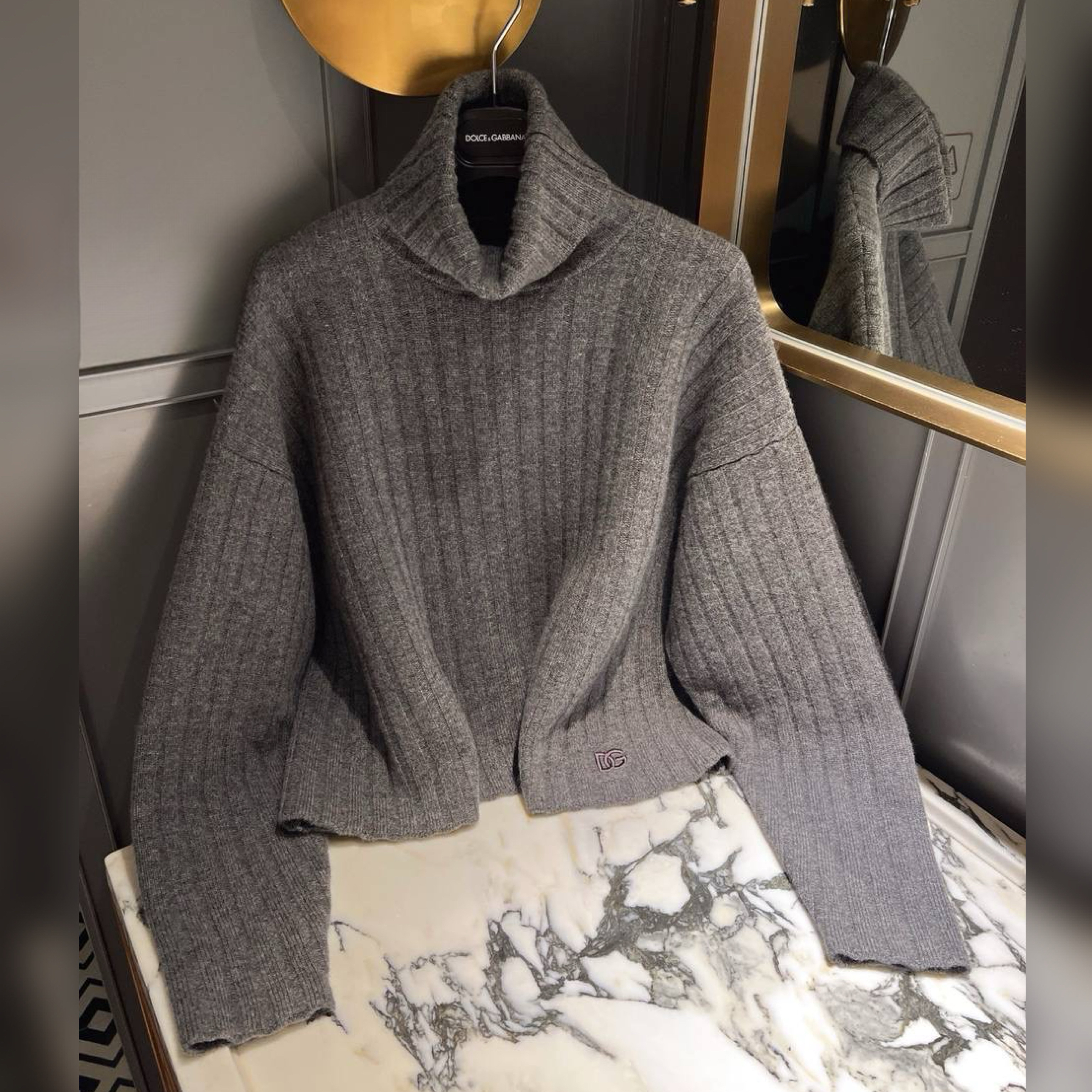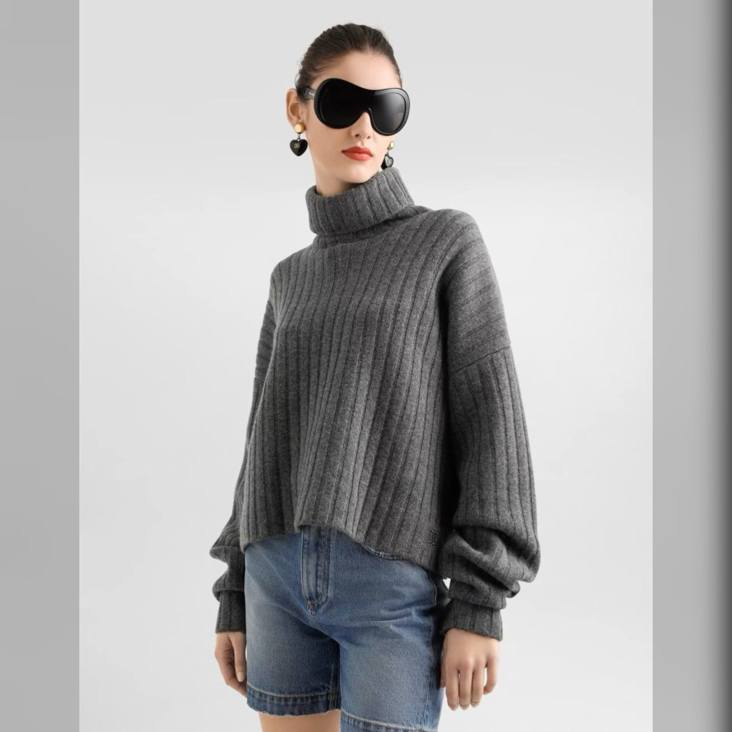 Свитер с рельефным узором связали из нежного кашемира, поэтому в нем будет особенно тепло и комфортно. Модель с высокой горловиной и спущенной линией плеч будет гармонично смотреться в повседневном образе.