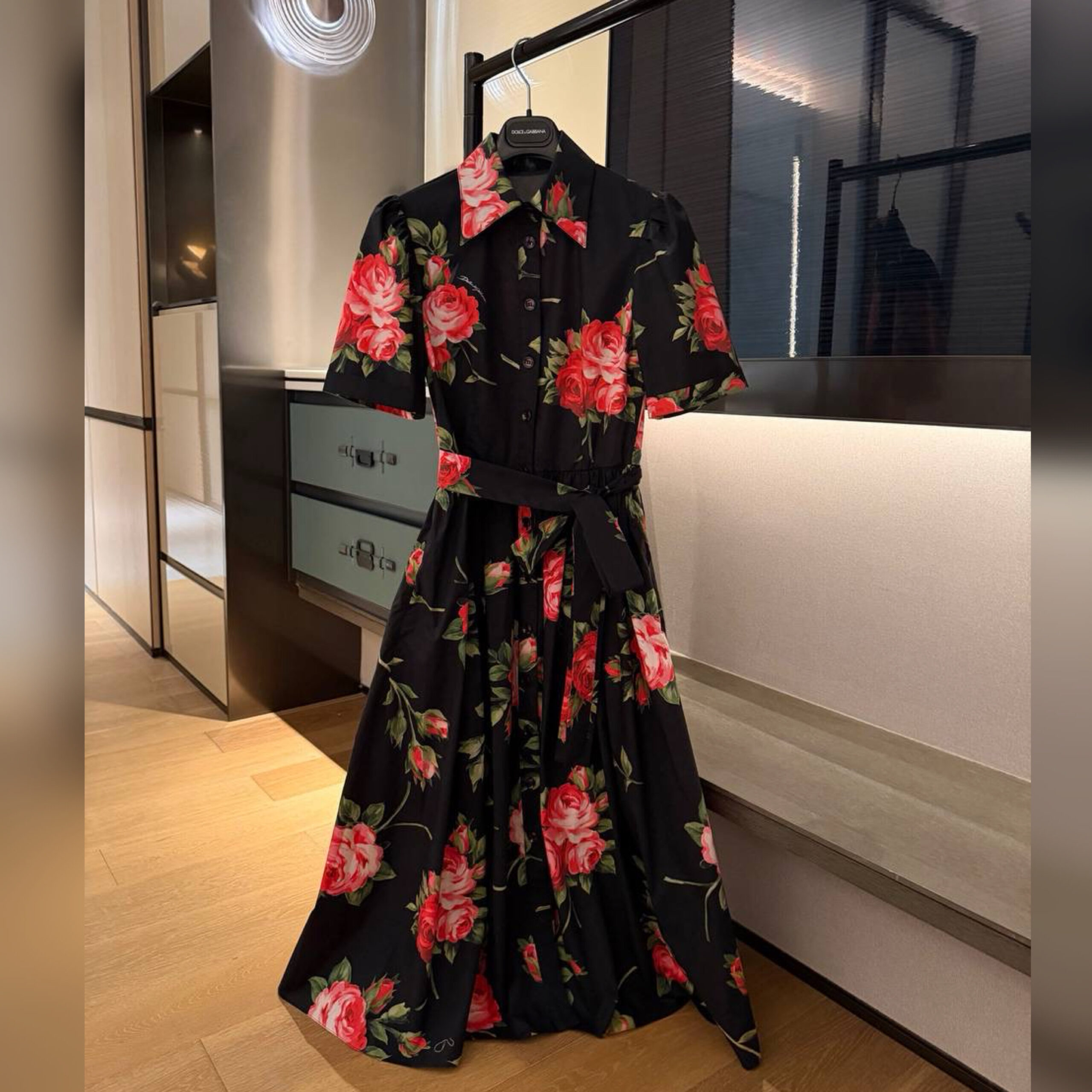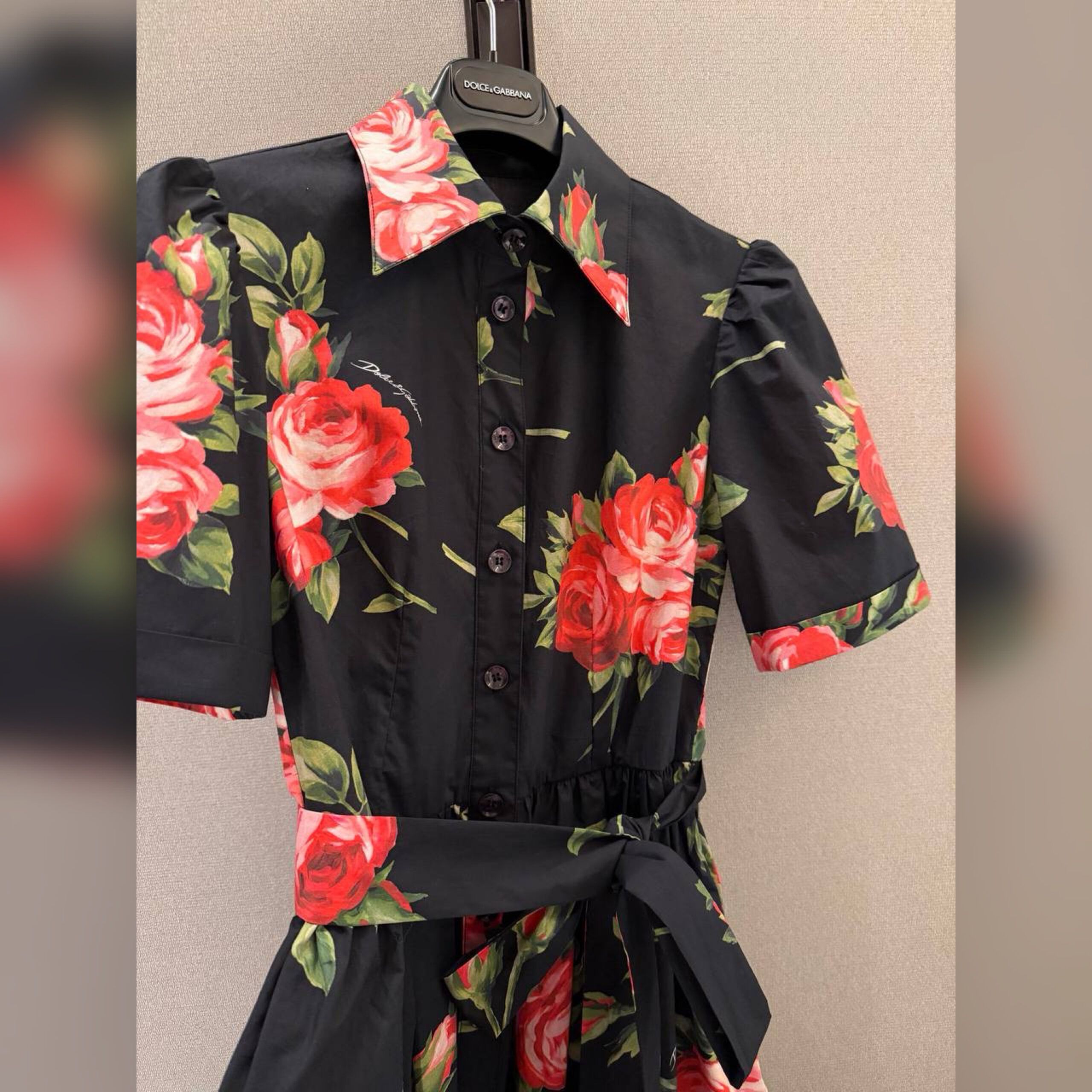Платье-рубашку сшили из хлопкового поплина с фирменным мотивом из роз. Расклешенную модель с рукавами-фонариками дополнили боковыми карманами и длинным поясом.