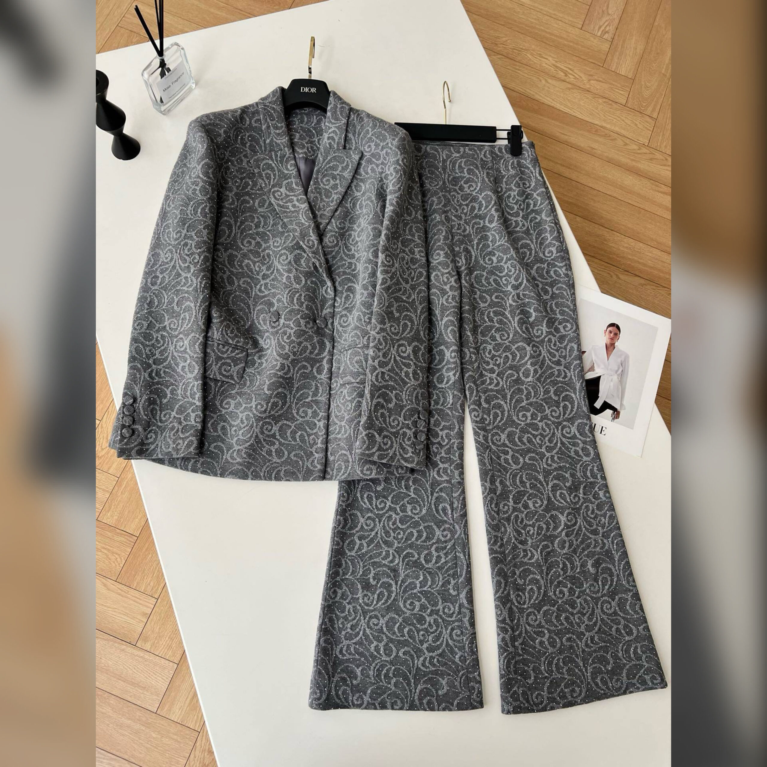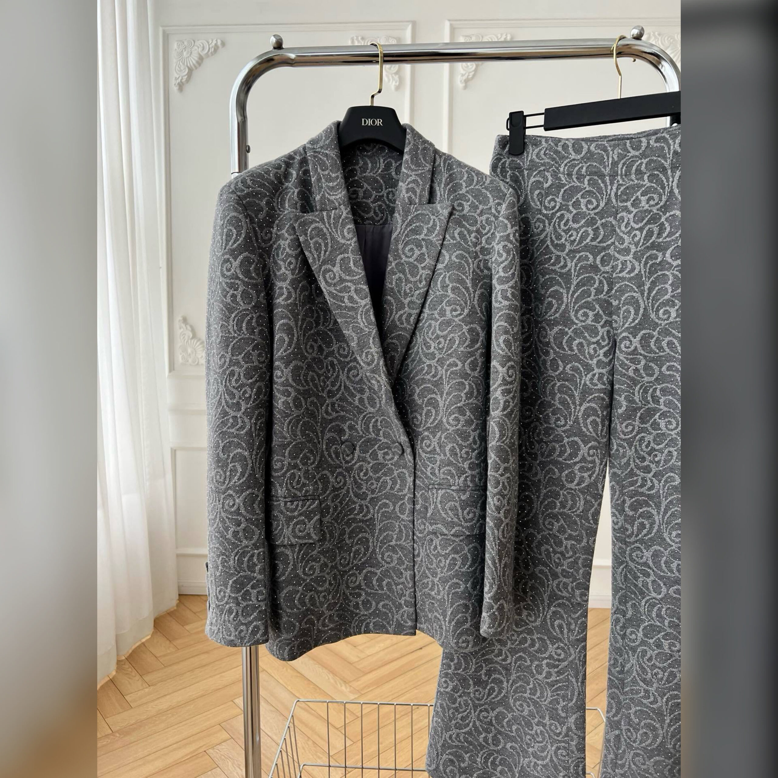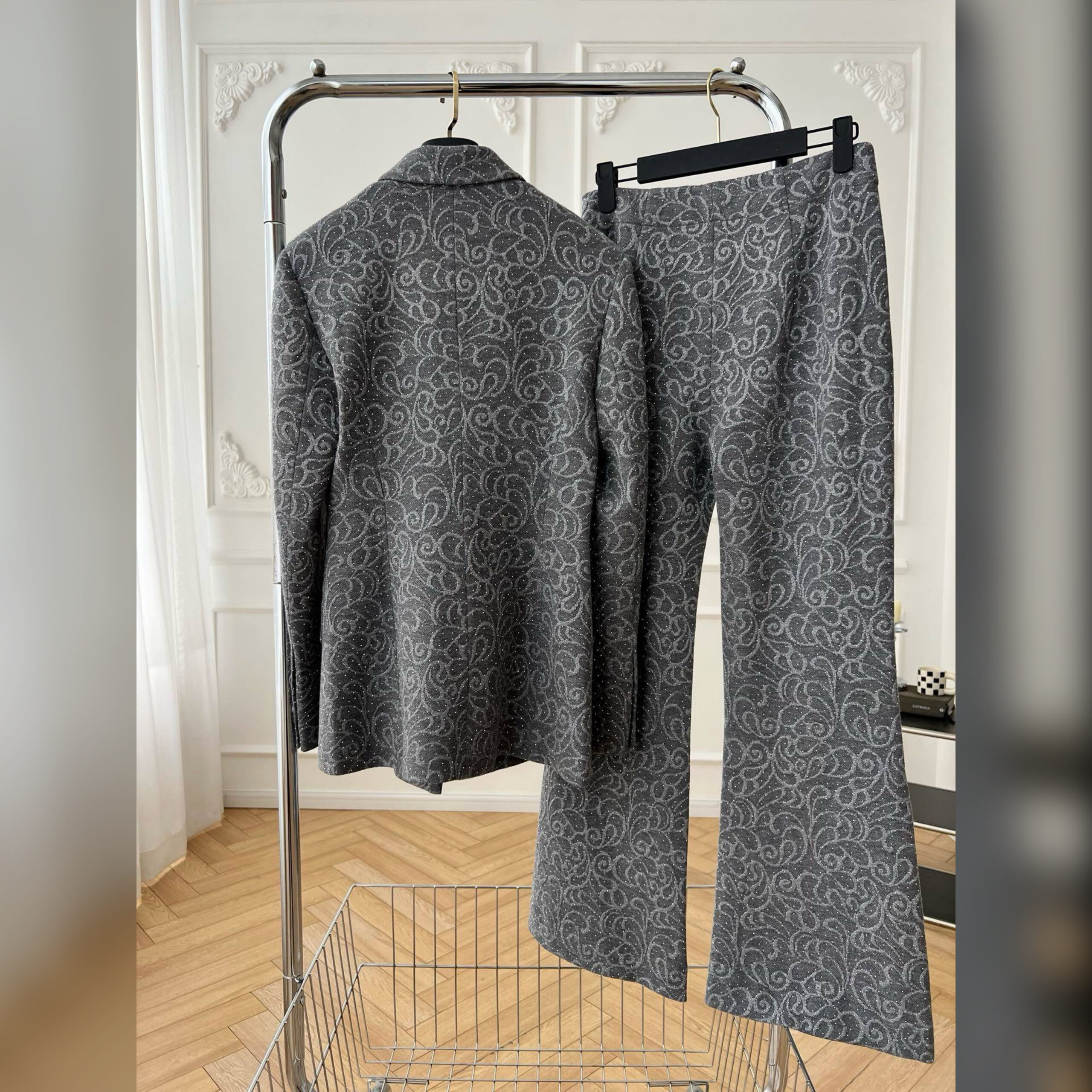 Несмотря на нейтральный серый оттенок, жакет и брюки не лишены индивидуальности, за счет эффектного паттерна по всей поверхности.
