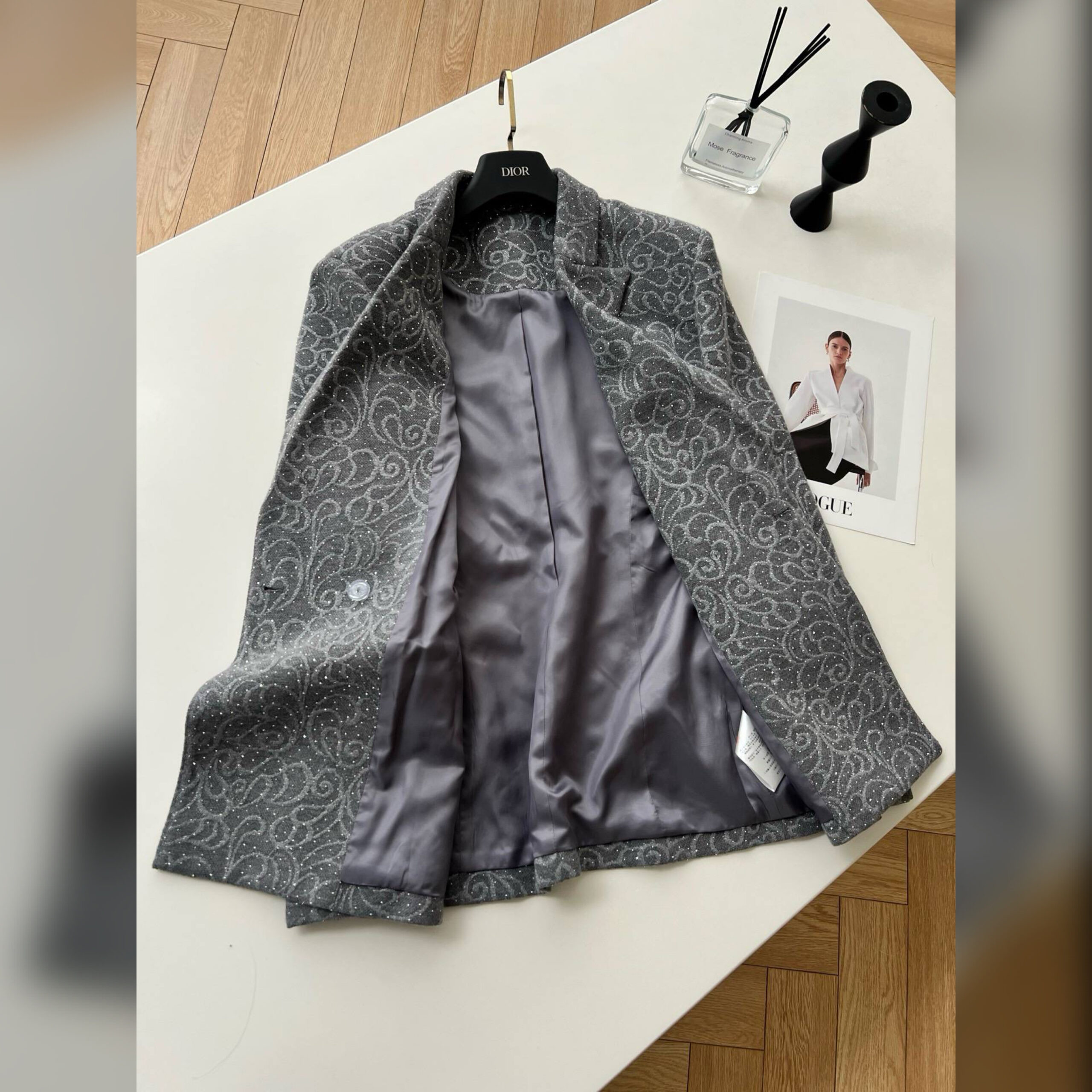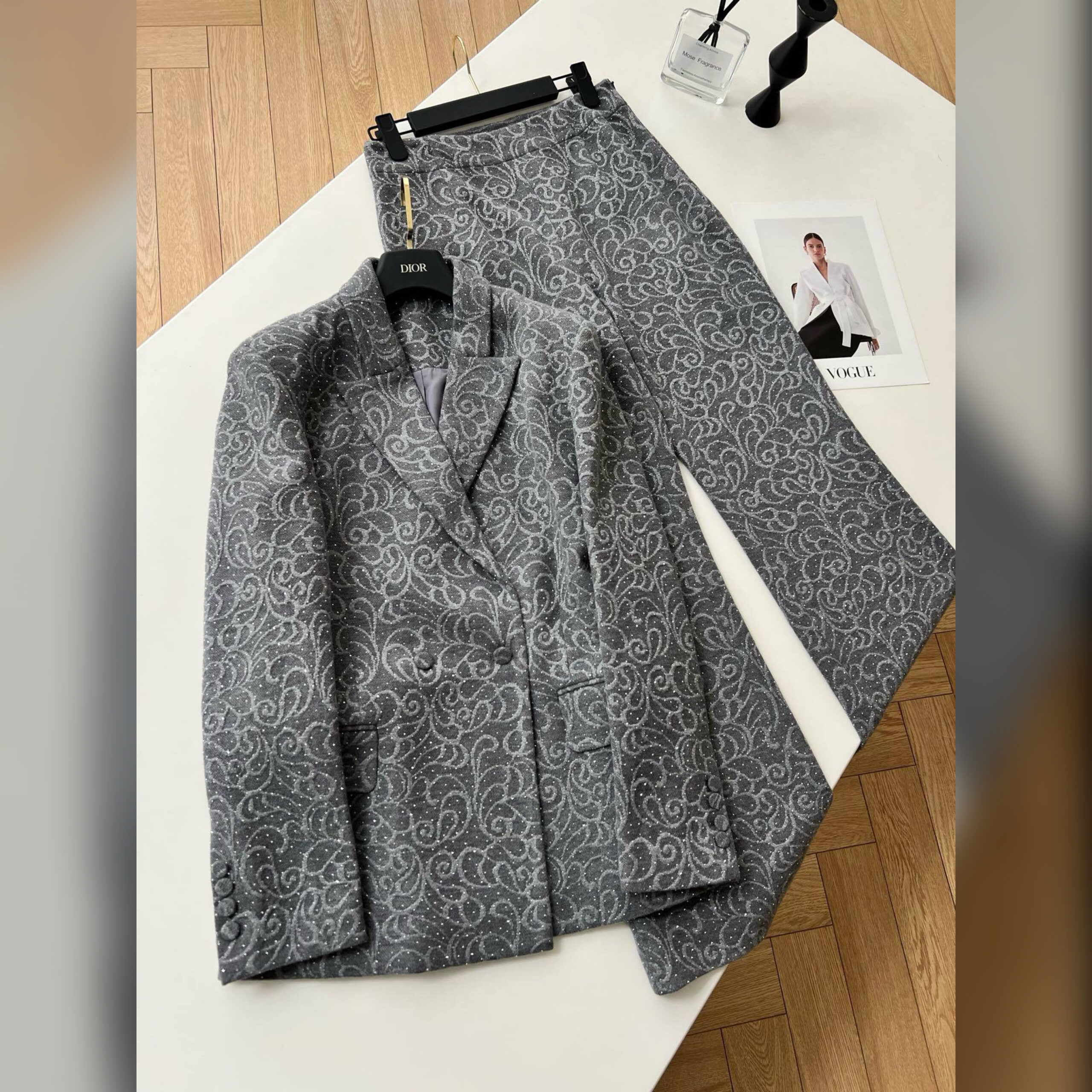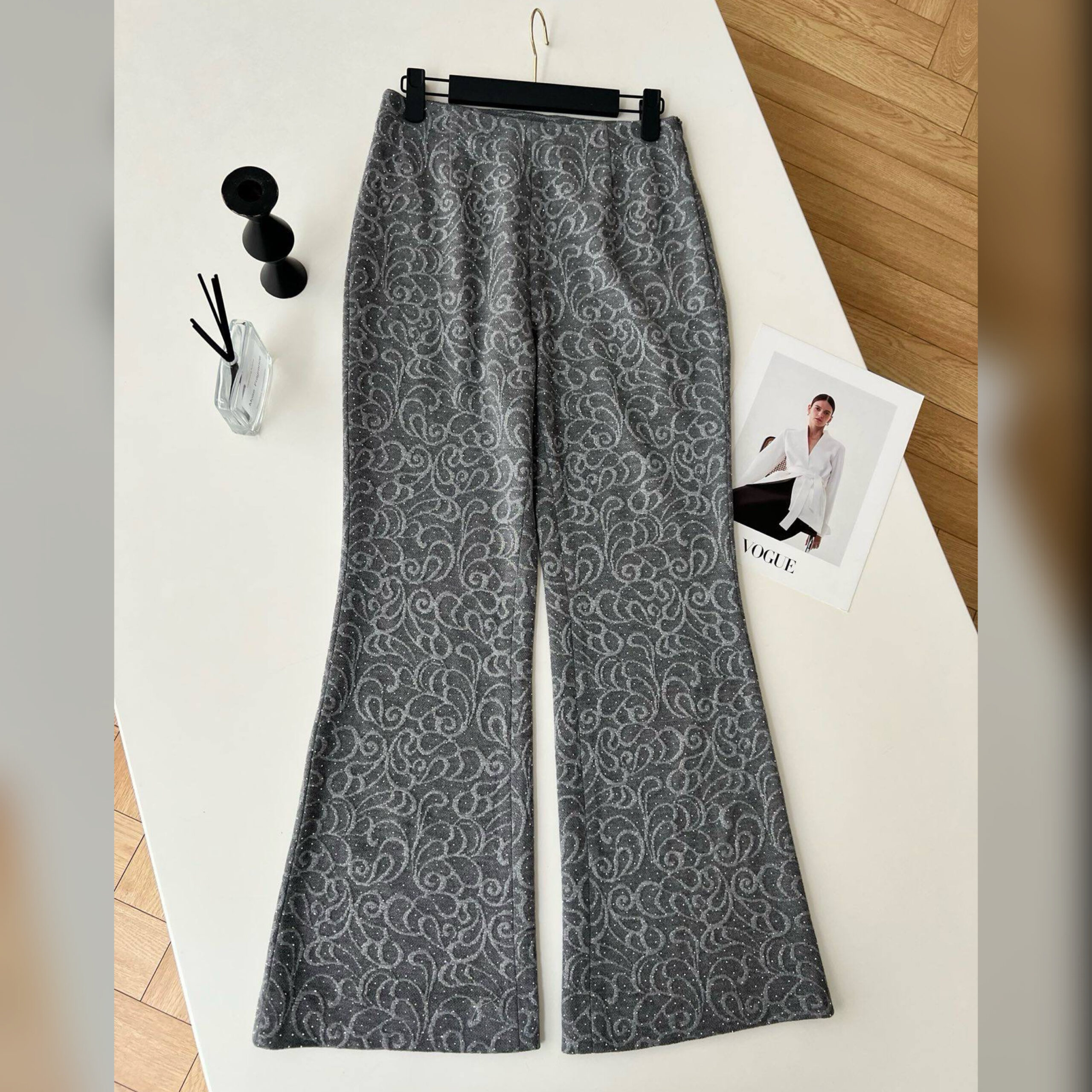 Несмотря на нейтральный серый оттенок, жакет и брюки не лишены индивидуальности, за счет эффектного паттерна по всей поверхности.