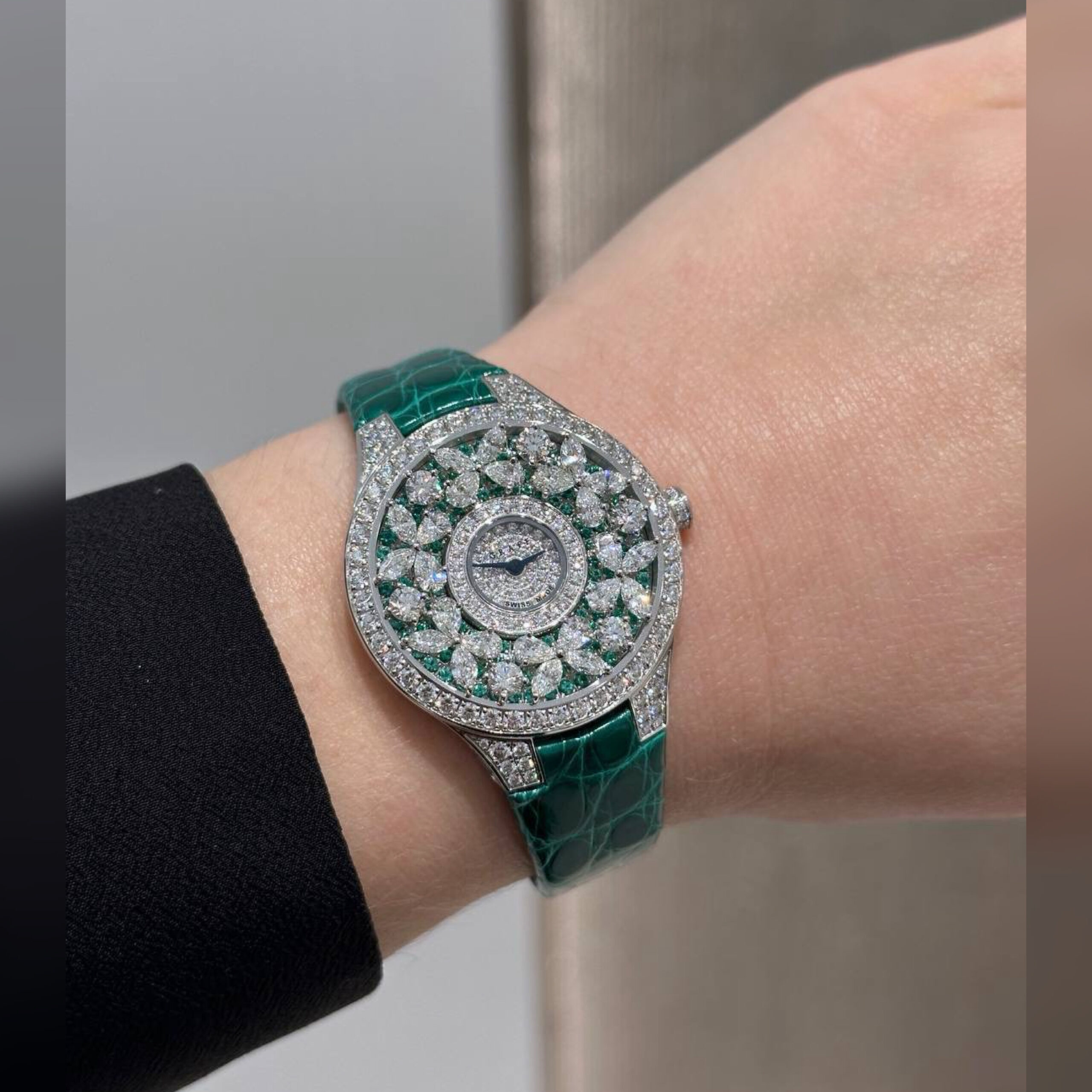 Часы Classic Butterfly интерпретируют изящную красоту одного из самых увлекательных существ природы в искусственно выращенных бриллиантах и изумрудах. Представленный на ремешке из кожи аллигатора, калейдоскоп бабочек, кажется, легко плавает на циферблате, демонстрируя идеальную симметрию их крыльев в соблазнительных композициях.
