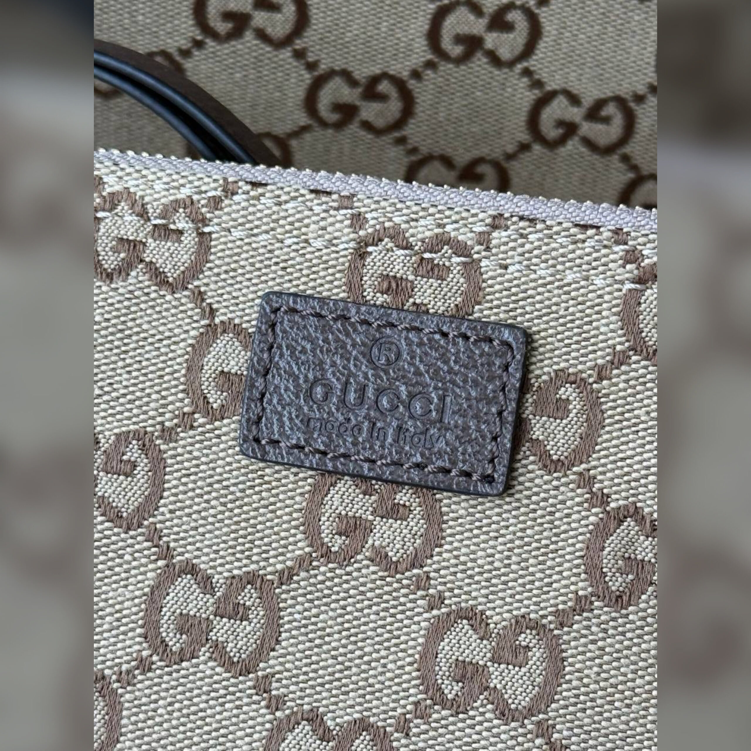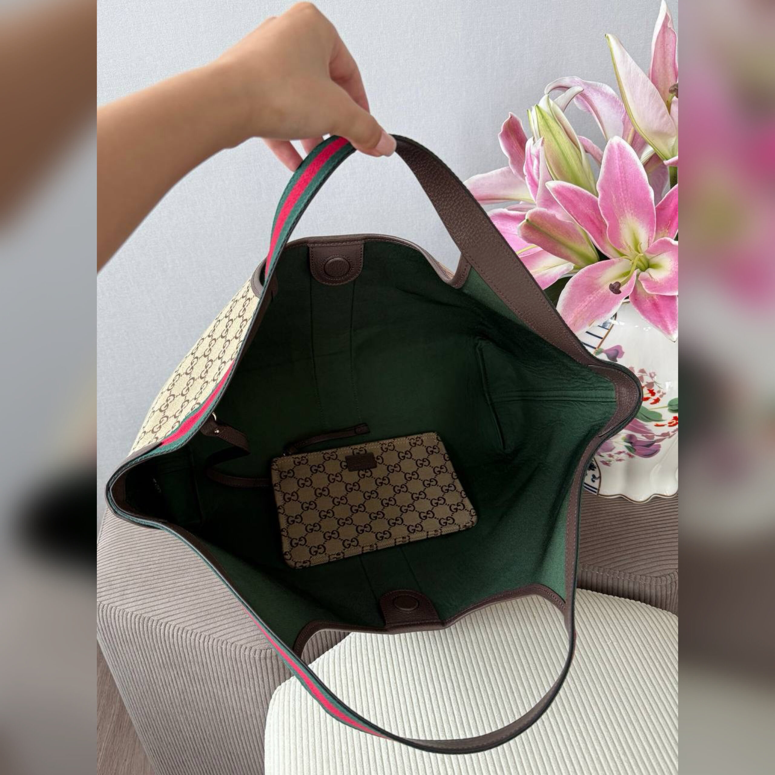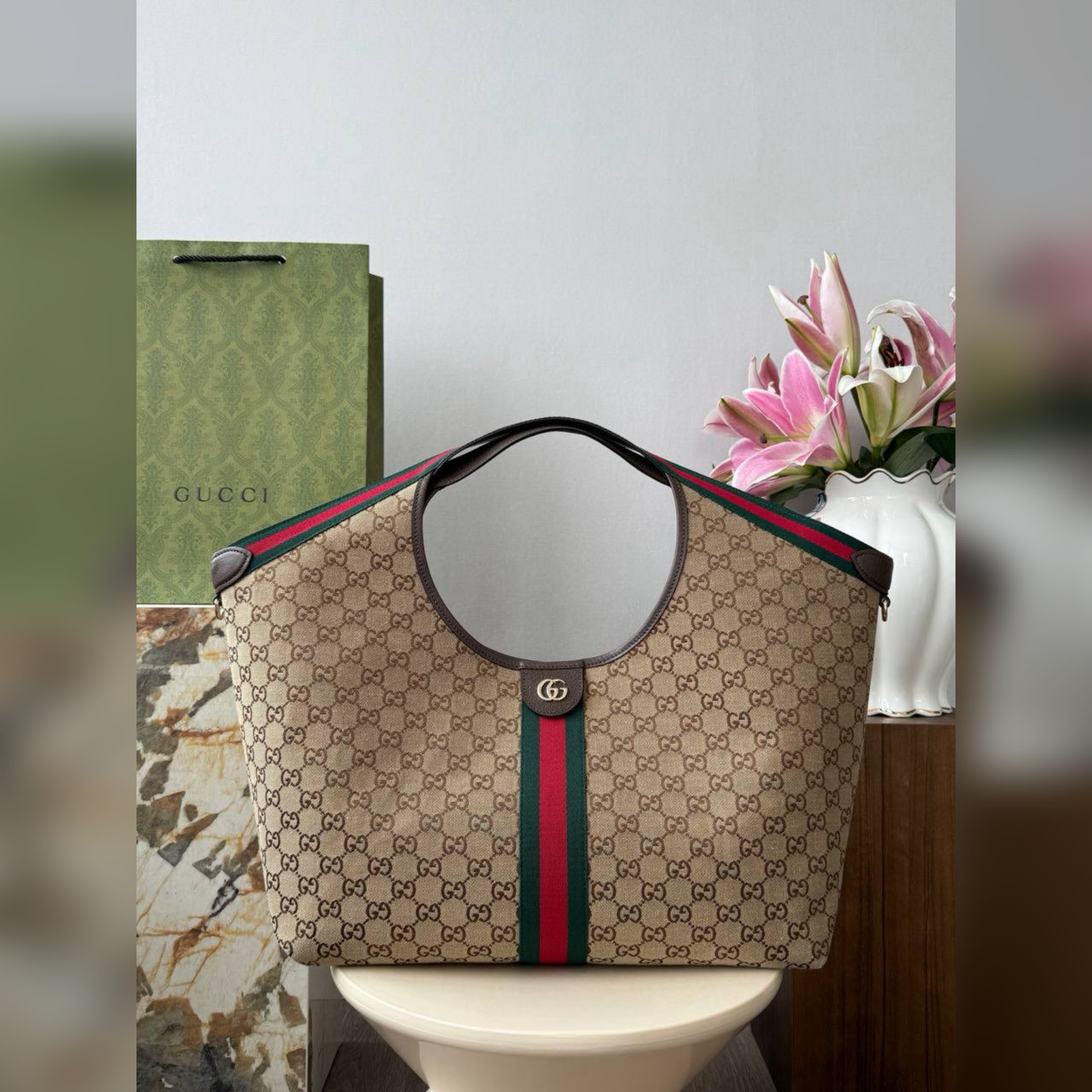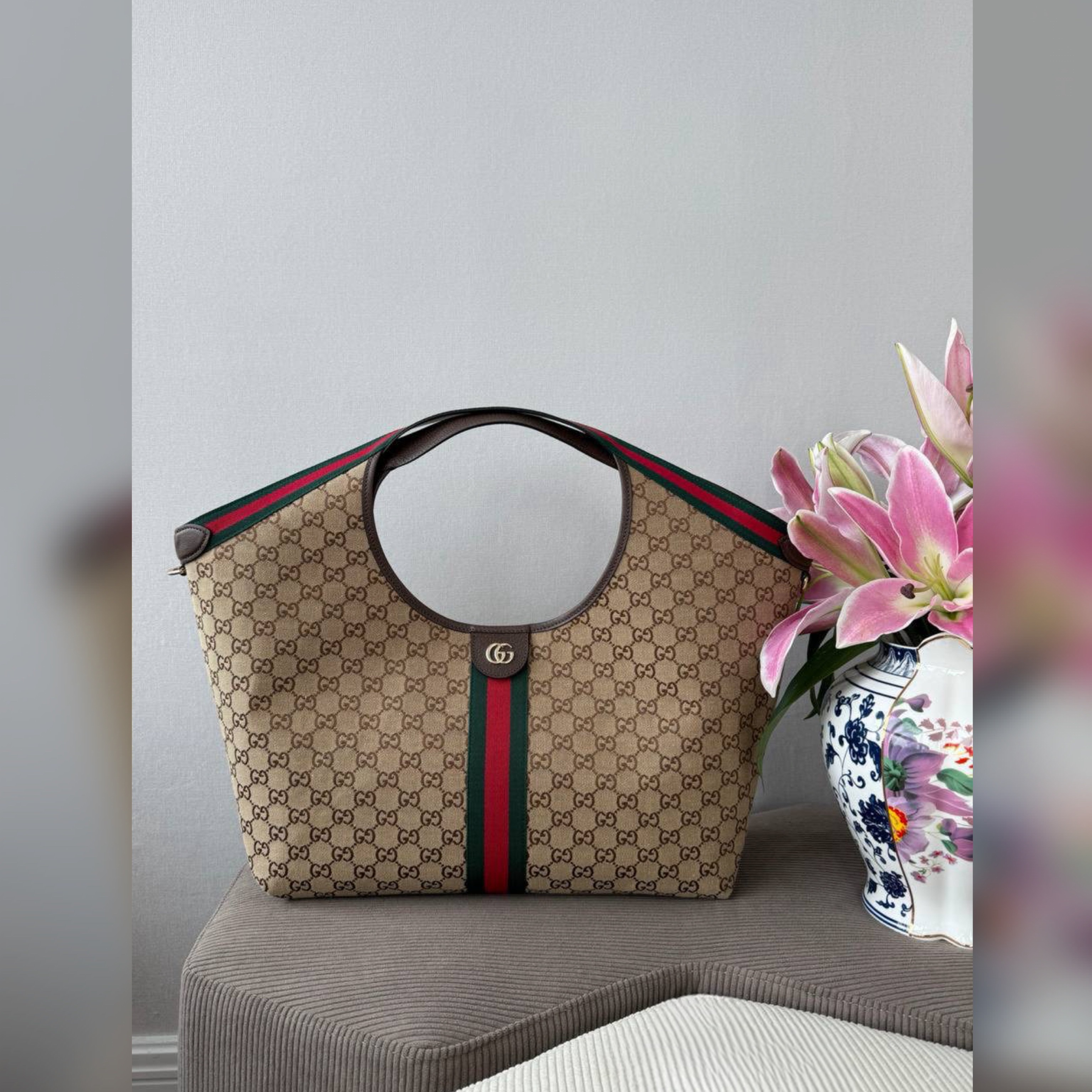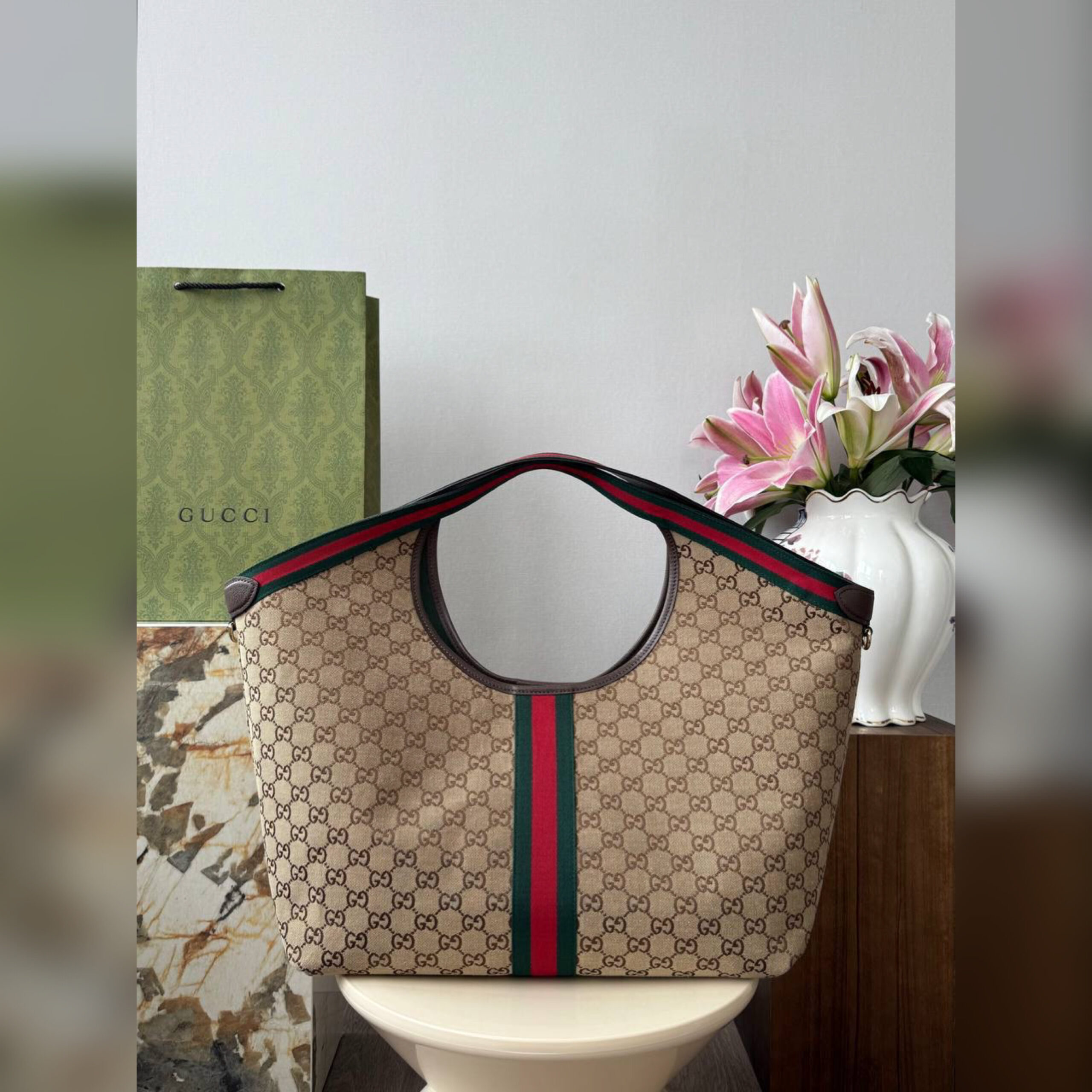 Модель с отделкой из гладкой кожи выполнили из прочного материала со знаковым паттерном GG. Аксессуар украсили лентой Web и архивной GG-монограммой из инициалов Гуччио Гуччи. Внутрь поместятся документы формата А4, смартфон и складной зонт.