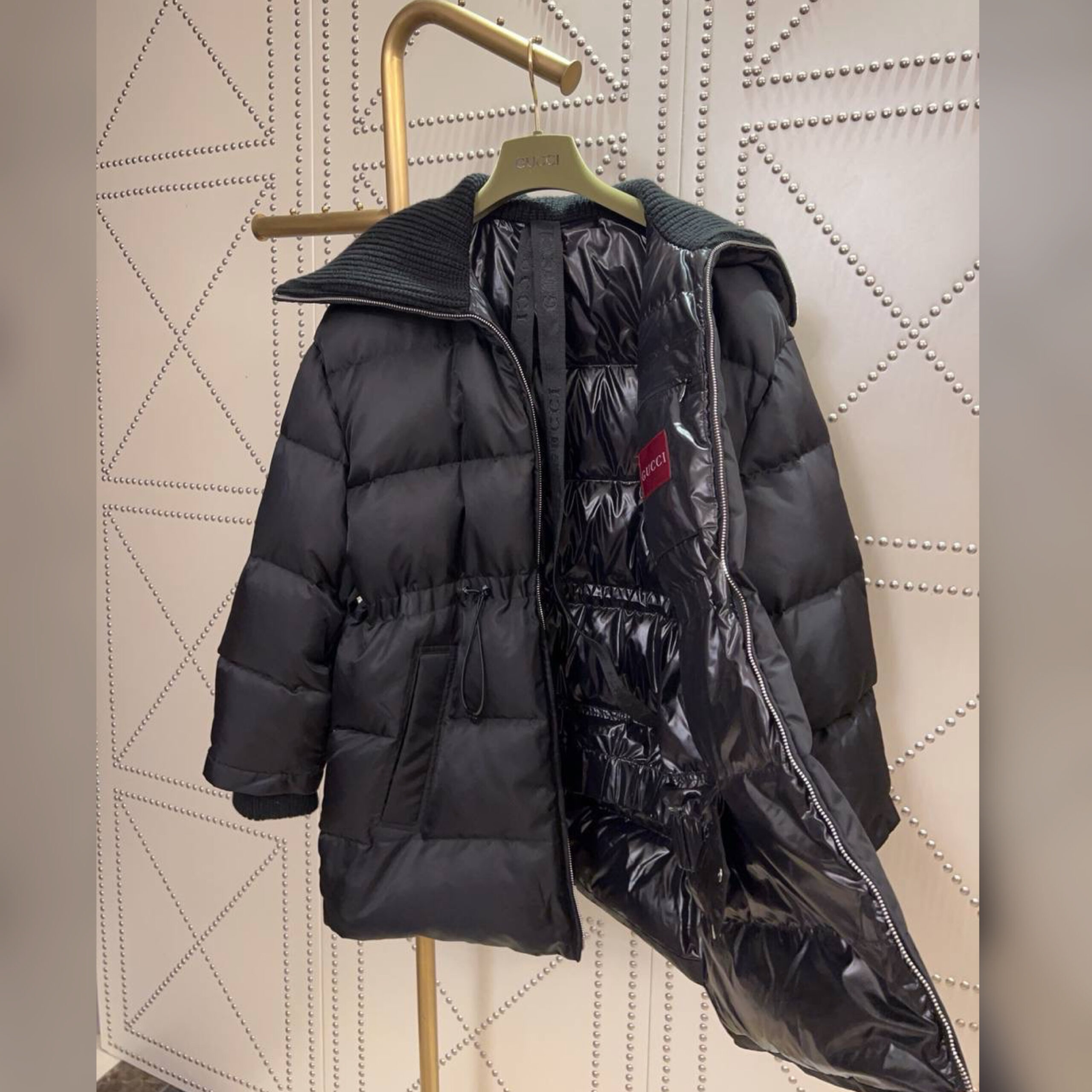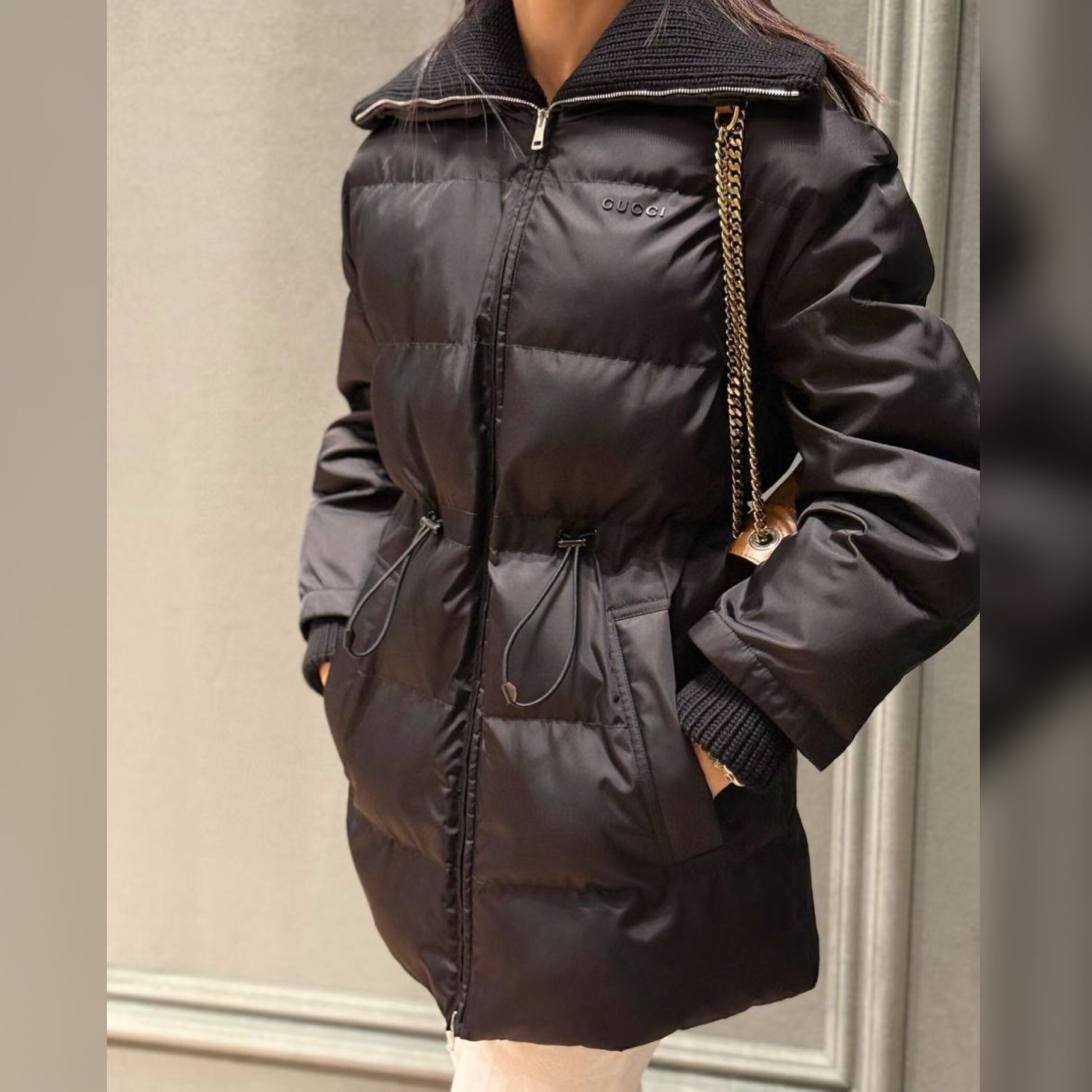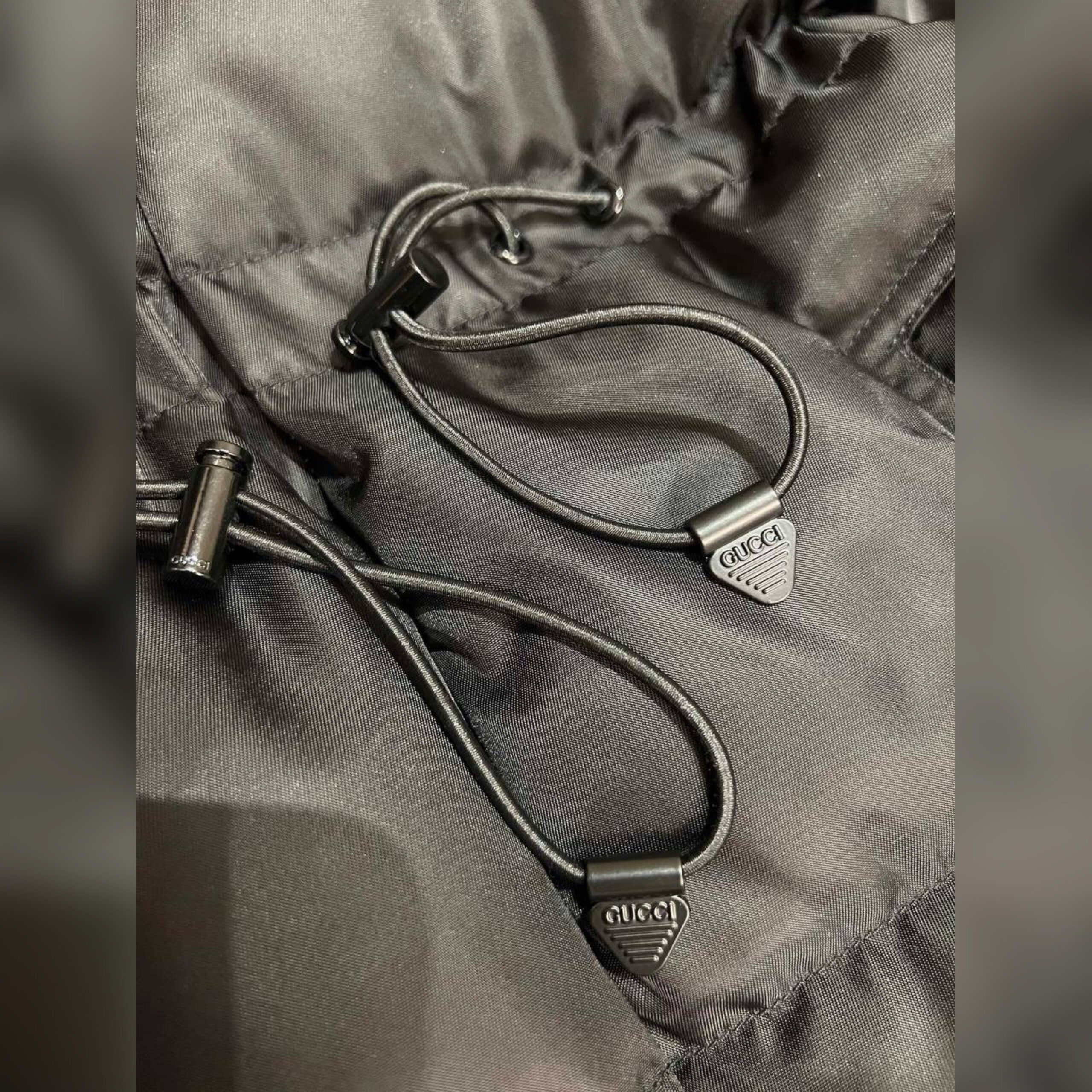 Утепленную куртку с эластичной кулиской на талии сшили из тонкого габардинового нейлона. Широкий воротник отделали трикотажем, выполнив из такого же материала и манжеты. По бокам предусмотрели карманы, а внутри – брендированные лямки, позволяющие спустить пуховик с плеч. Модель на нейлоновом подкладе застегивается встречной молнией.