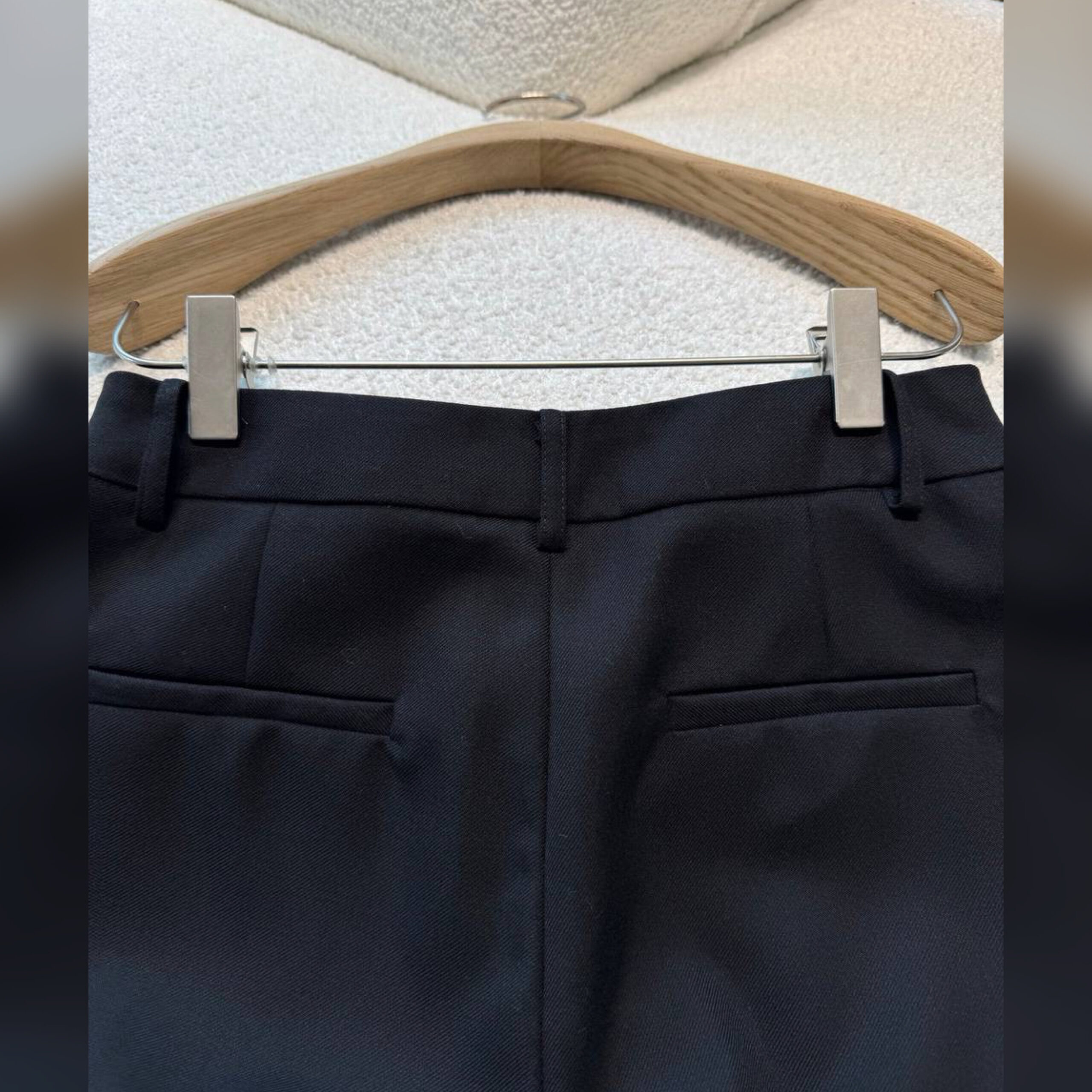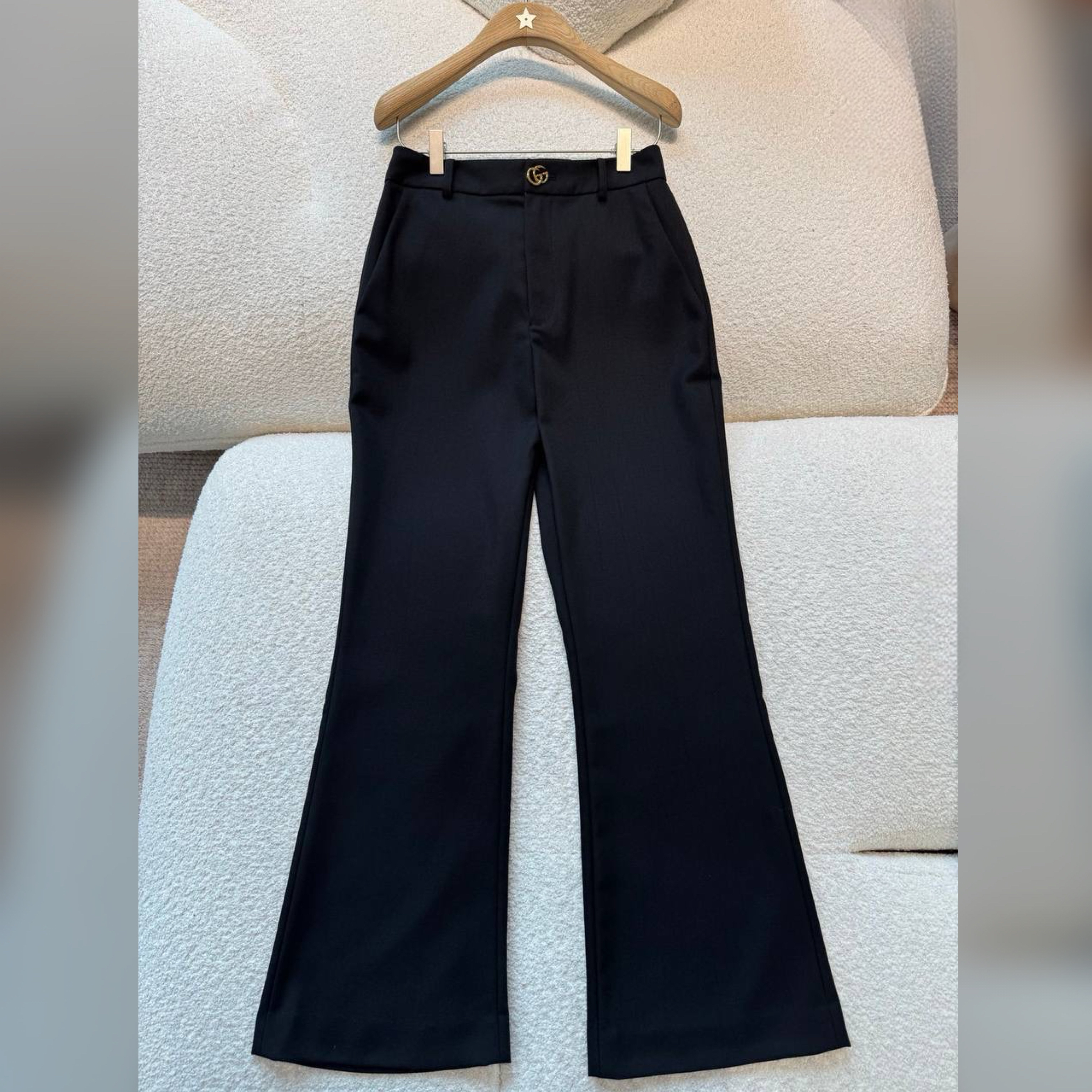На создание слегка расклешенных черных брюк дизайнера марки, основанной Гуччио Гуччи, вдохновили 1970-е. Классический образ в стиле тех лет можно дополнить парным жакетом и ботинками с круглым мысом.