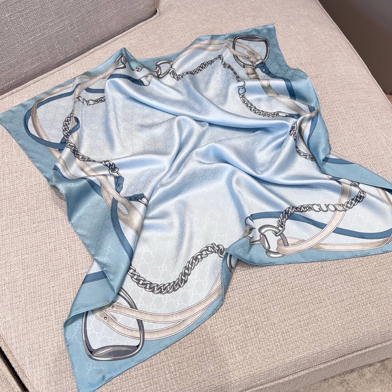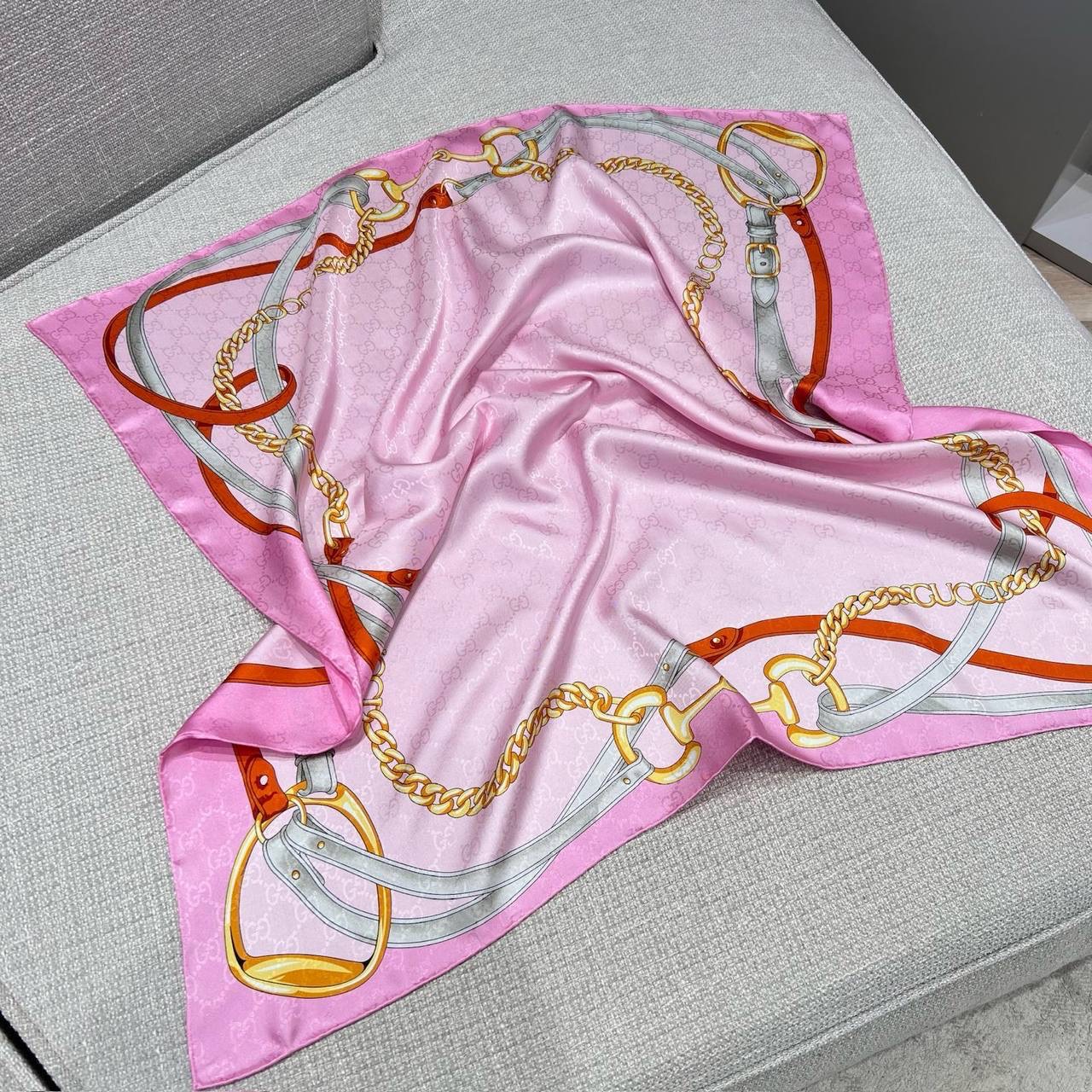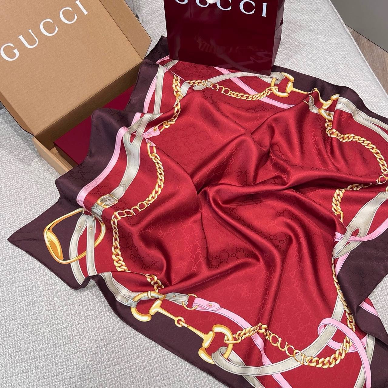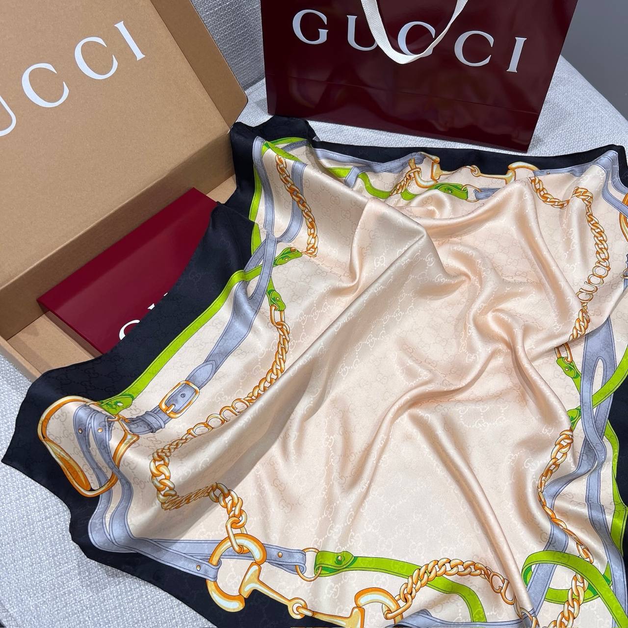 Платок с подшитыми вручную краями выполнили из шелкового твила с жаккардовым узором GG Supreme. Аксессуары украсили контрастными принтами в виде стремян, конной упряжи и паттерном GG.
