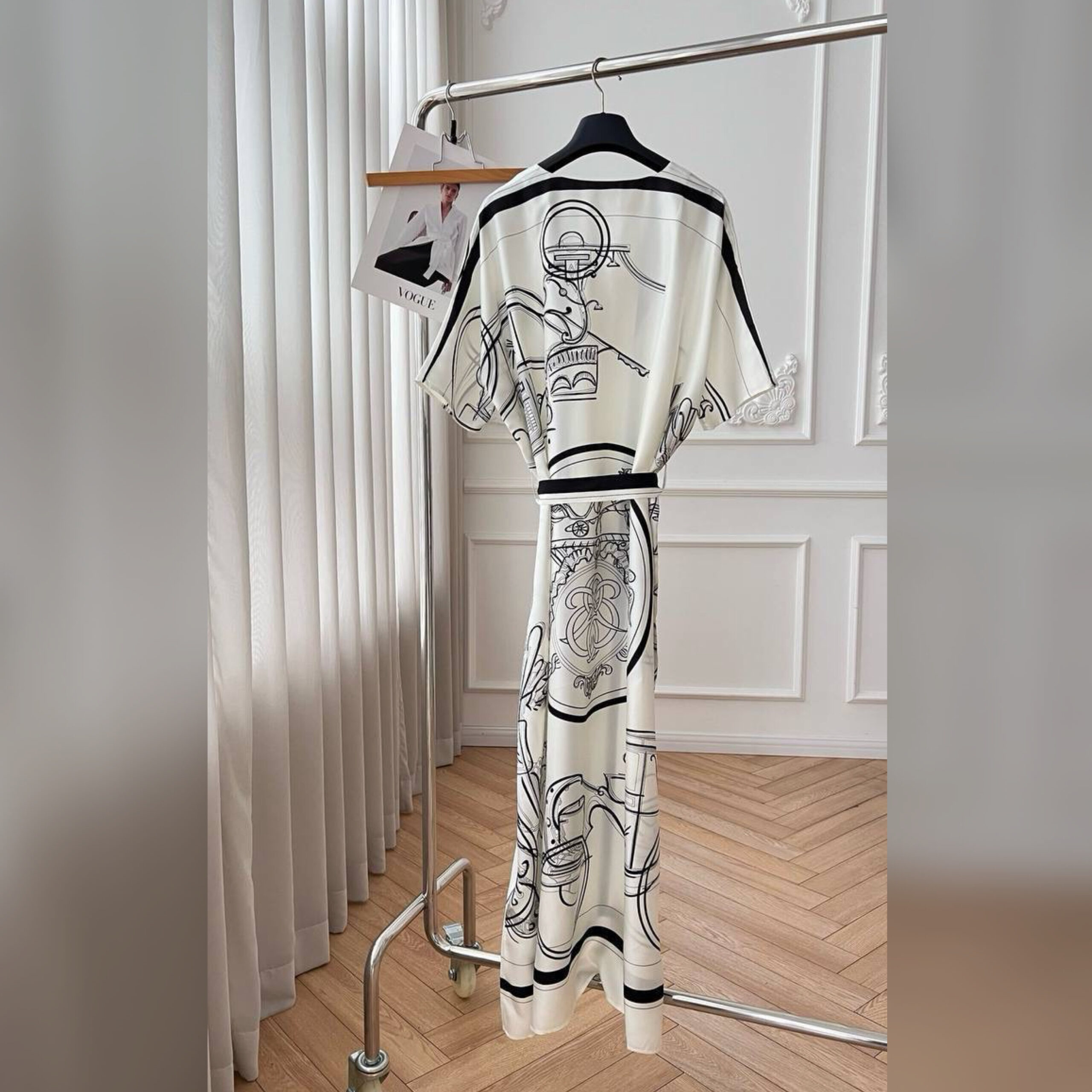 Свободное изделие с короткими рукавами и v-образным вырезом дополнили длинным поясом-лентой, формирующим приталенный силуэт.