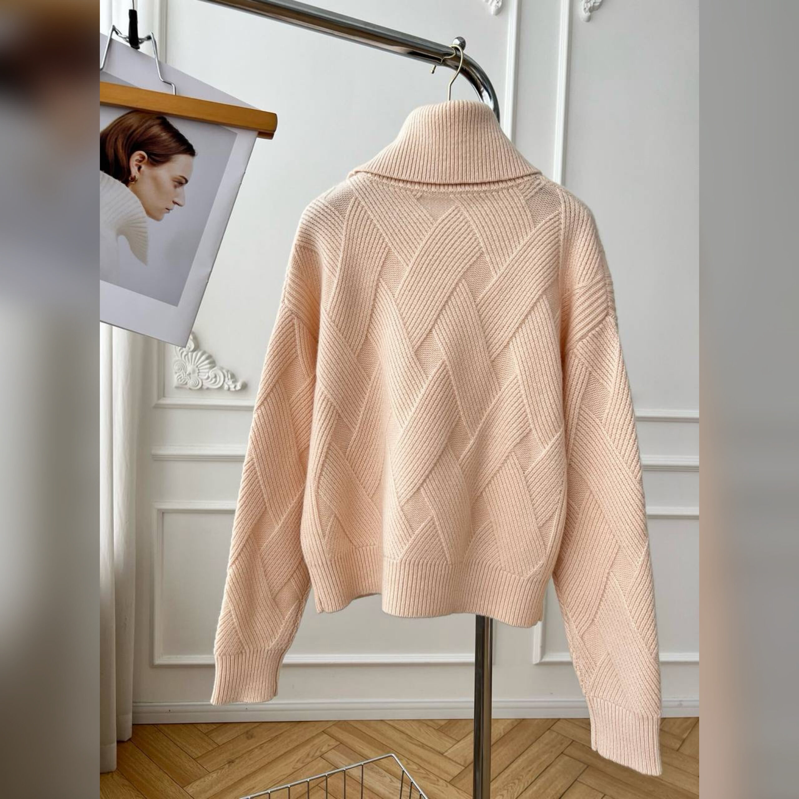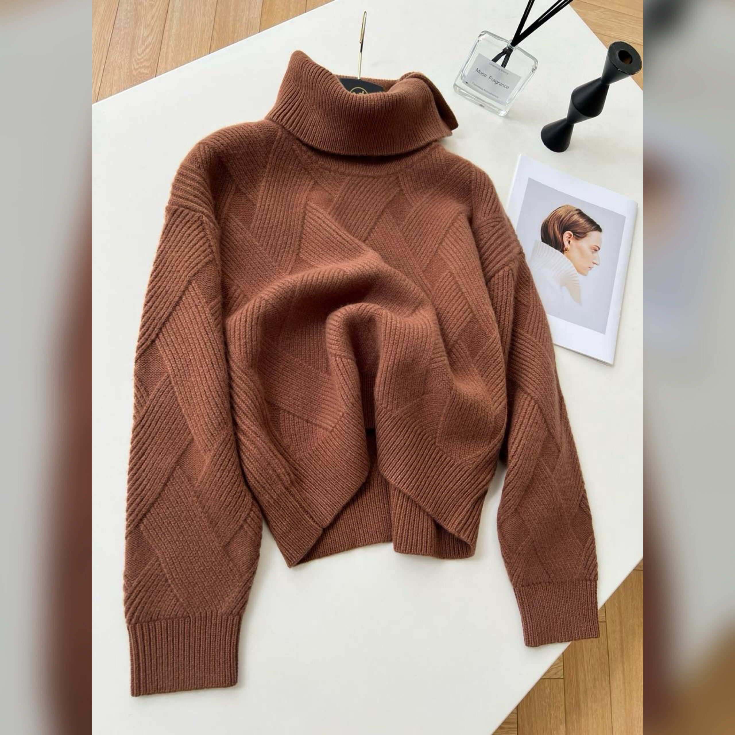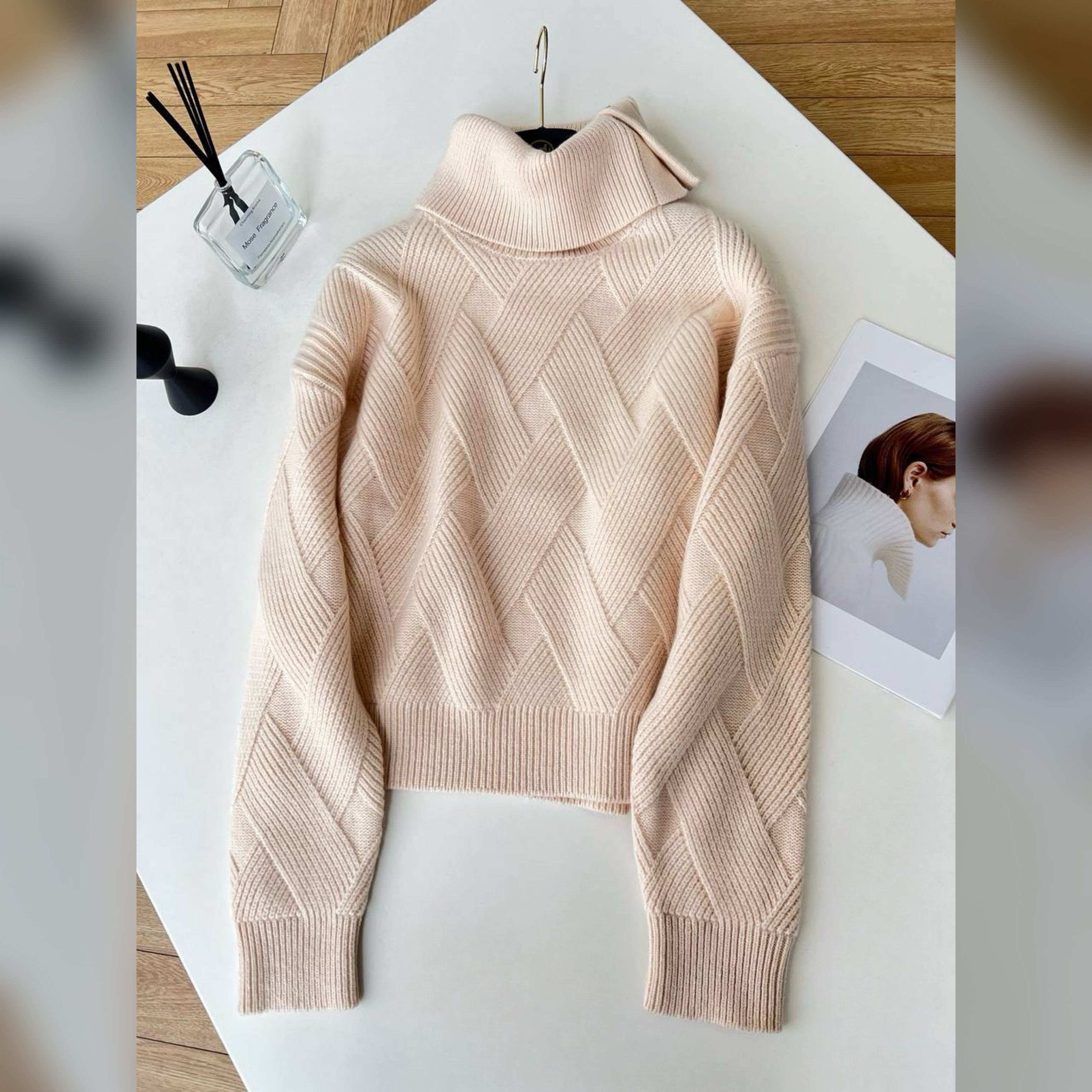 Свитер с высоким воротником, поясом и манжетами в рубчик связали из мягкой пряжи. Однотонная модель с рельефными узорами органично дополнит базовый гардероб.