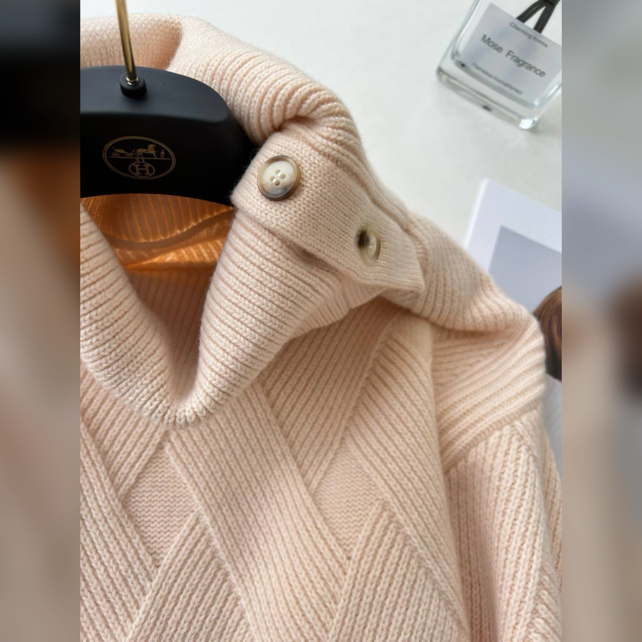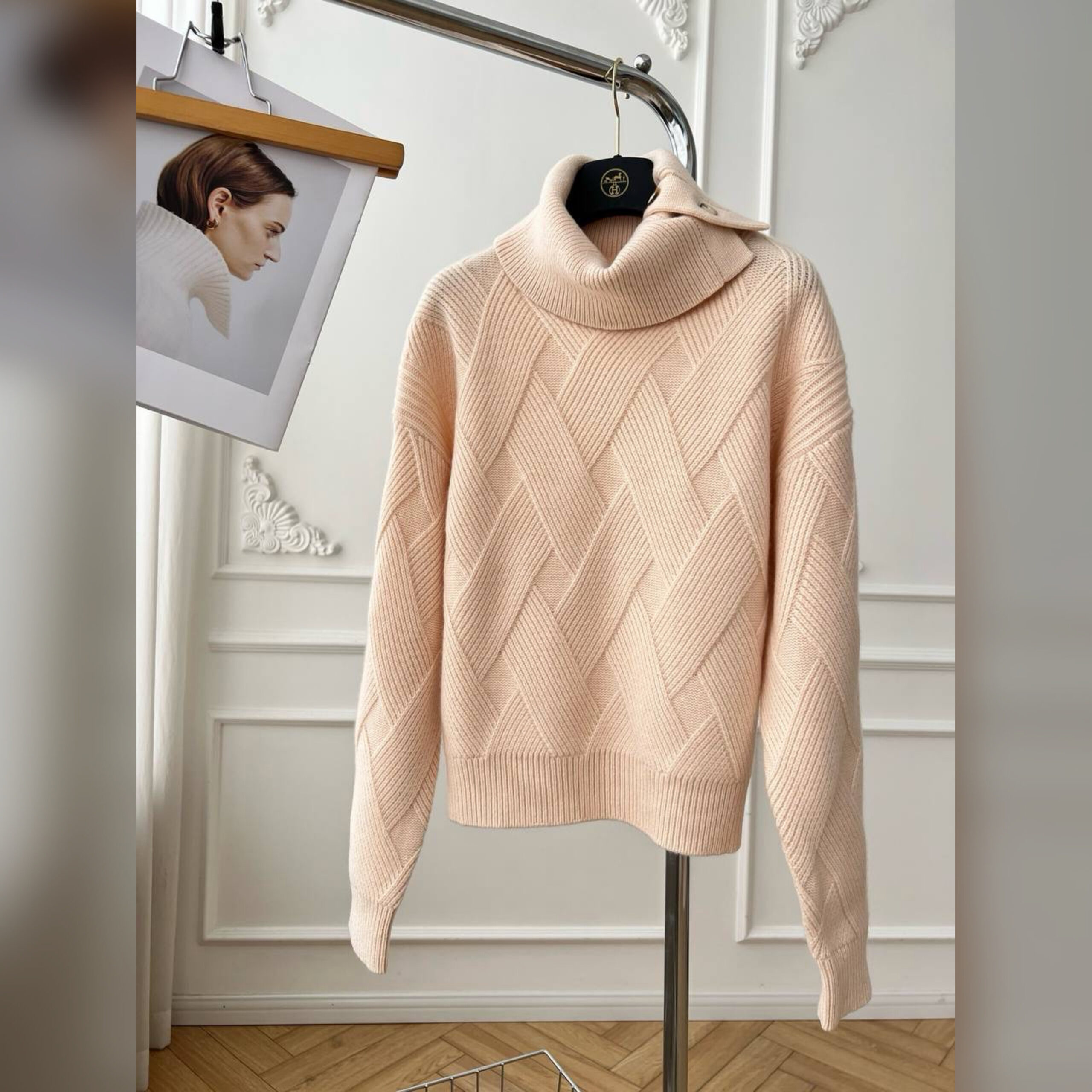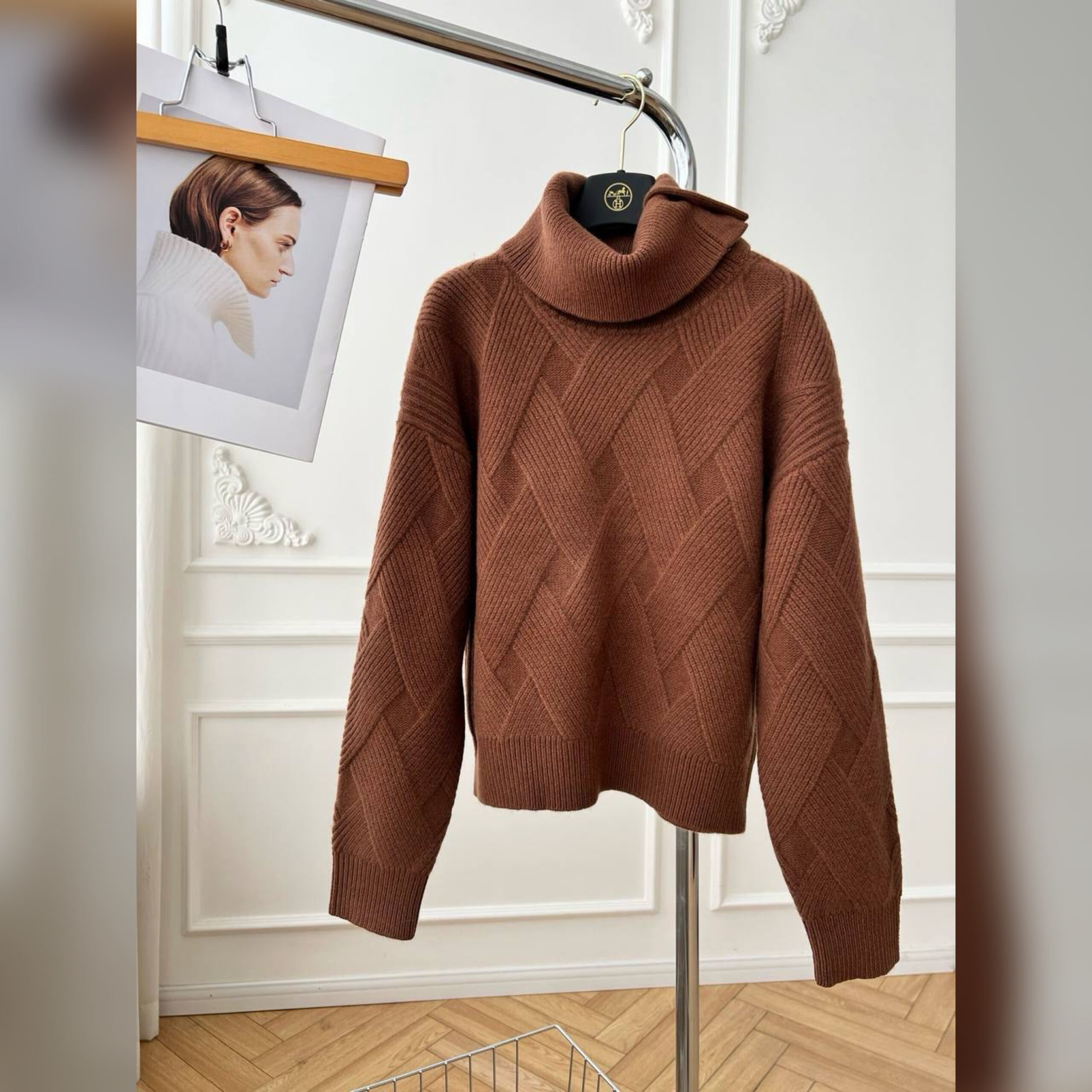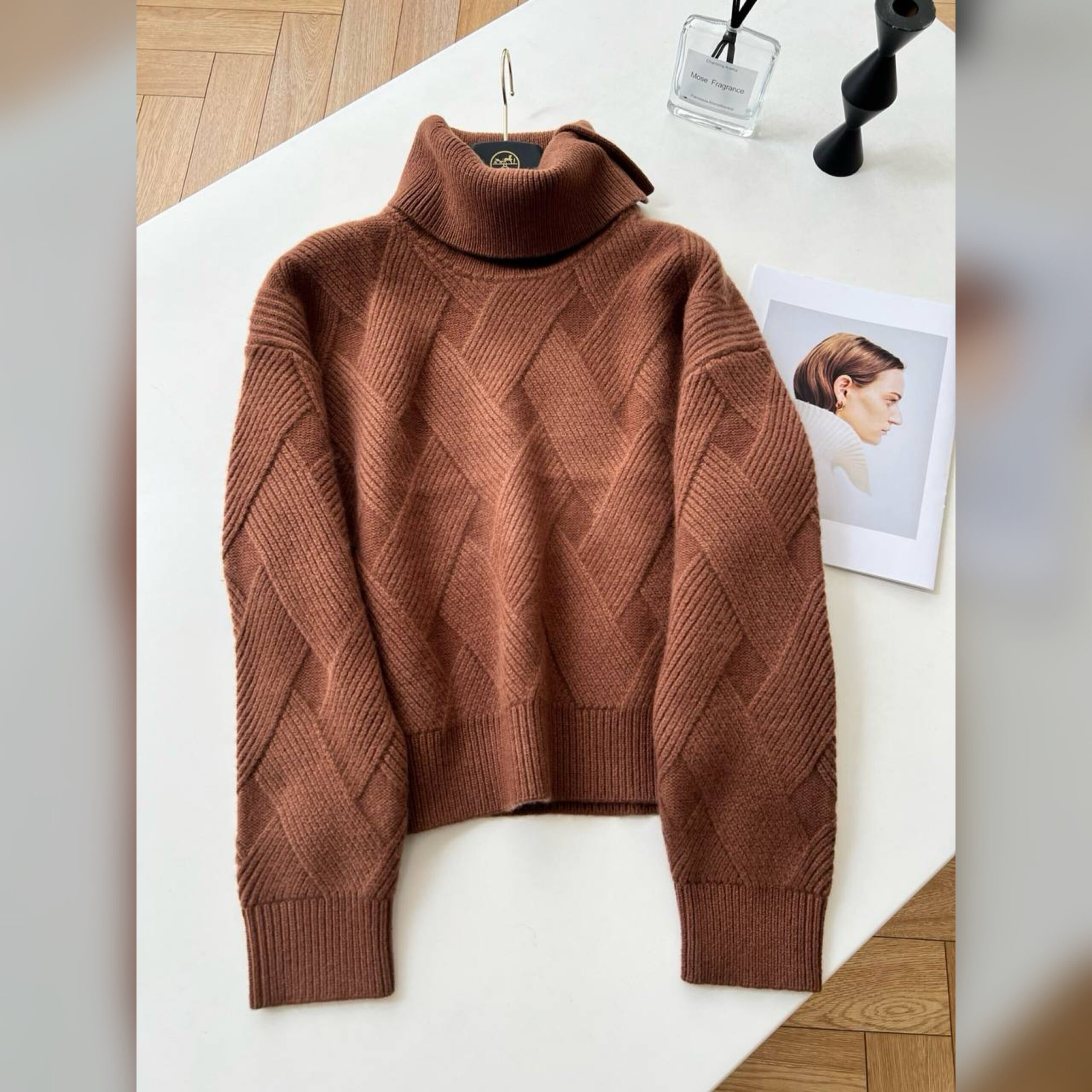 Свитер с высоким воротником, поясом и манжетами в рубчик связали из мягкой пряжи. Однотонная модель с рельефными узорами органично дополнит базовый гардероб.