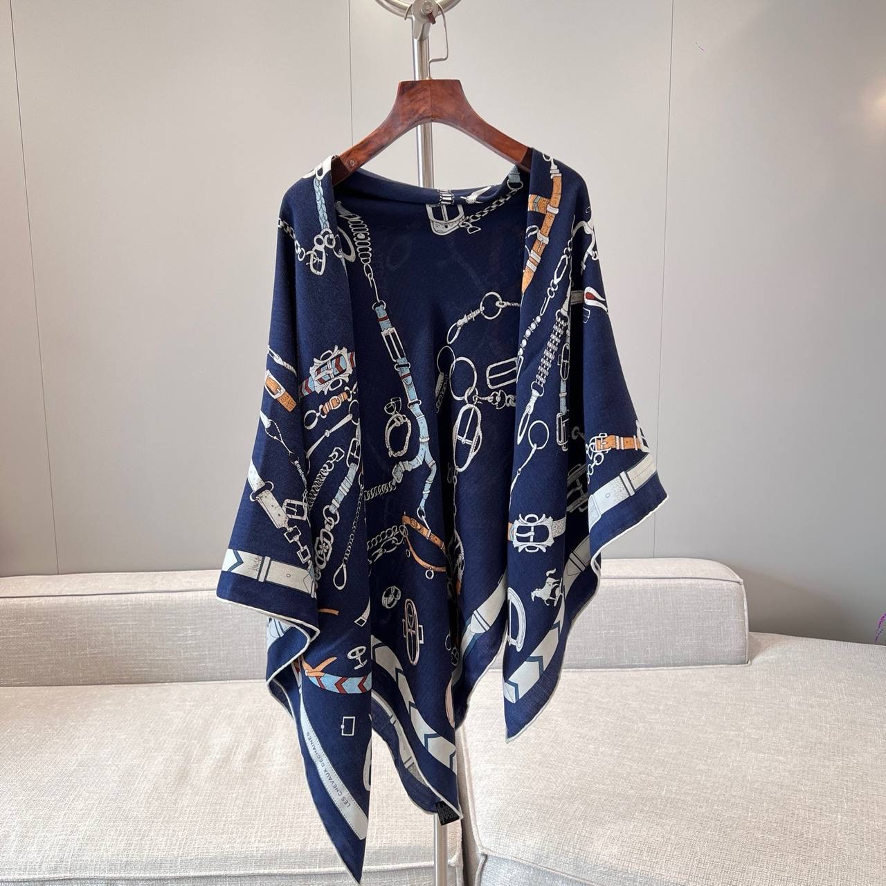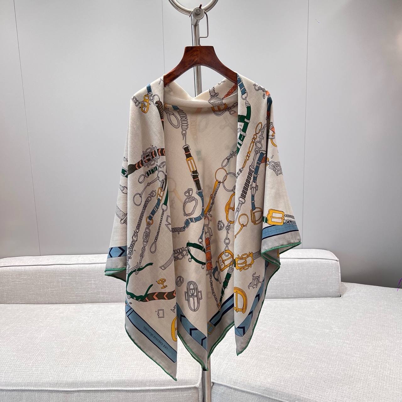 Изделие украшено принтом, разработанным Октавом Марсалом, с изображением двух скачущих лошадей. На первый взгляд их симметричные силуэты кажутся просто нарисованными карандашом, но на самом деле они состоят из ряда пряжек, цепей, стремян и ремней, вдохновленных коллекцией иллюстрированных альбомов Émile Hermès.