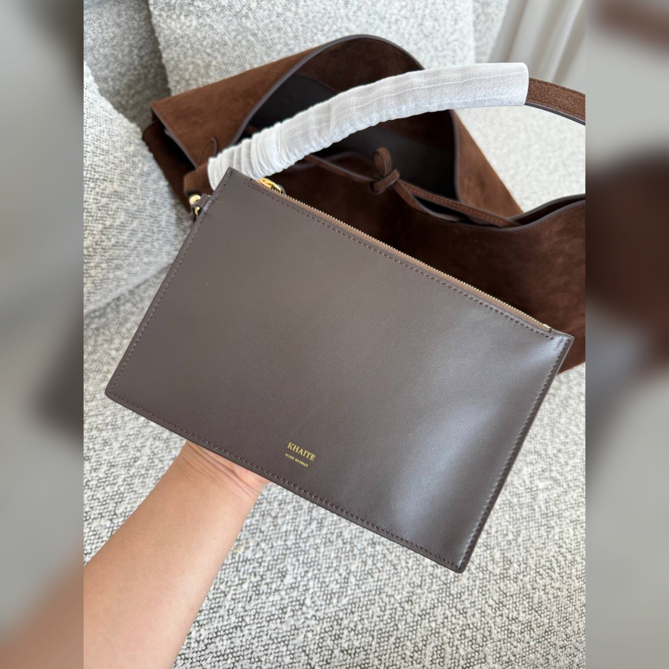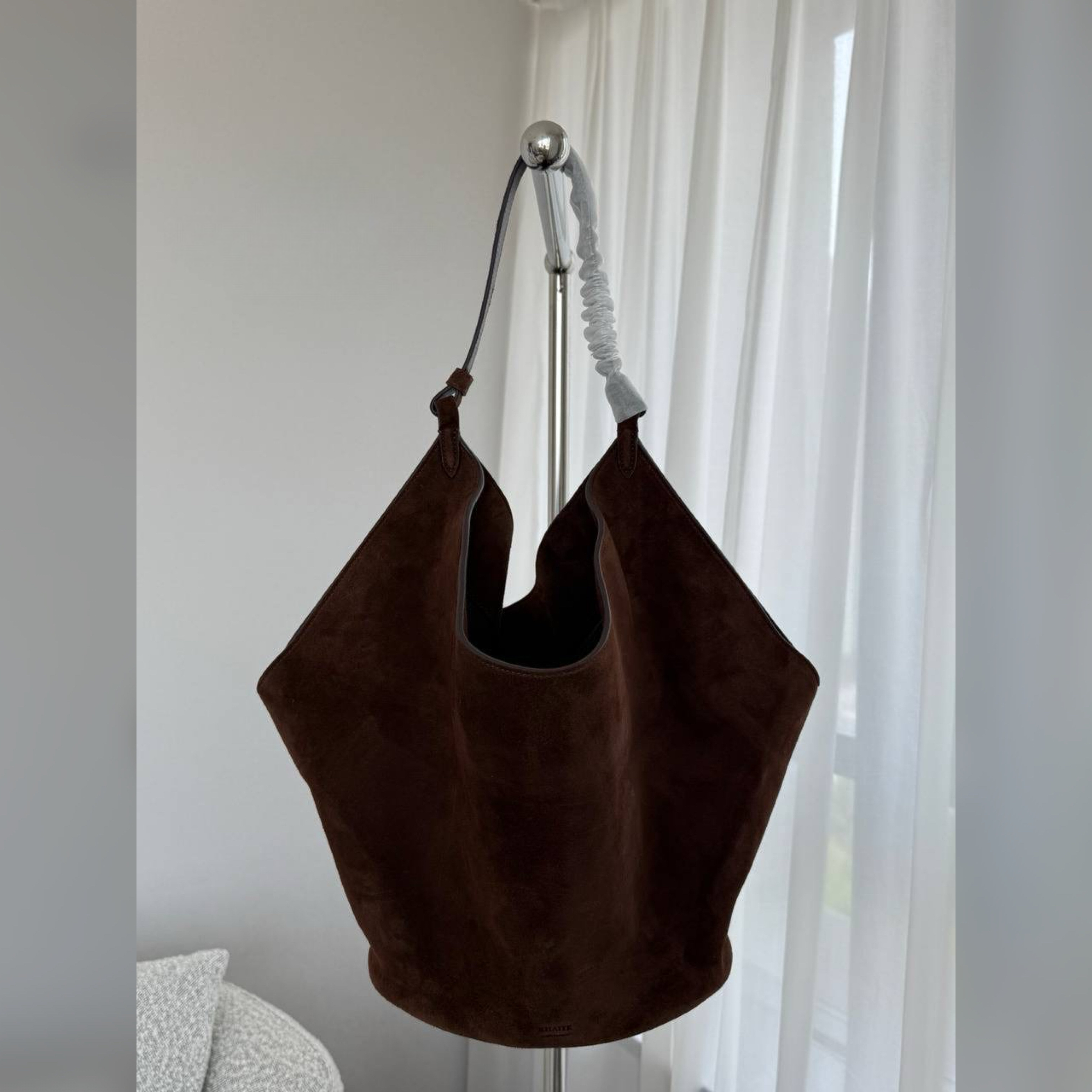 Модель дополнили жестким округлым основанием и длинной ручкой, позволяющей носить сумку на плече, а для мелких предметов предусмотрели съемный футляр в тон.