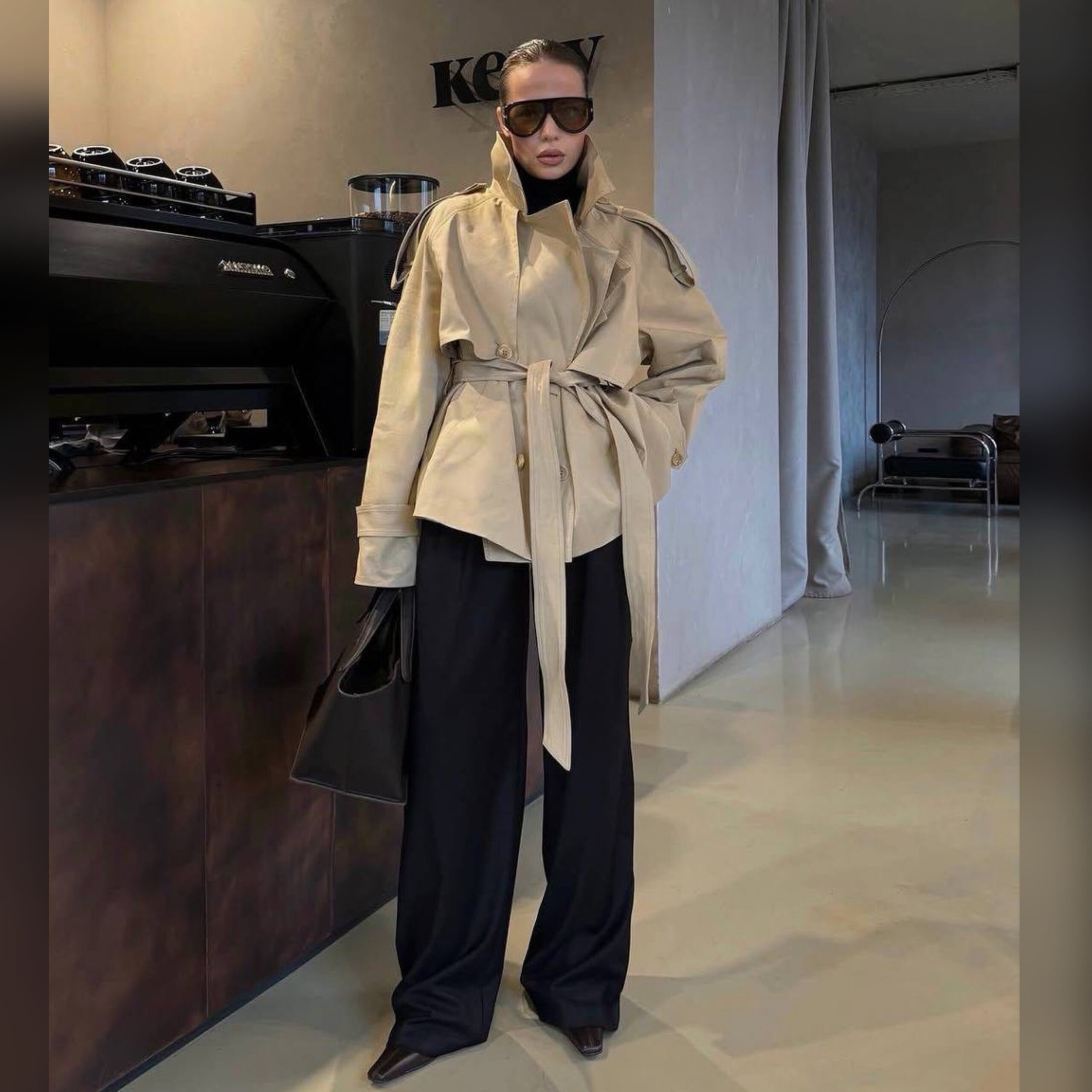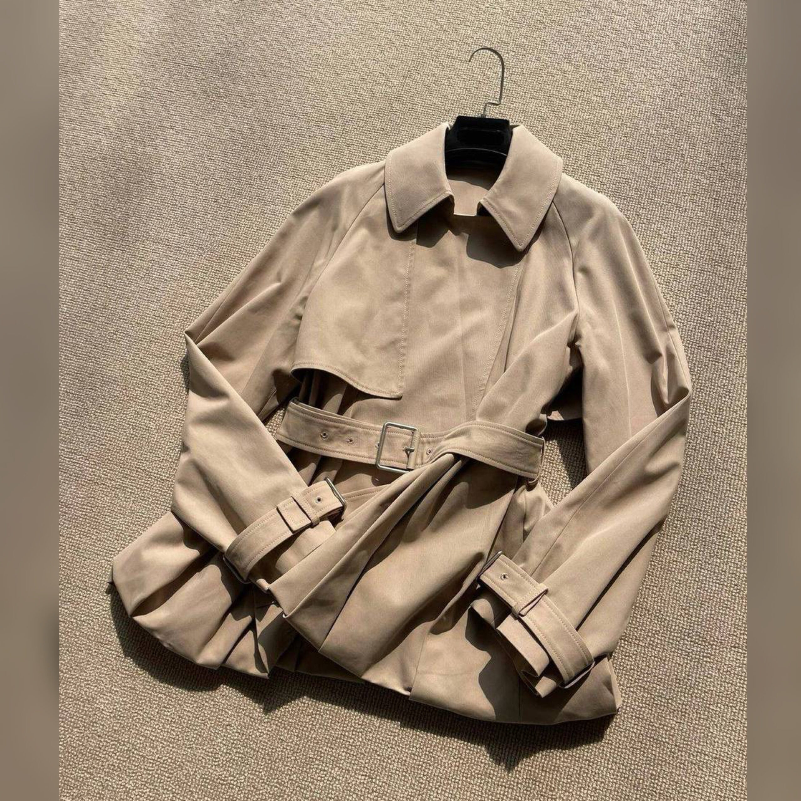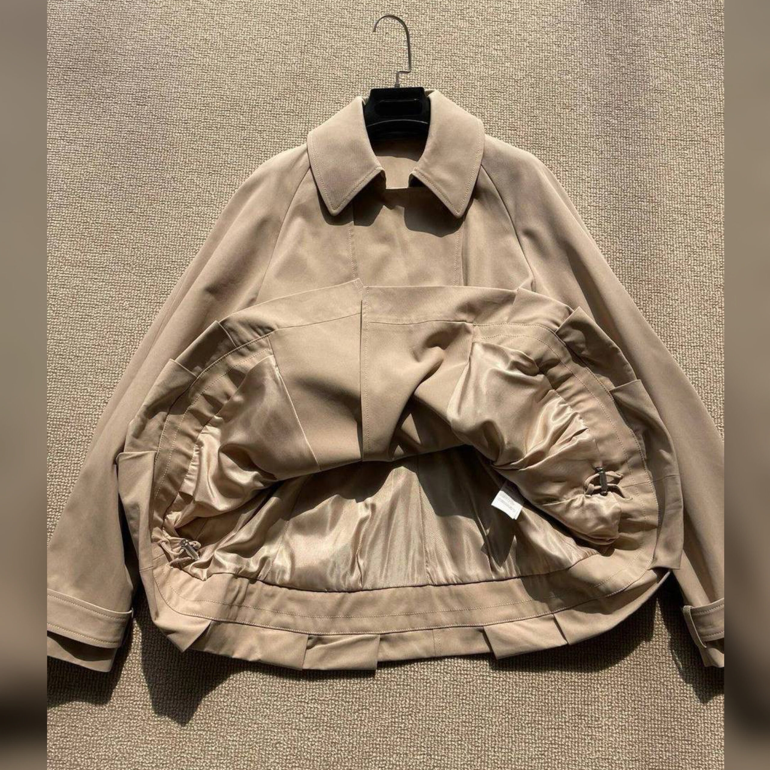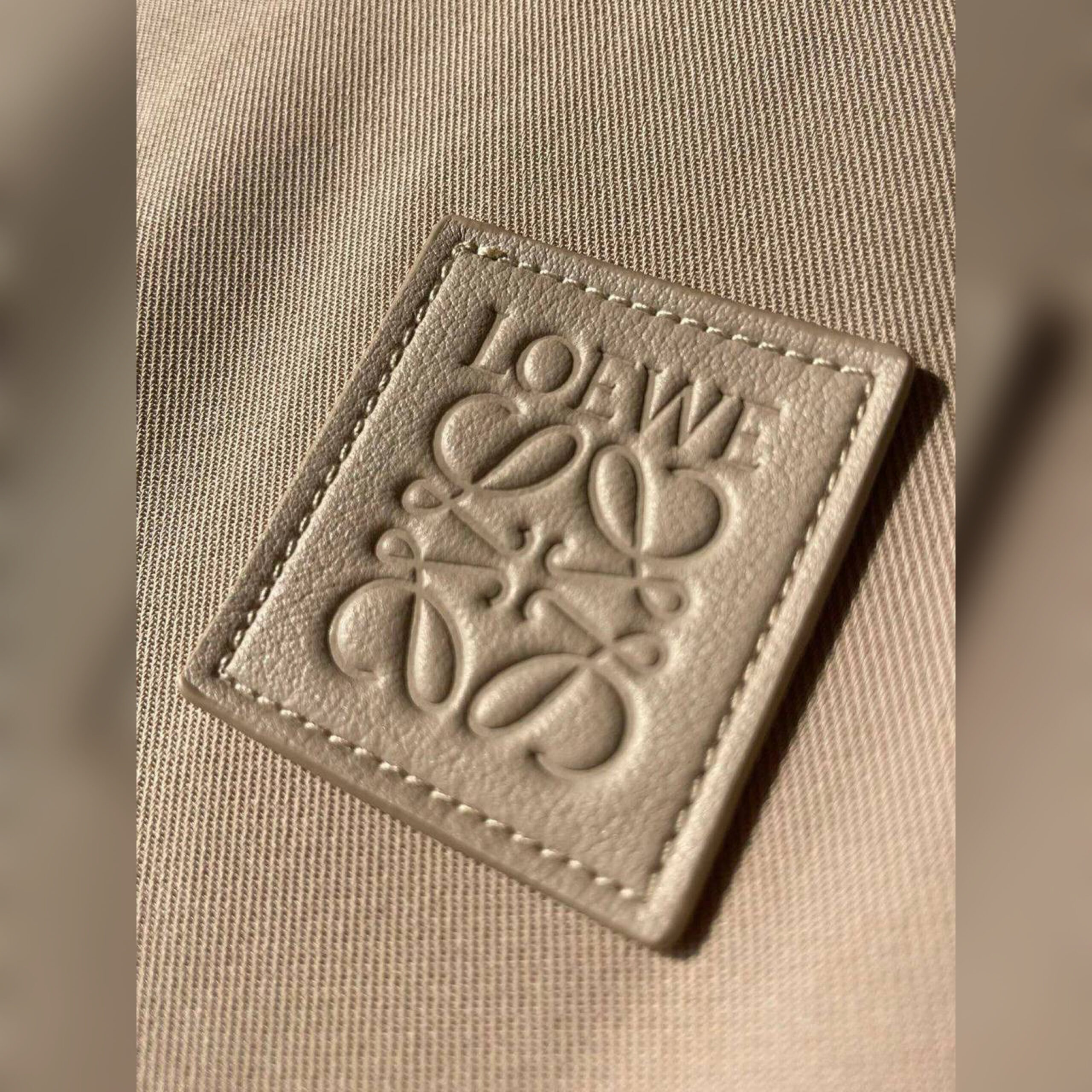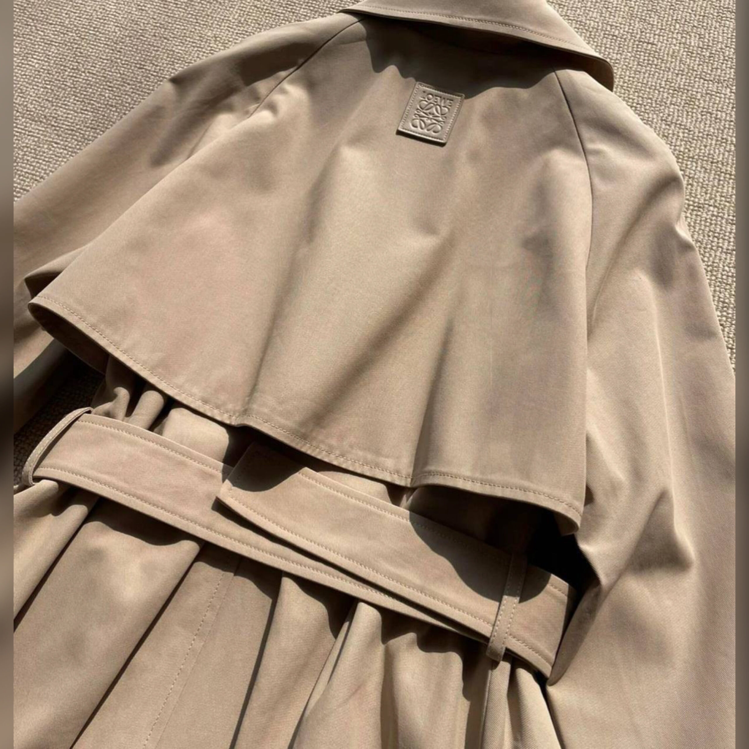 Дизайнеры марки добавили этому тренчу динамики, сделав крой расклешенным, а подол— объемным. В результате плотный хлопок собирается в мягкие складки, делая силуэт женственным. С бежевой тканью сочетается кожаная нашивка с тисненой анаграммой, расположенная сзади. Модель вошла в весенне-летнюю коллекцию марки, основанной Энрике Лоэве.