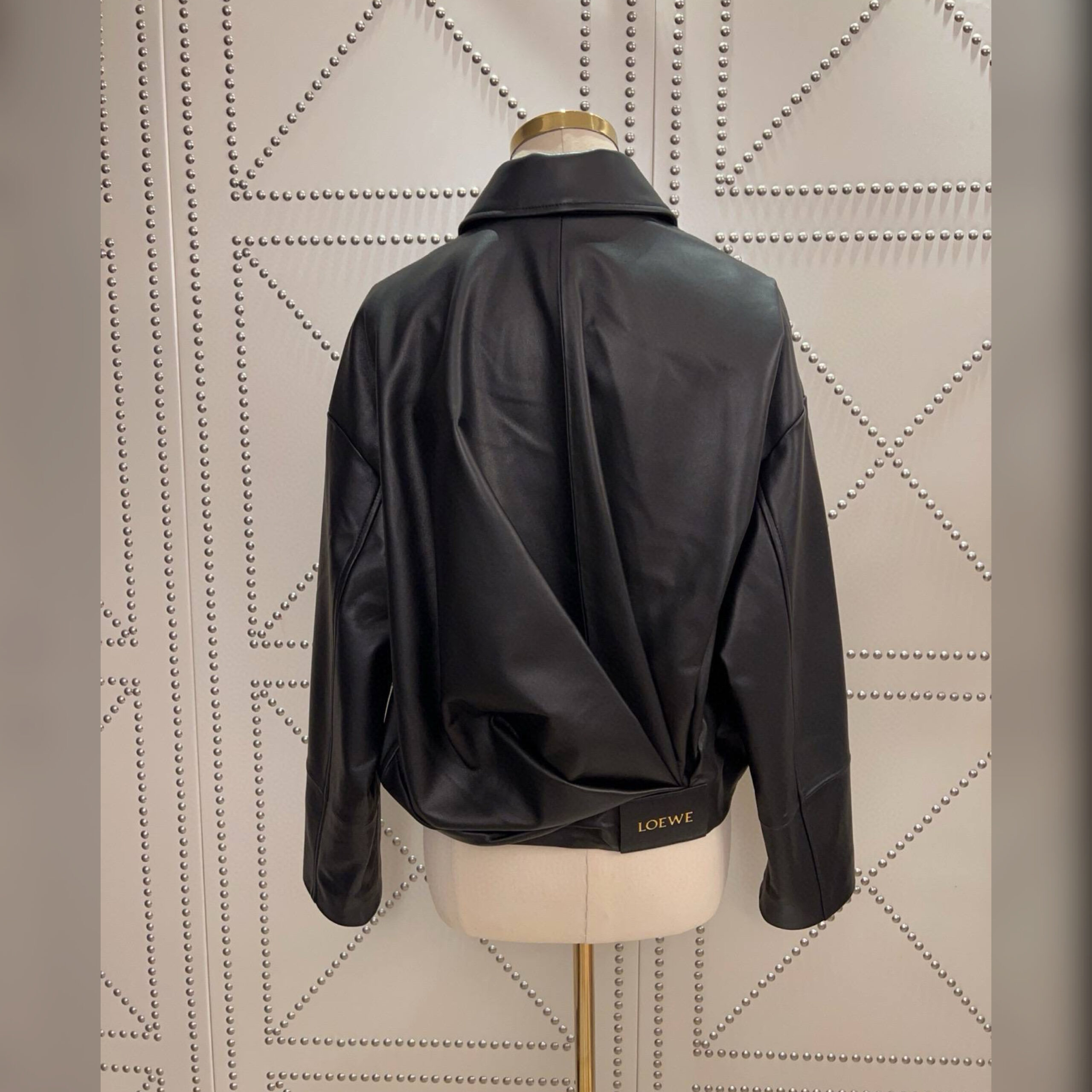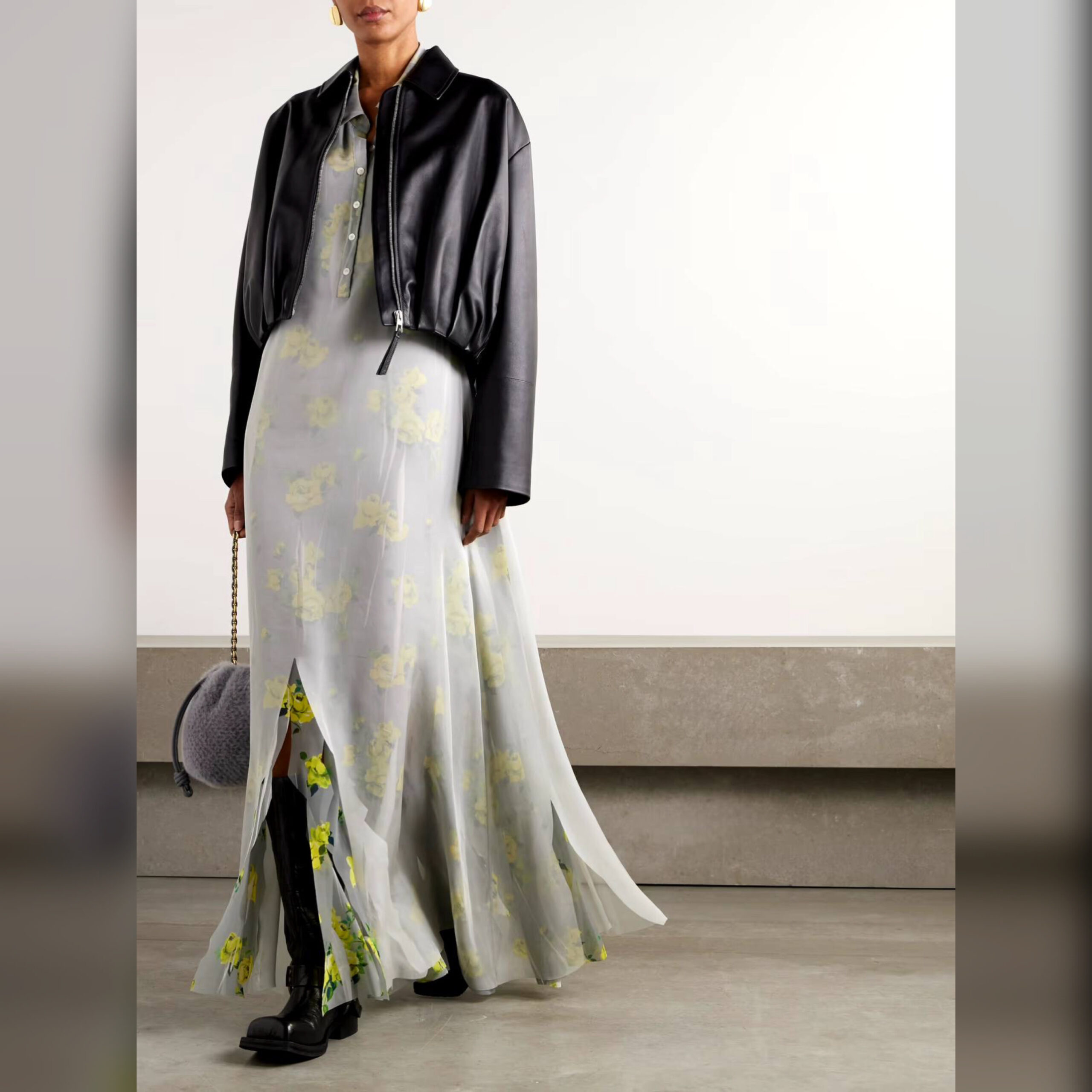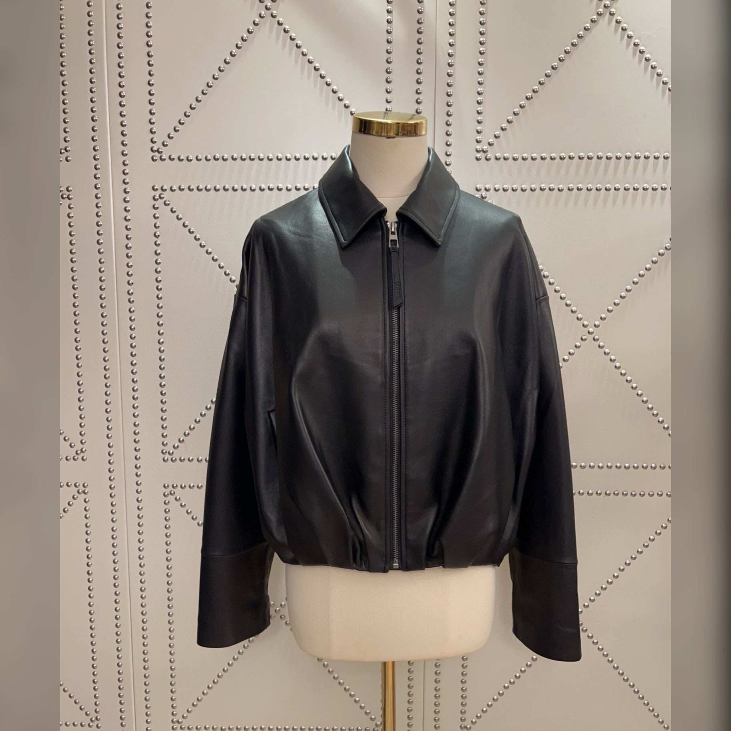 Куртку силуэта oversize будто позаимствовали из мужского гардероба. Модель, застегивающуюся на молнию, сшили из прочной мягкой кожи, фактуру которой подчеркнули деликатной полировкой. Укороченное изделие с отложным воротником дополнили драпировкой и кожаным логотипом марки сзади, а так же фирменным тиснением на пуллере.