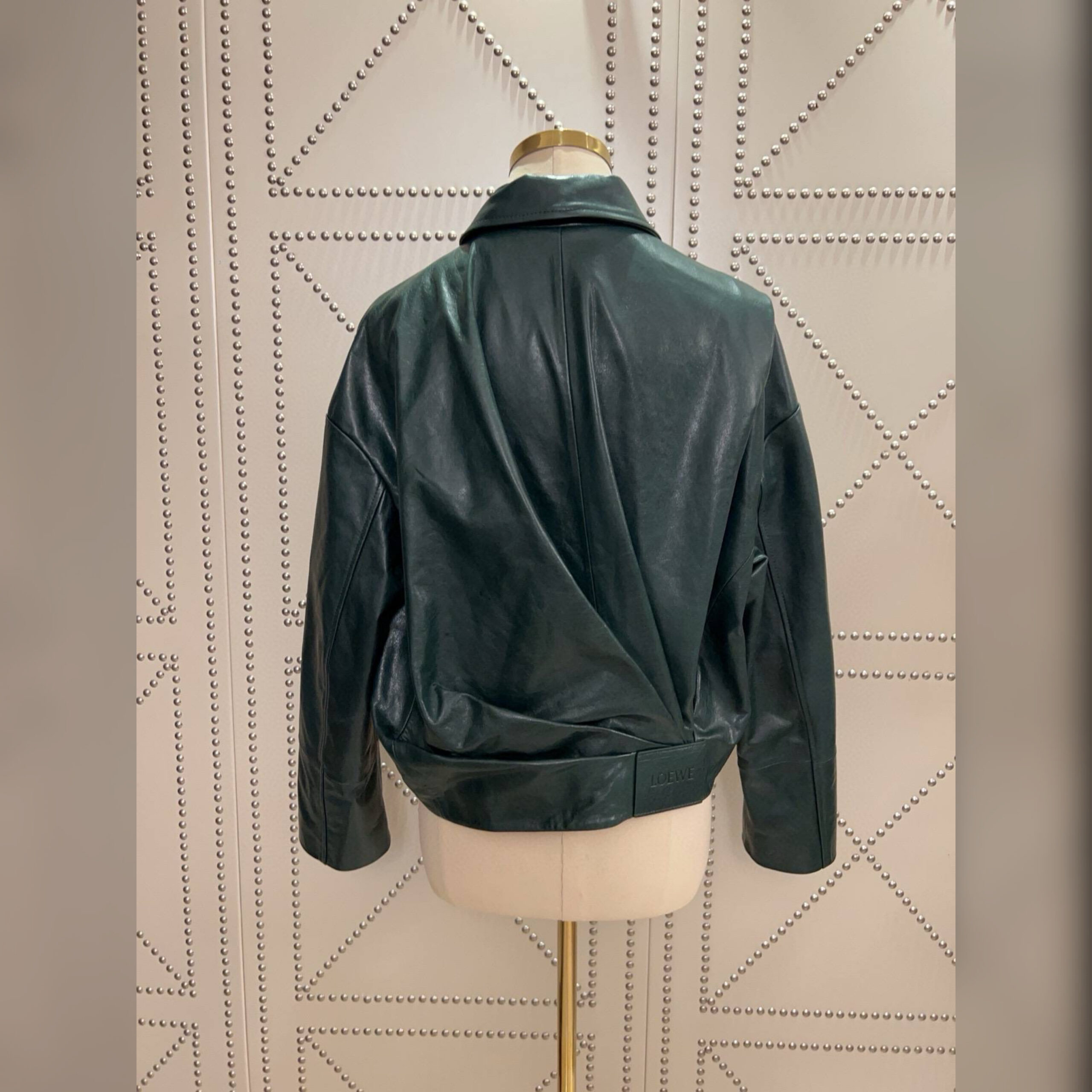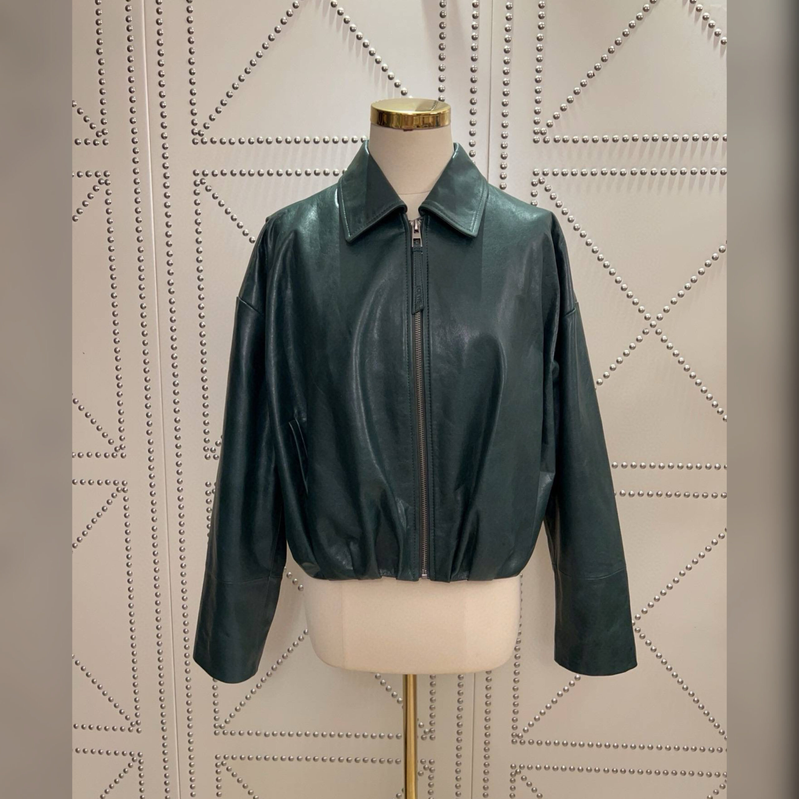 Куртку силуэта oversize будто позаимствовали из мужского гардероба. Модель, застегивающуюся на молнию, сшили из прочной мягкой кожи, фактуру которой подчеркнули деликатной полировкой. Укороченное изделие с отложным воротником дополнили драпировкой и кожаным логотипом марки сзади, а так же фирменным тиснением на пуллере.