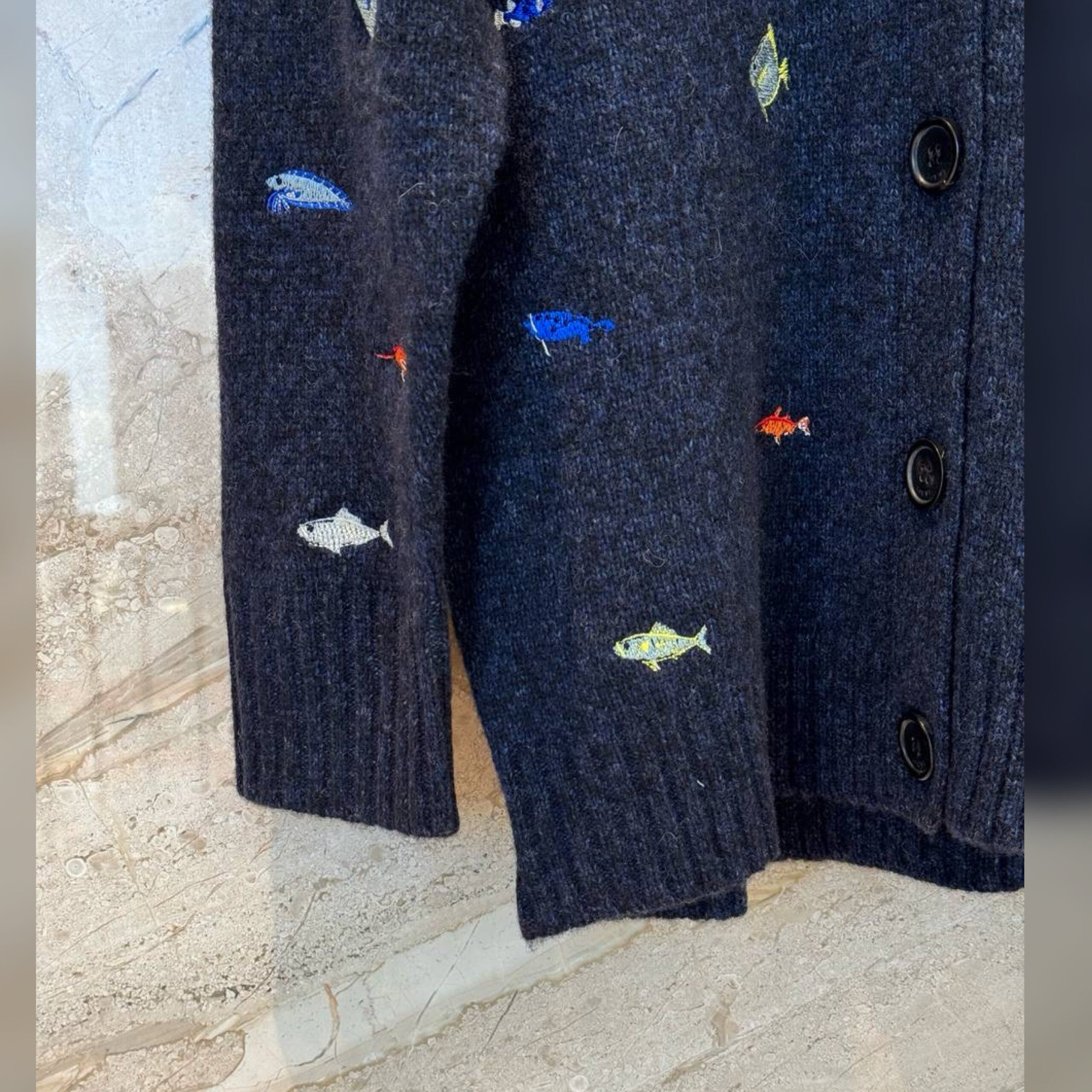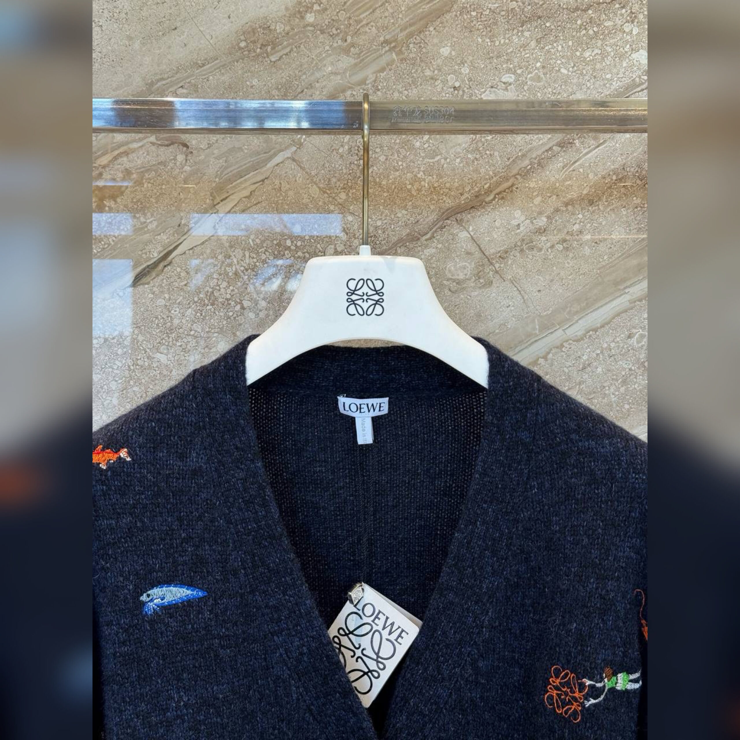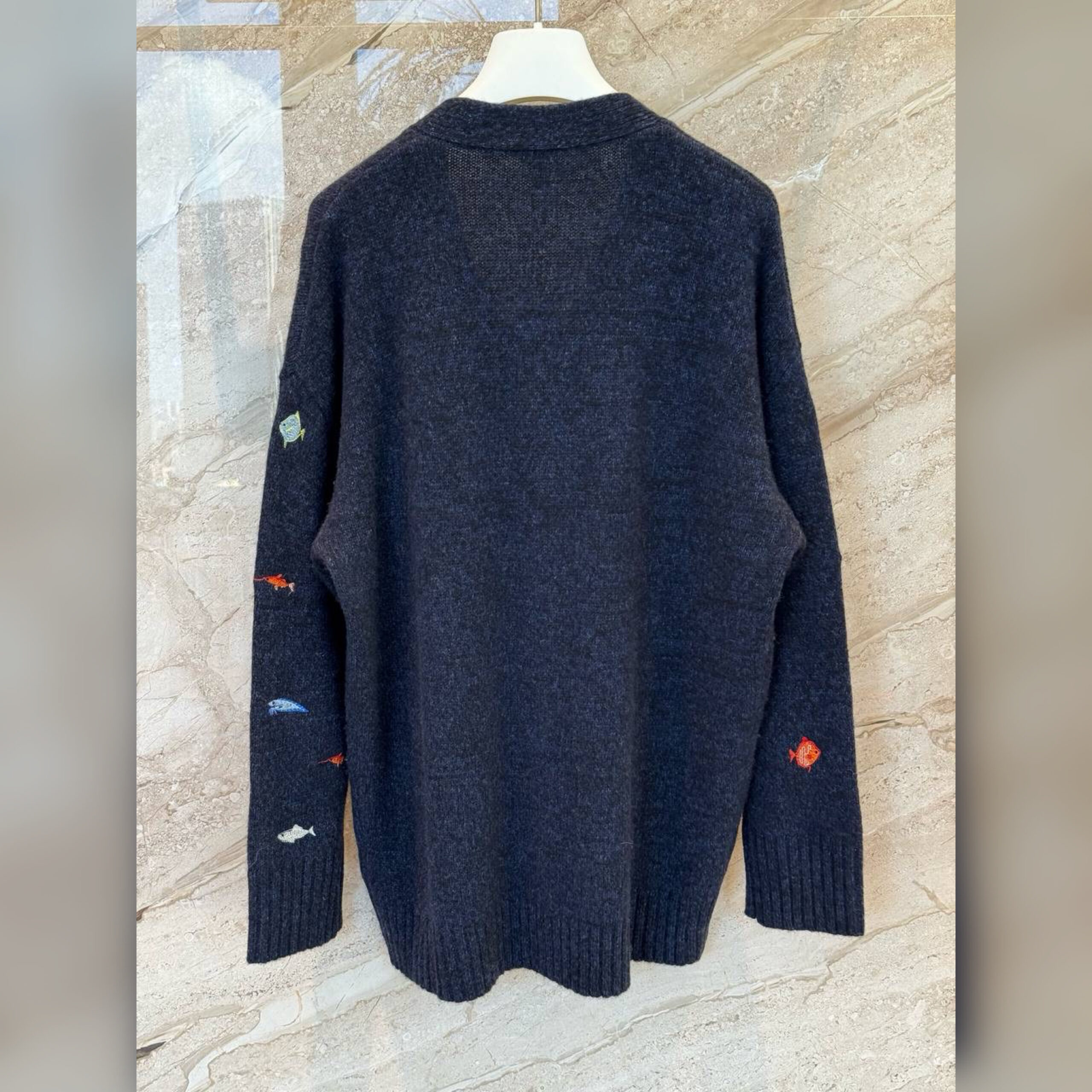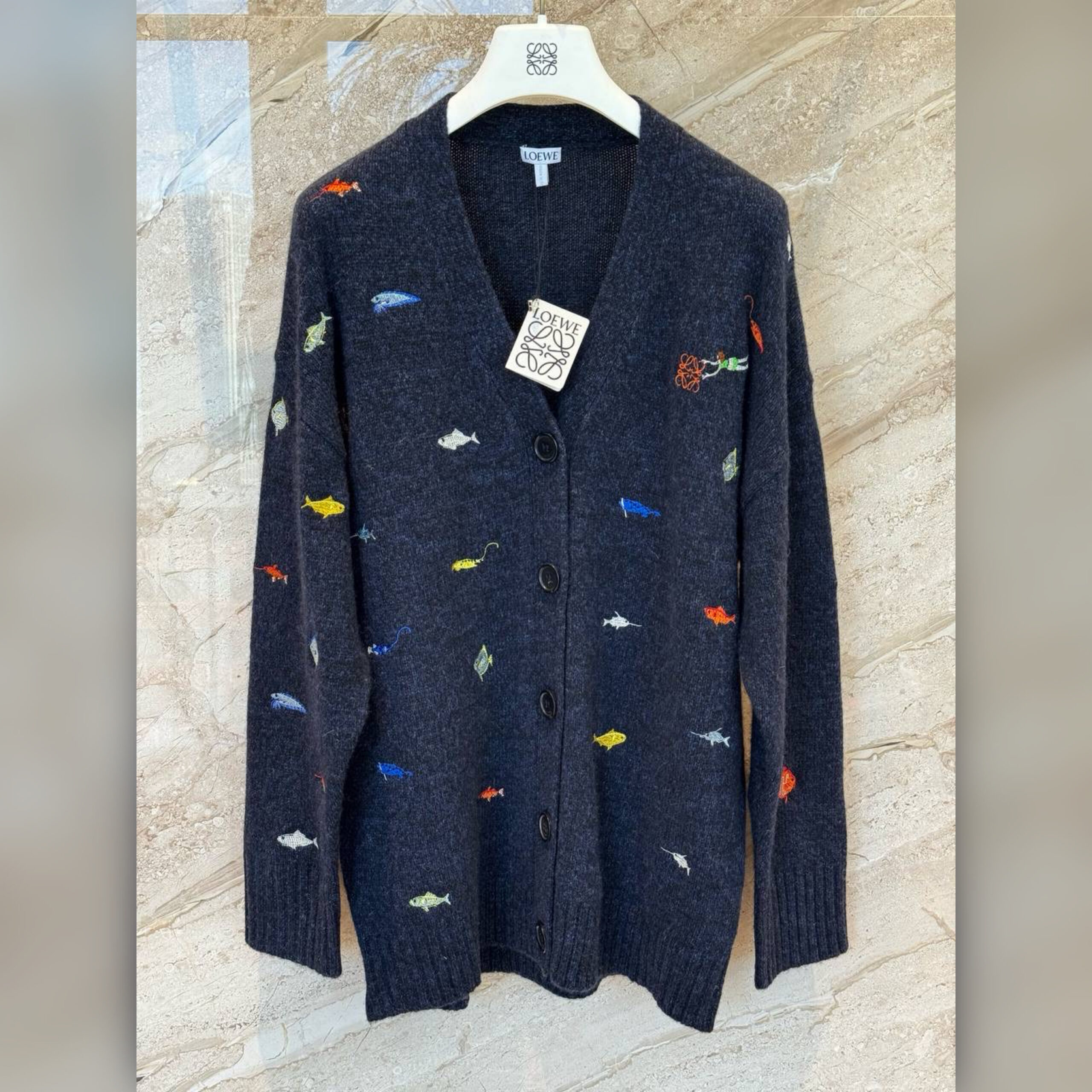 В случае с кардиганом Джонатан Андерсон оставил расслабленный силуэт без акцентных деталей, что помогло перенести фокус на декор. Дизайнер украсил модель яркими изображениями морских обитателей. Эти элементы создали вручную, используя вышивку. Мастера марки, основанной Энрике Лоэве, выполнили изделие из мягкой пряжи на основе шерсти.