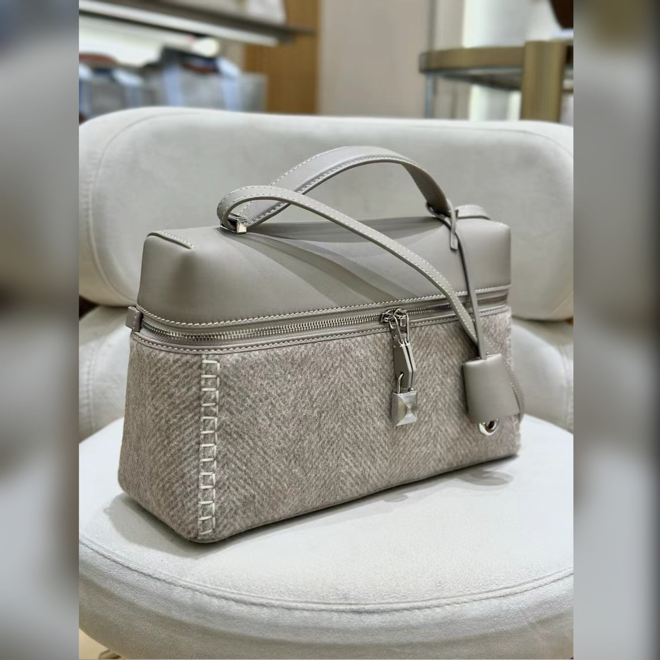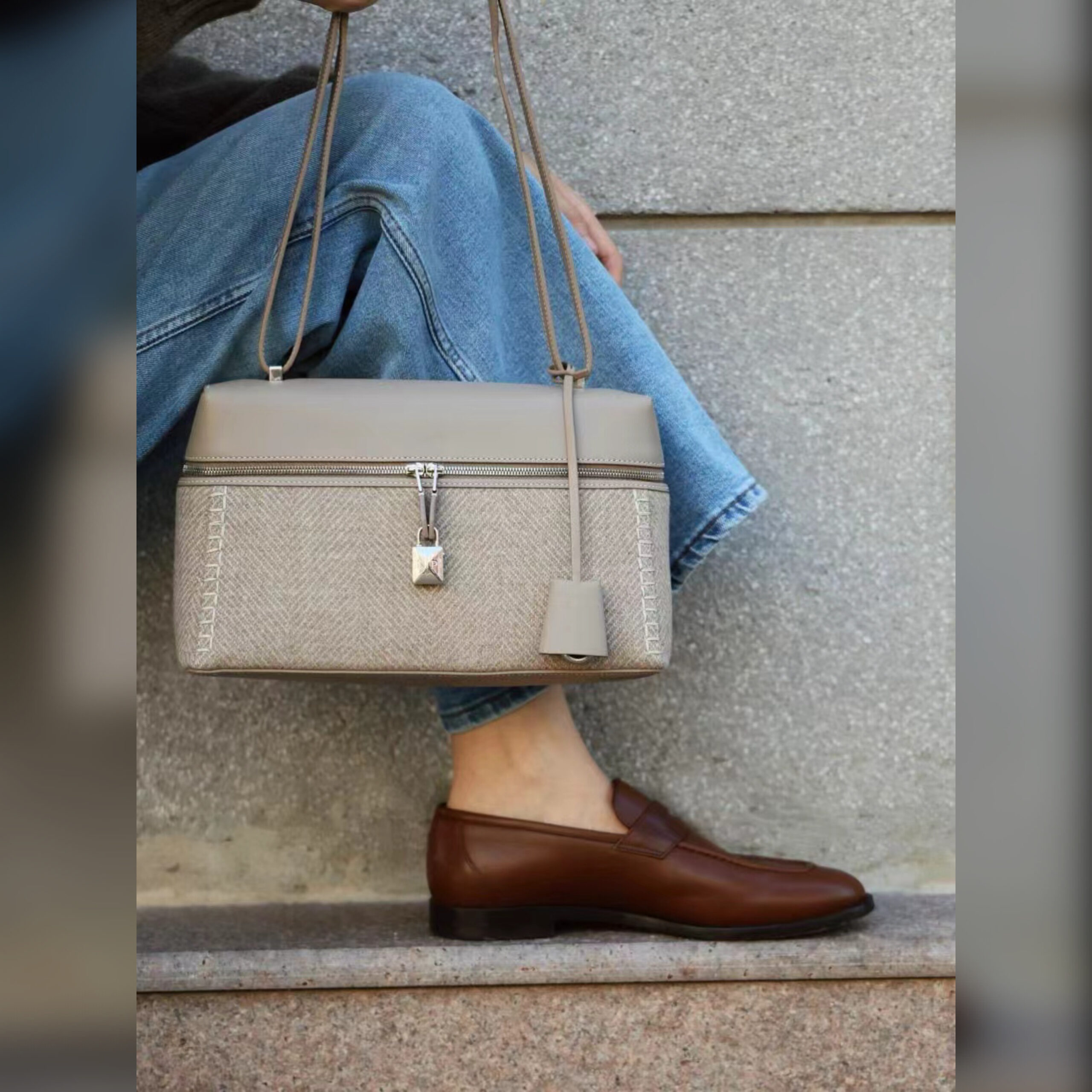 Сумка Extra Bag может занять место любимой модели на каждый день. Нейтральный цвет позволяет ей рифмоваться с любым образом, а крой гарантирует вместительность—внутрь войдет даже небольшой складной зонт. Аксессуар с двойным скользящим плечевым ремнем мастера марки, основанной Пьетро Лоро Пьяна, сшили из мягкой телячьей кожи и фирменной ткани Pecora Nera с элегантным шевронным мотивом, состоящей из овечьей шерсти и мериноса.