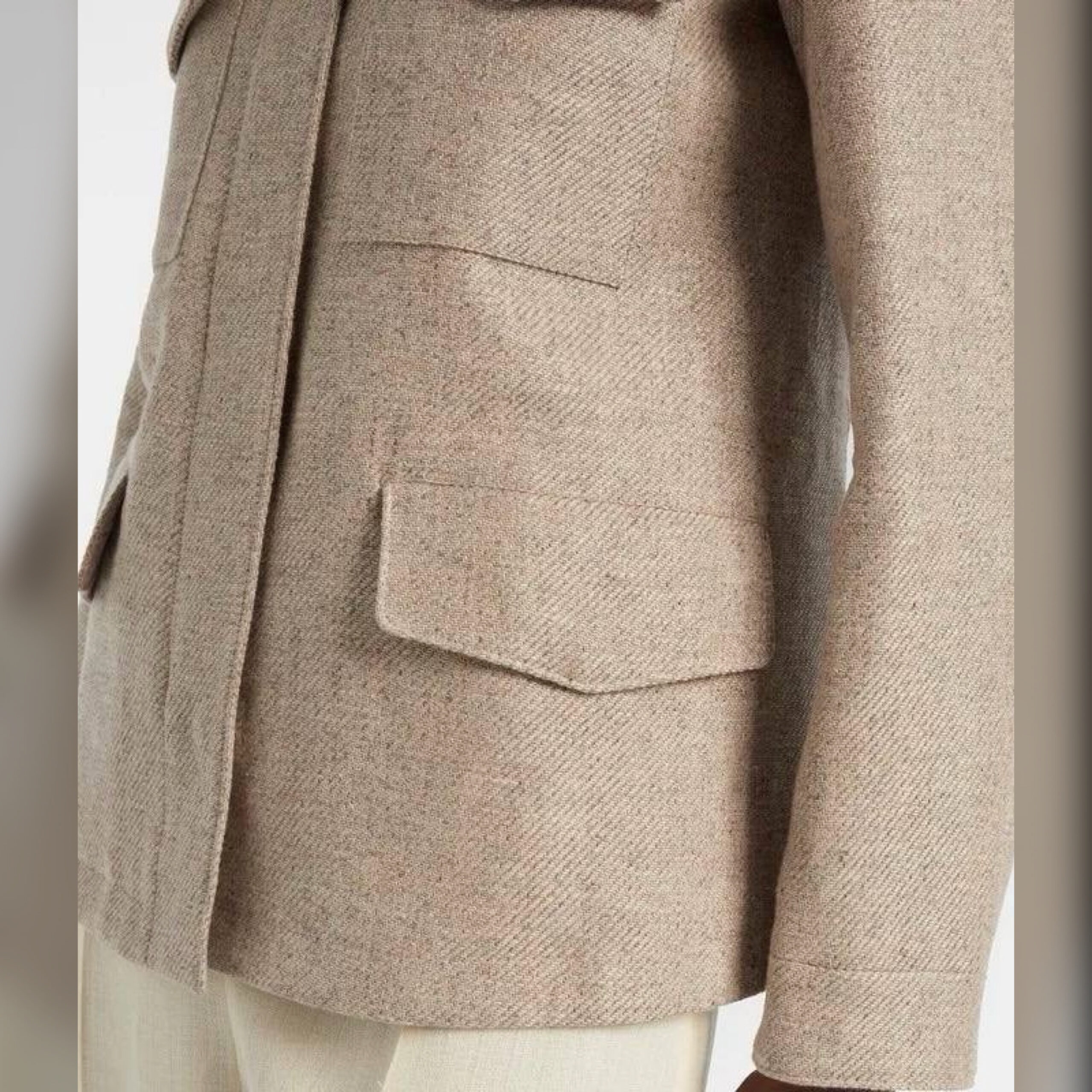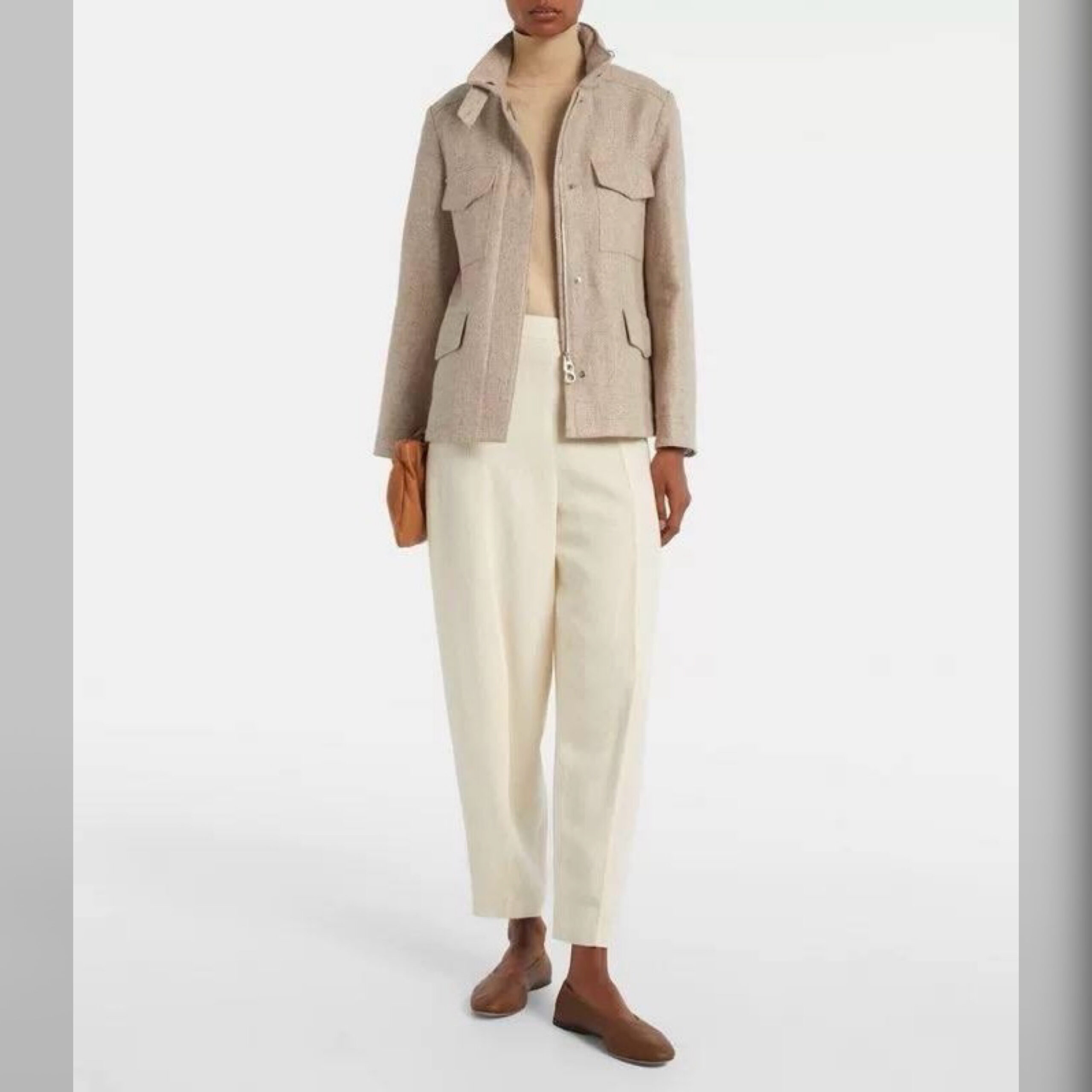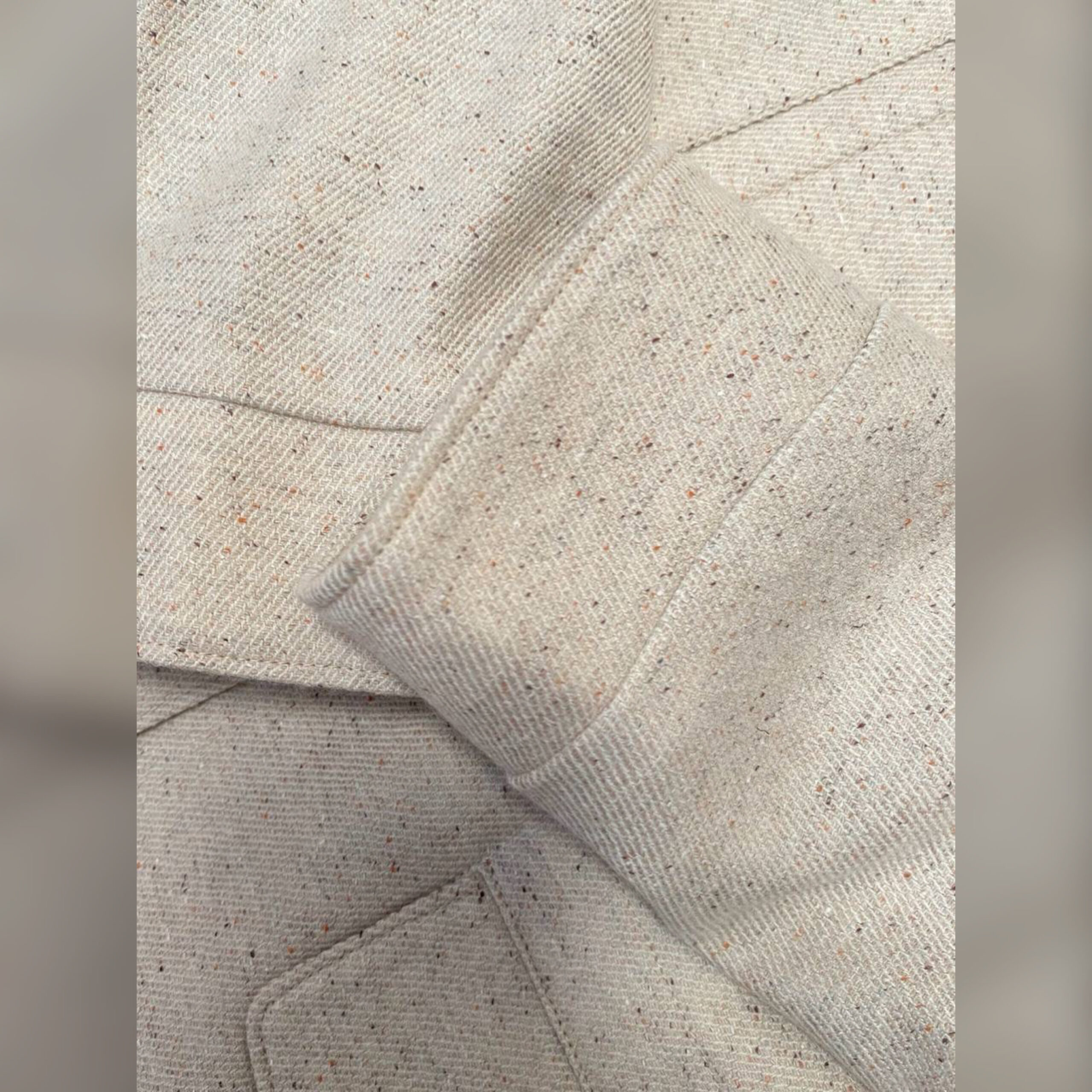 Вещь выполнили из льна и хлопкового твида, комбинация толстой и тонкой нити которых создают необычайно приятный тактильный эффект и тонкую игру цвета.