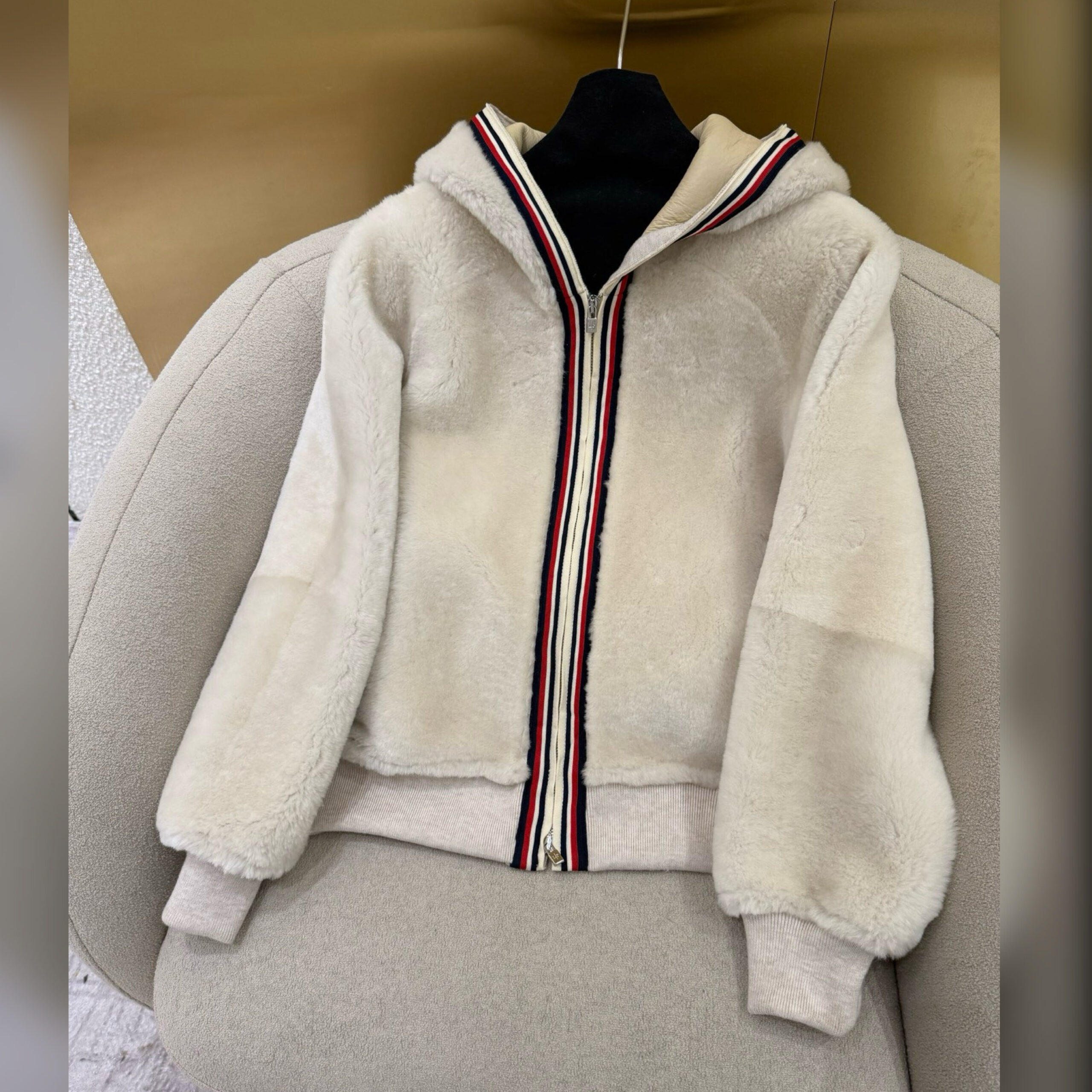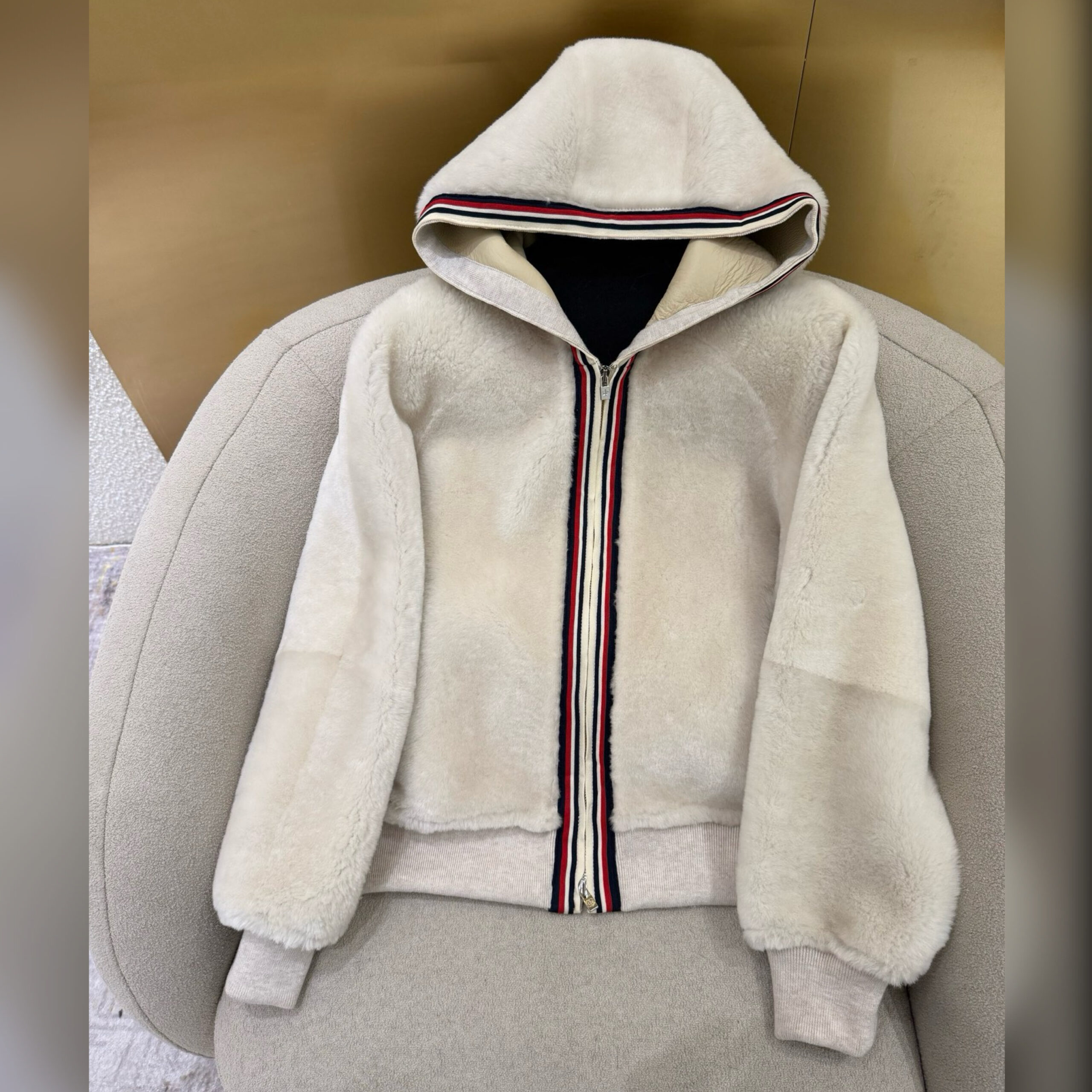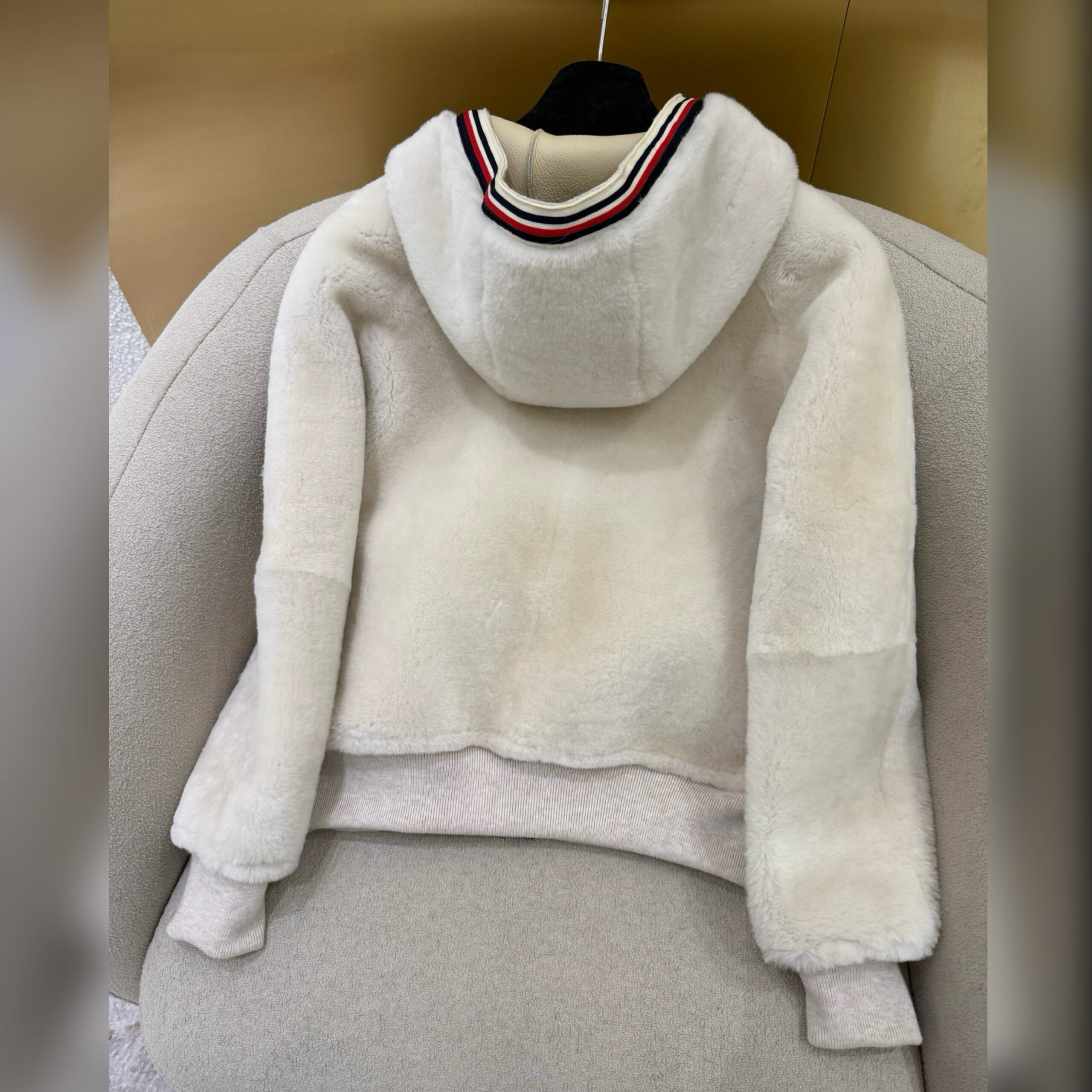 Куртку с объемным уютным капюшоном выполнили из плотной эластичной овчины.