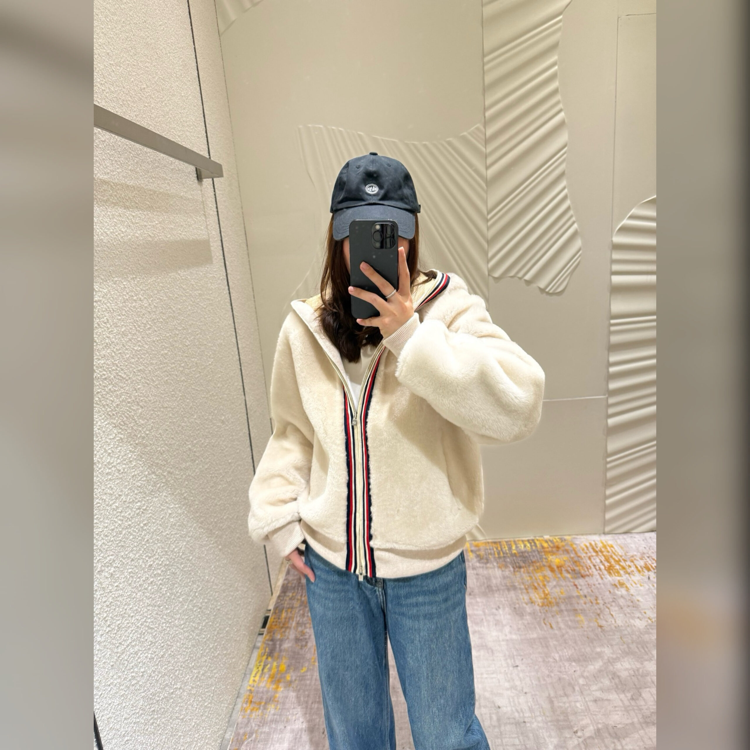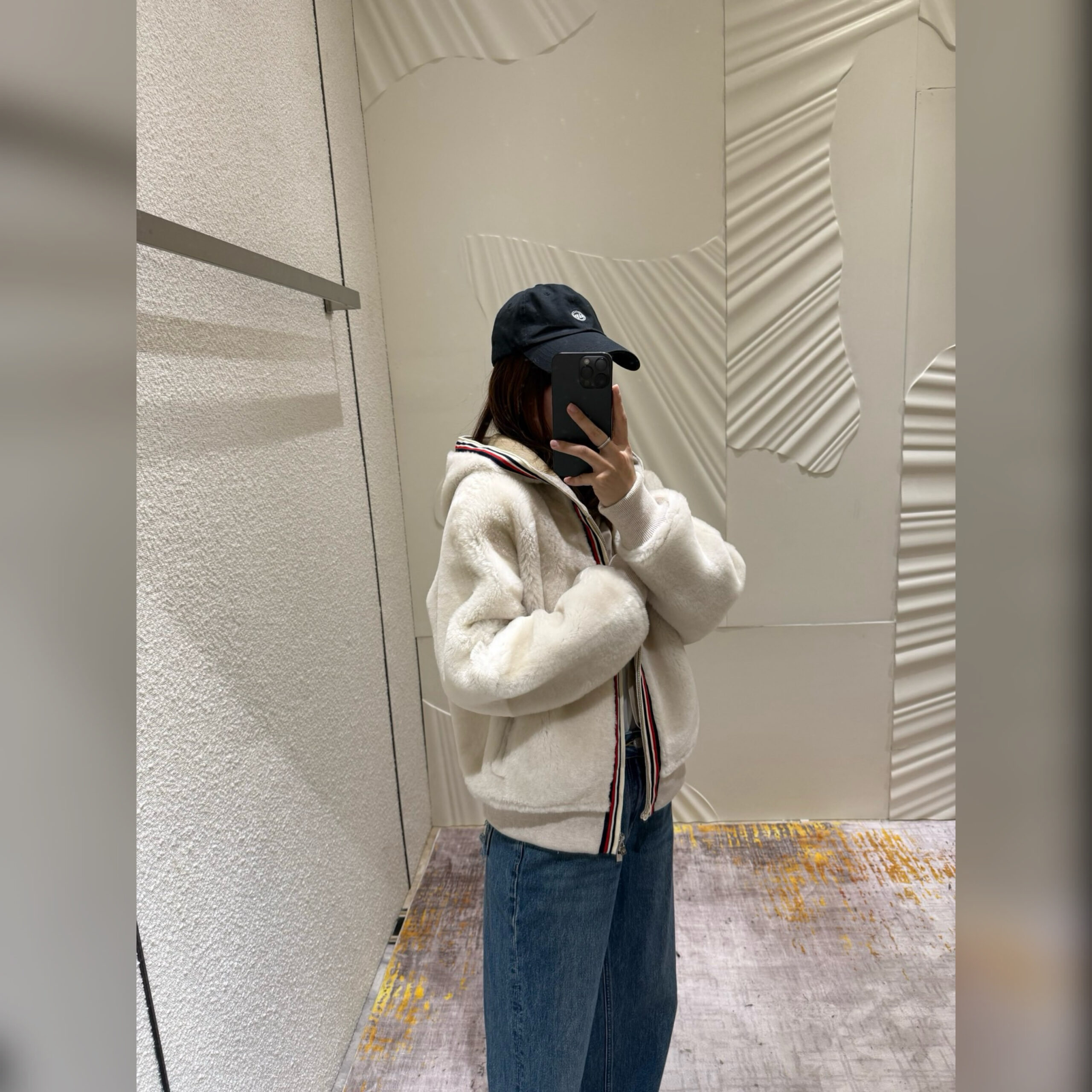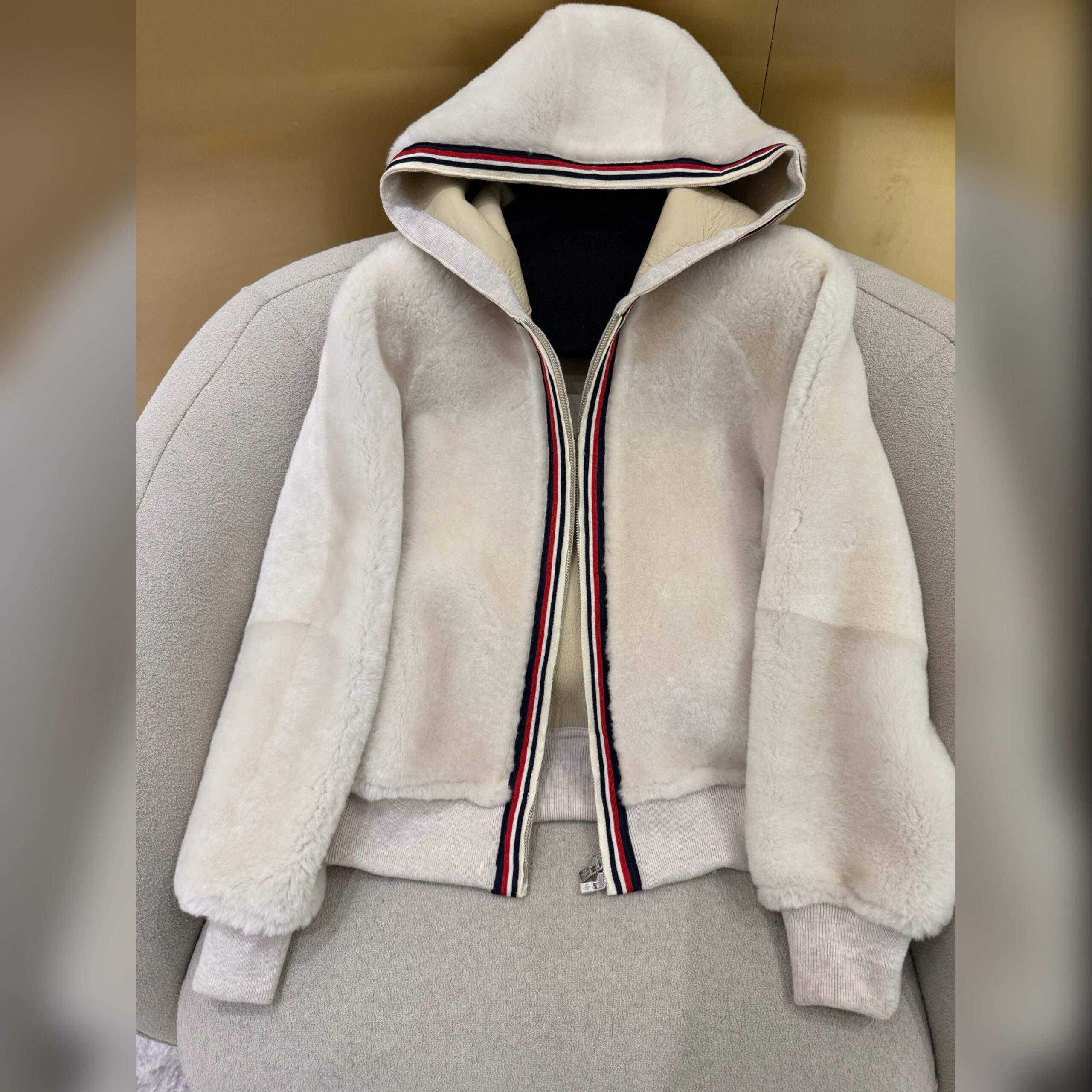 Куртку с объемным уютным капюшоном выполнили из плотной эластичной овчины.