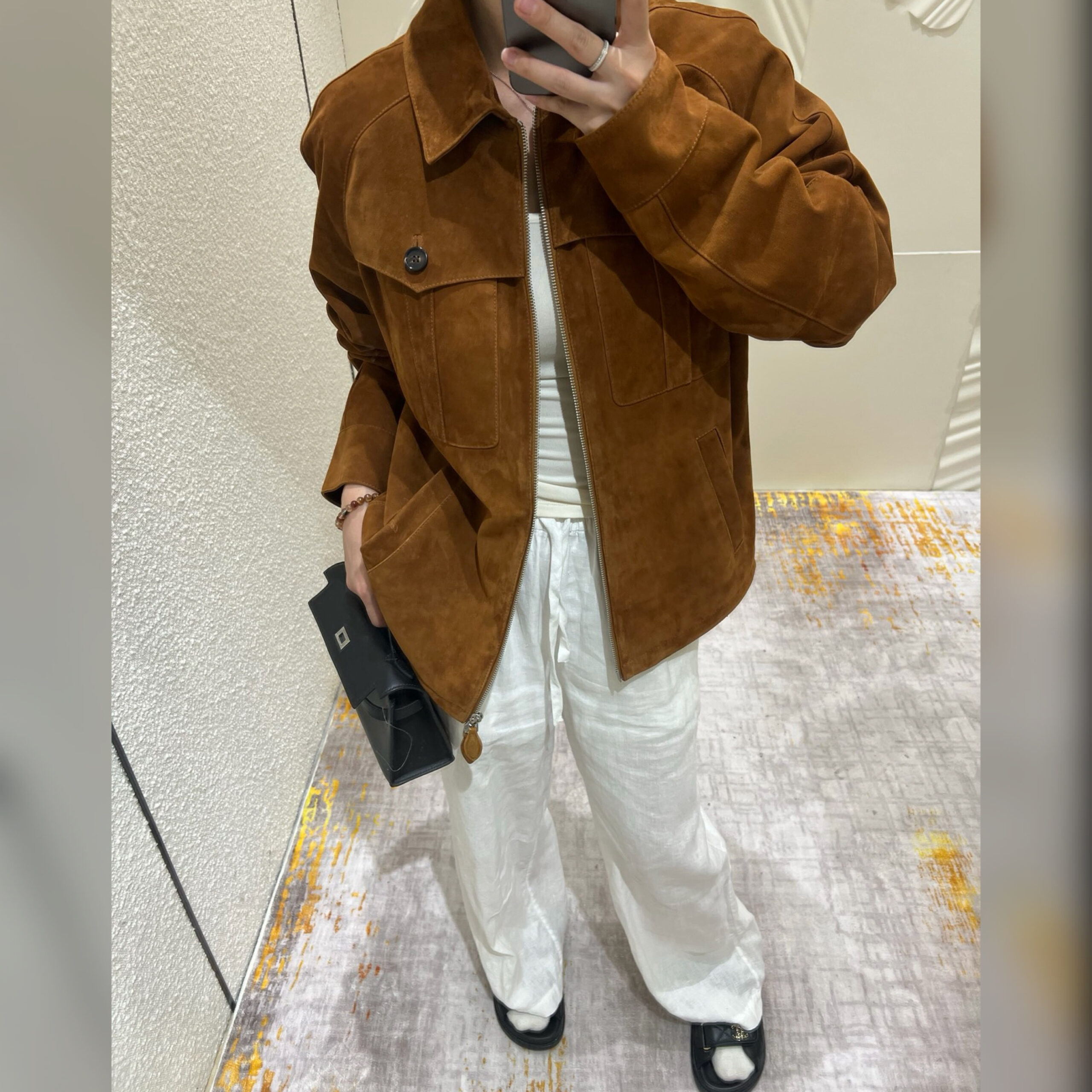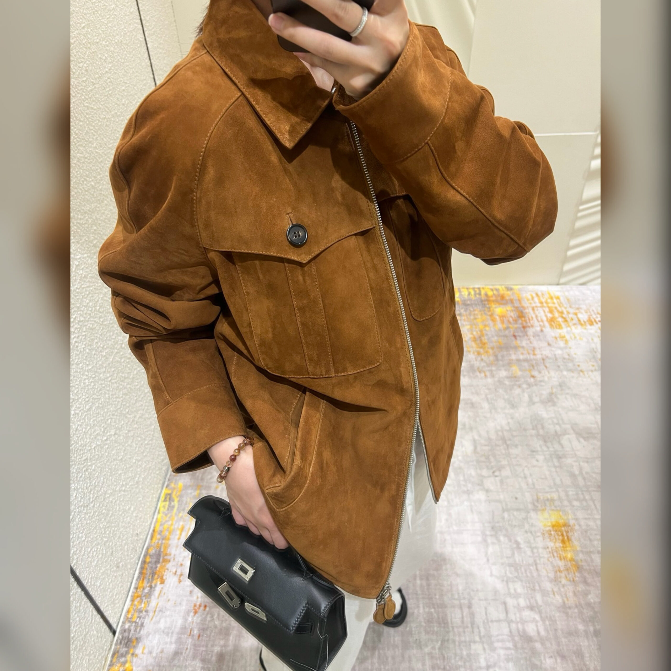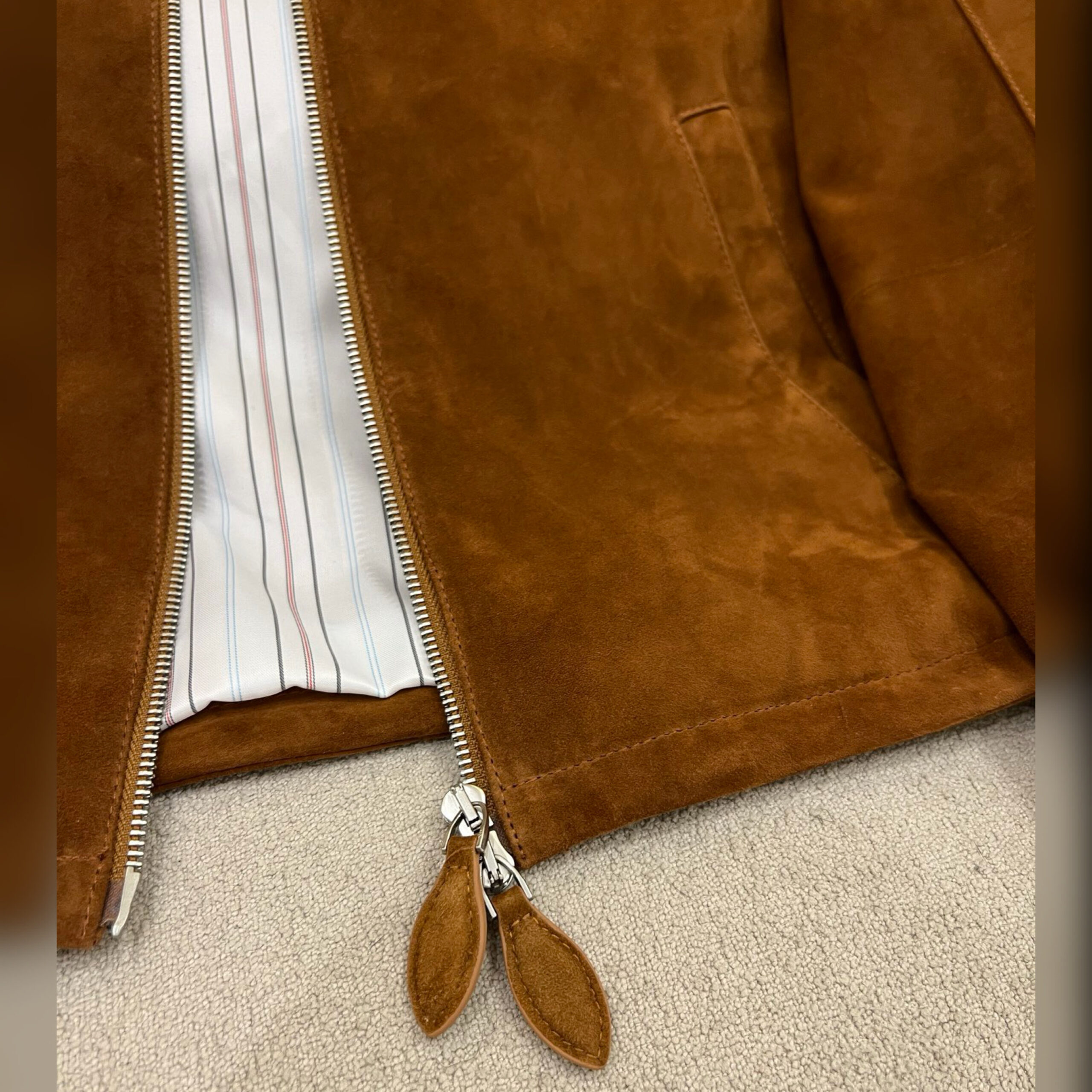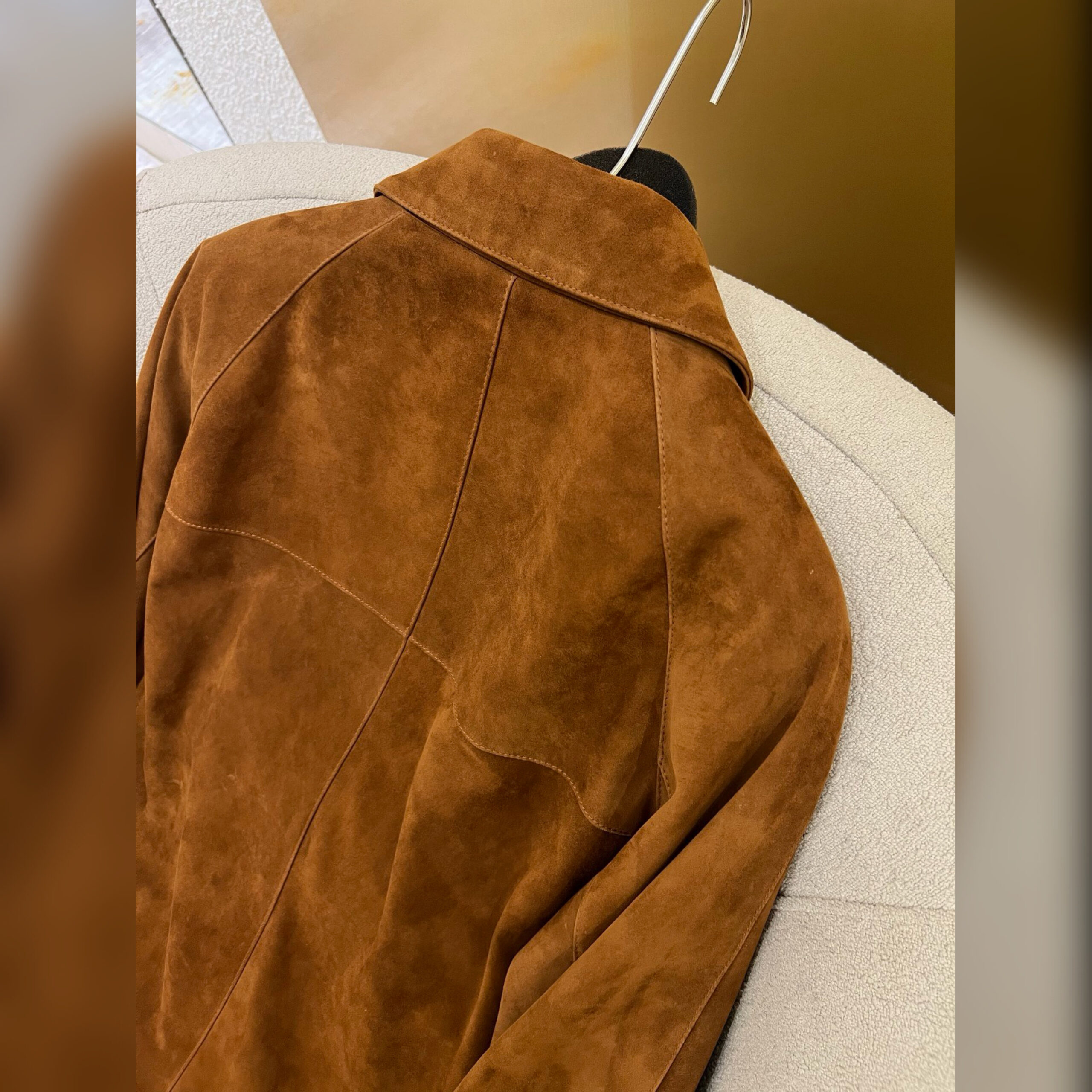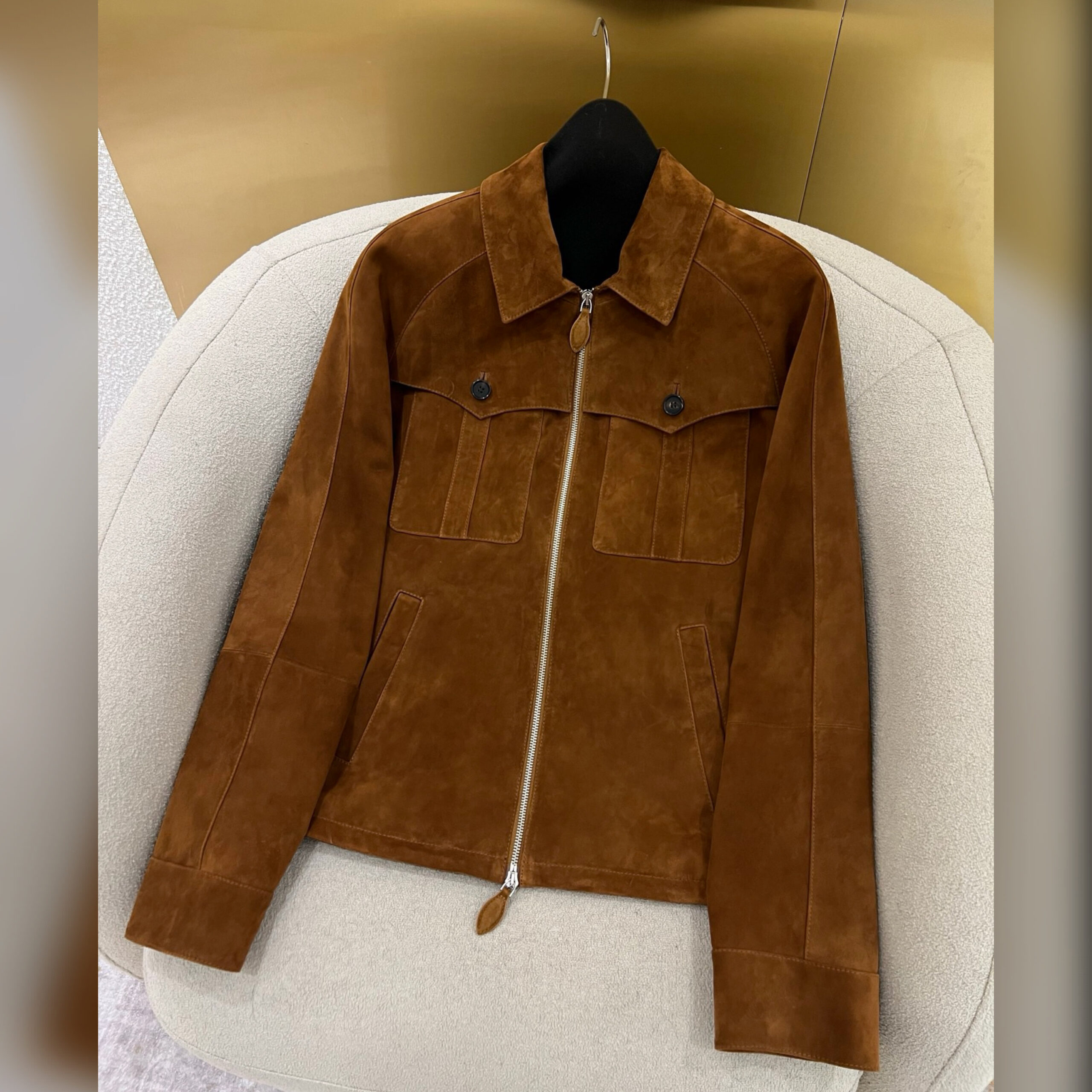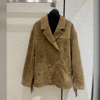 Куртка цвета арахисовой пасты вошла в весенне-летнюю коллекцию. Модель выполнена из мягкой эластичной замши. Характерная бархатистая фактура придает материалу неоднородный оттенок и полутона, поэтому нет двух одинаковых вещей. Изделие с двумя накладными и парой врезных карманов застегивается встречной молнией с пуллерами в тон.