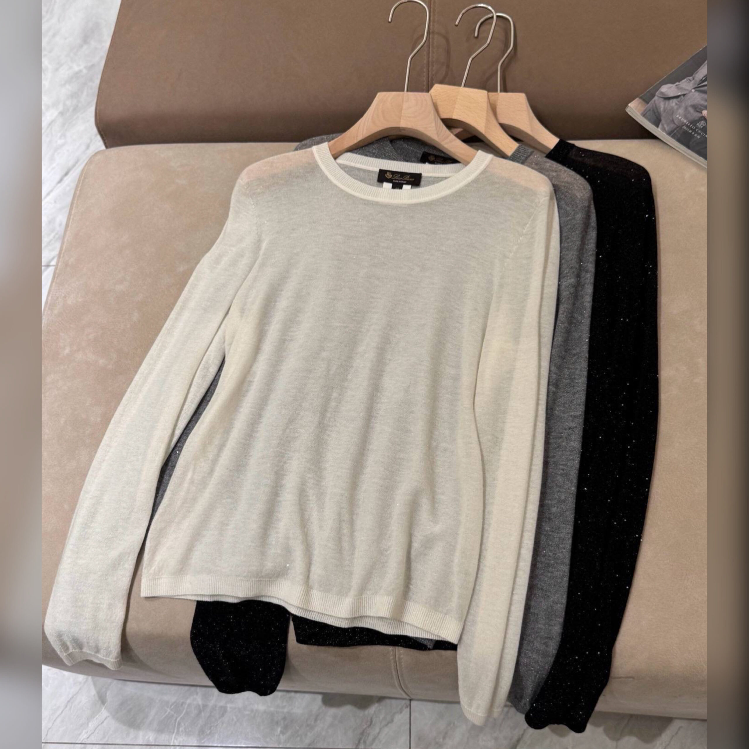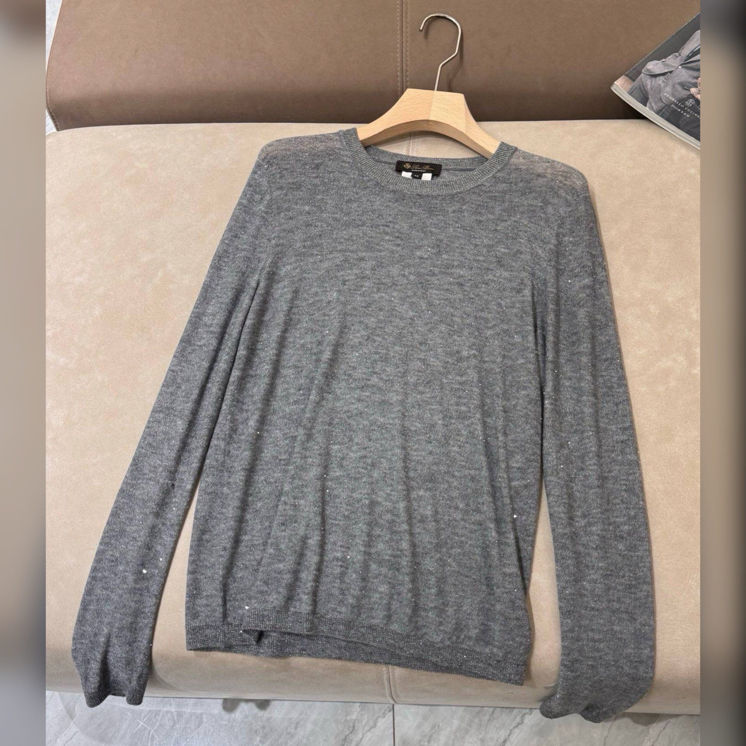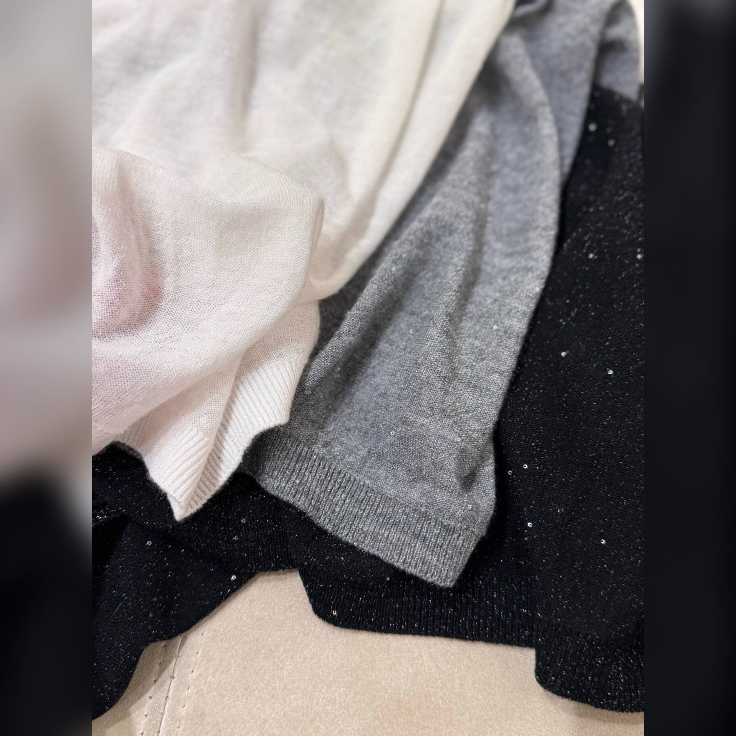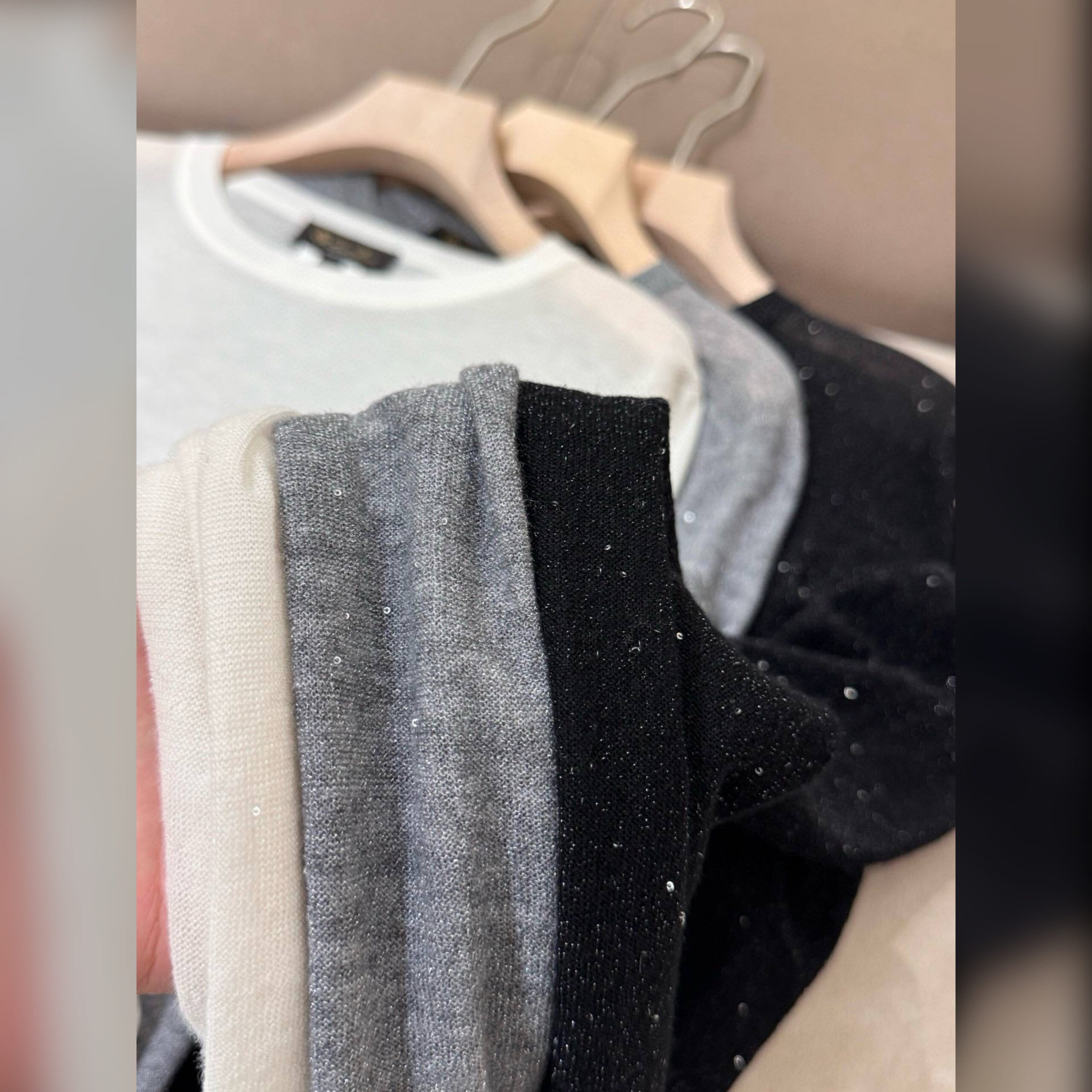 Джемпер с ребристыми манжетами, поясом и круглой горловиной выполнили из микса кашемира и шерсти. Модель украсили миниатюрными пайетками, вплетенными в пряжу.