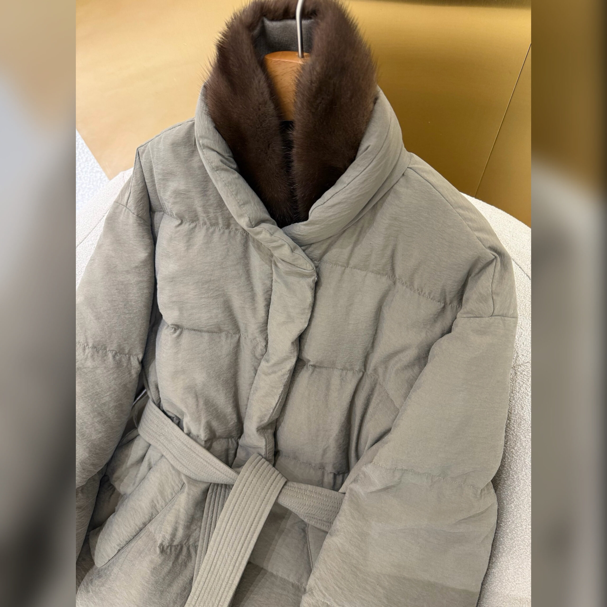 Чтобы в таком пуховике было еще комфортнее в непогоду, изделие дополнили воротником, который оторочили пушистым мехом.