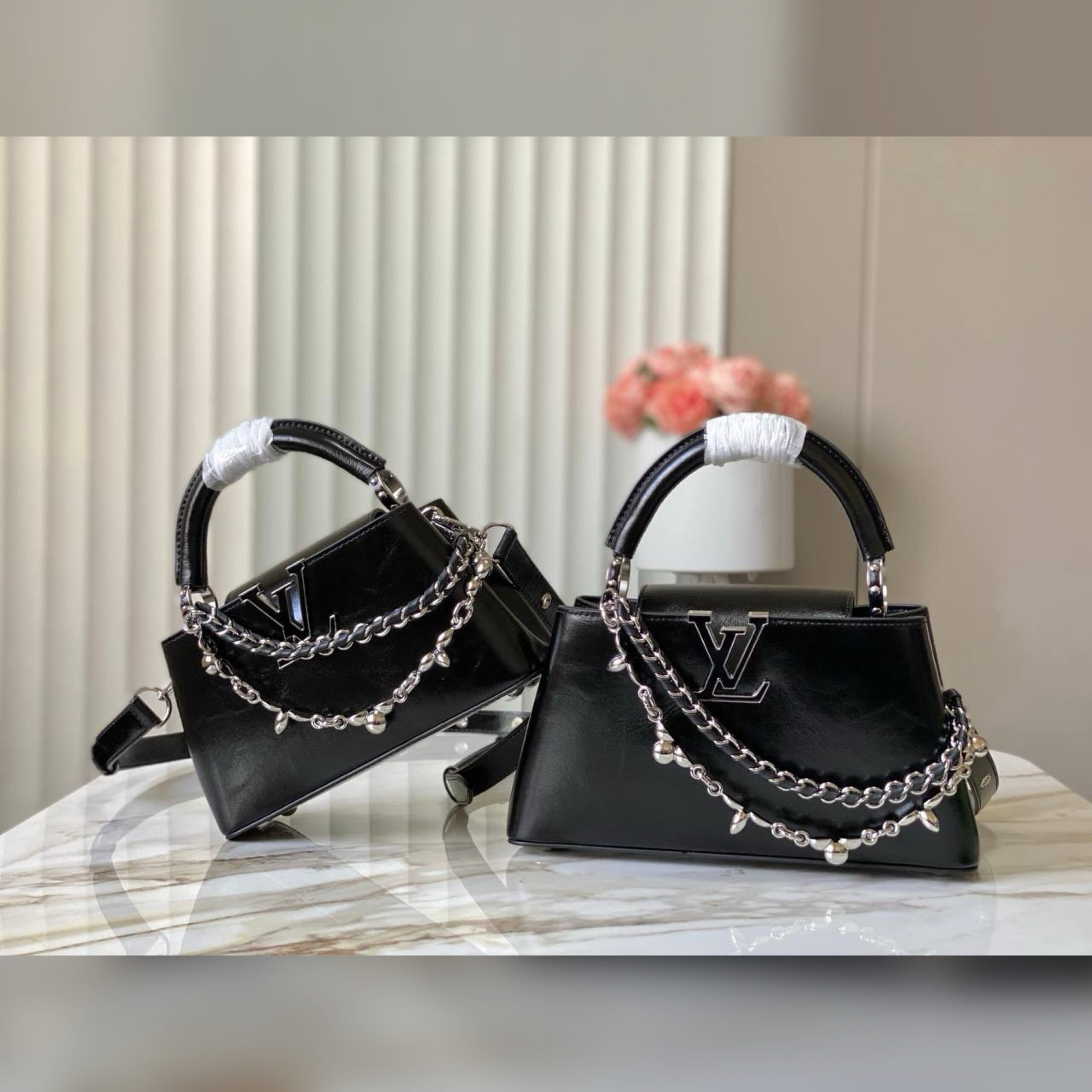 Сумка Capucines представлена в новом изысканном силуэте East West. Модель получила свое название в честь парижской улицы, где в 1854 году открылся первый бутик Louis Vuitton. Изделие демонстрирует фирменные инициалы LV и две декоративные цепи, которые можно снять при желании. Благодаря съёмному плечевому ремню лёгкий аксессуар можно носить в различных вариациях.