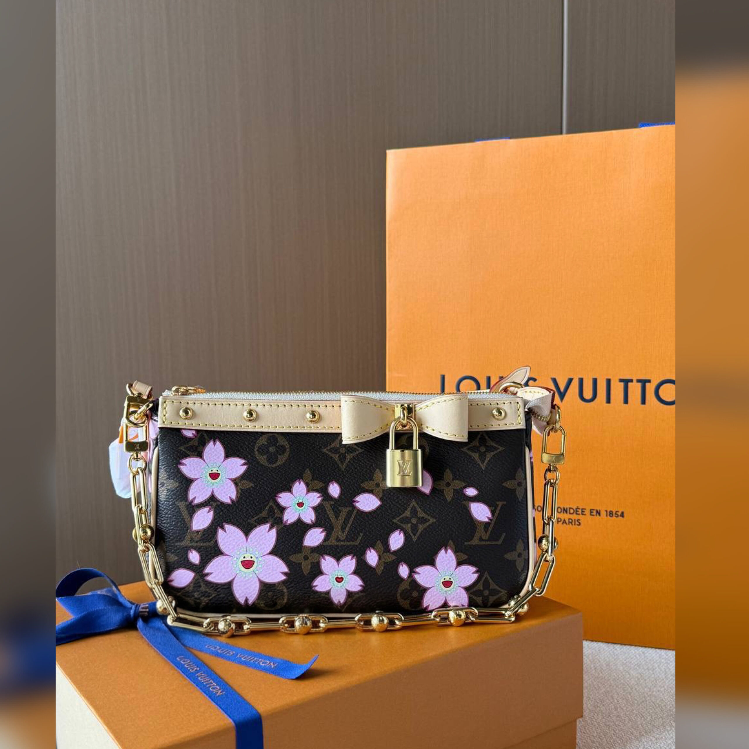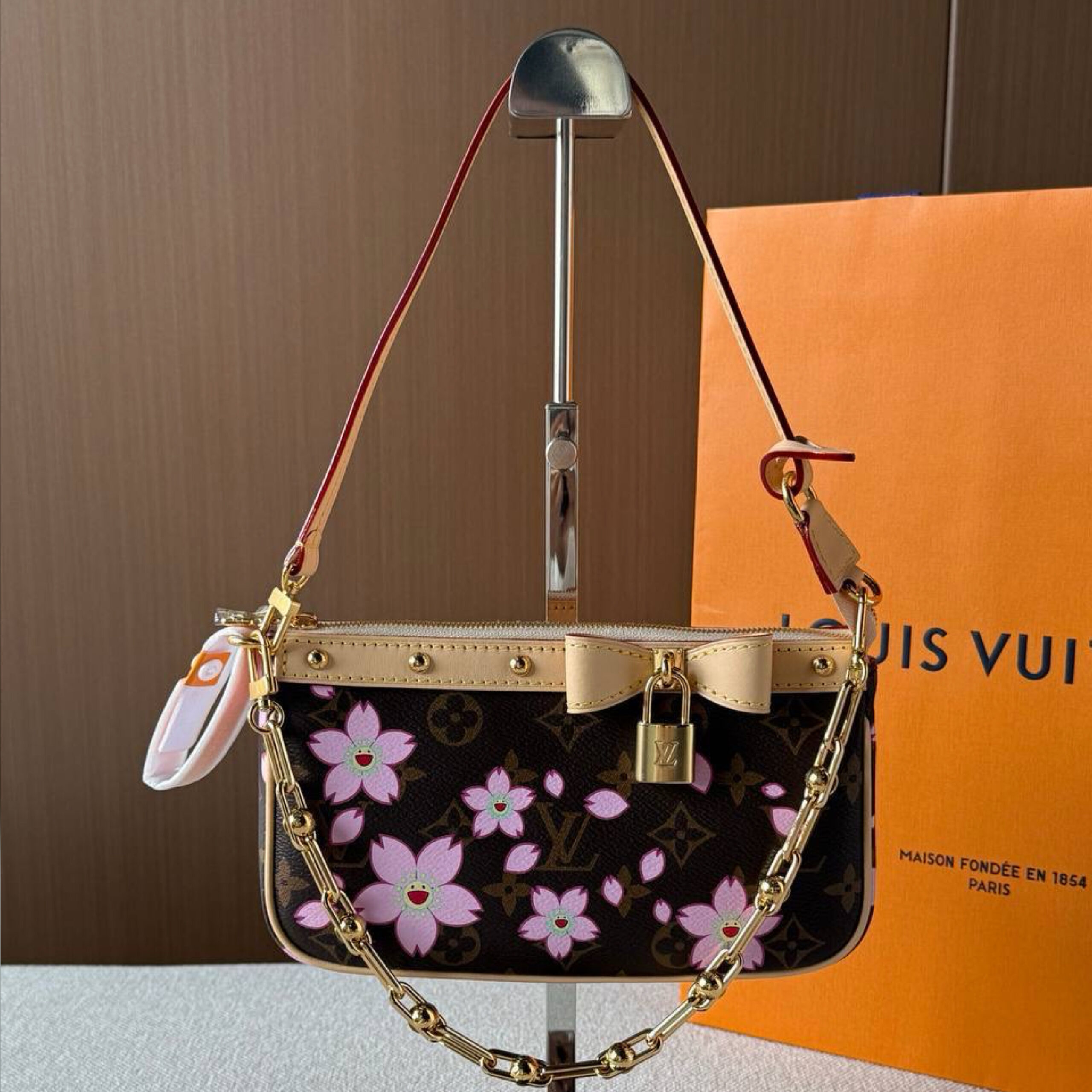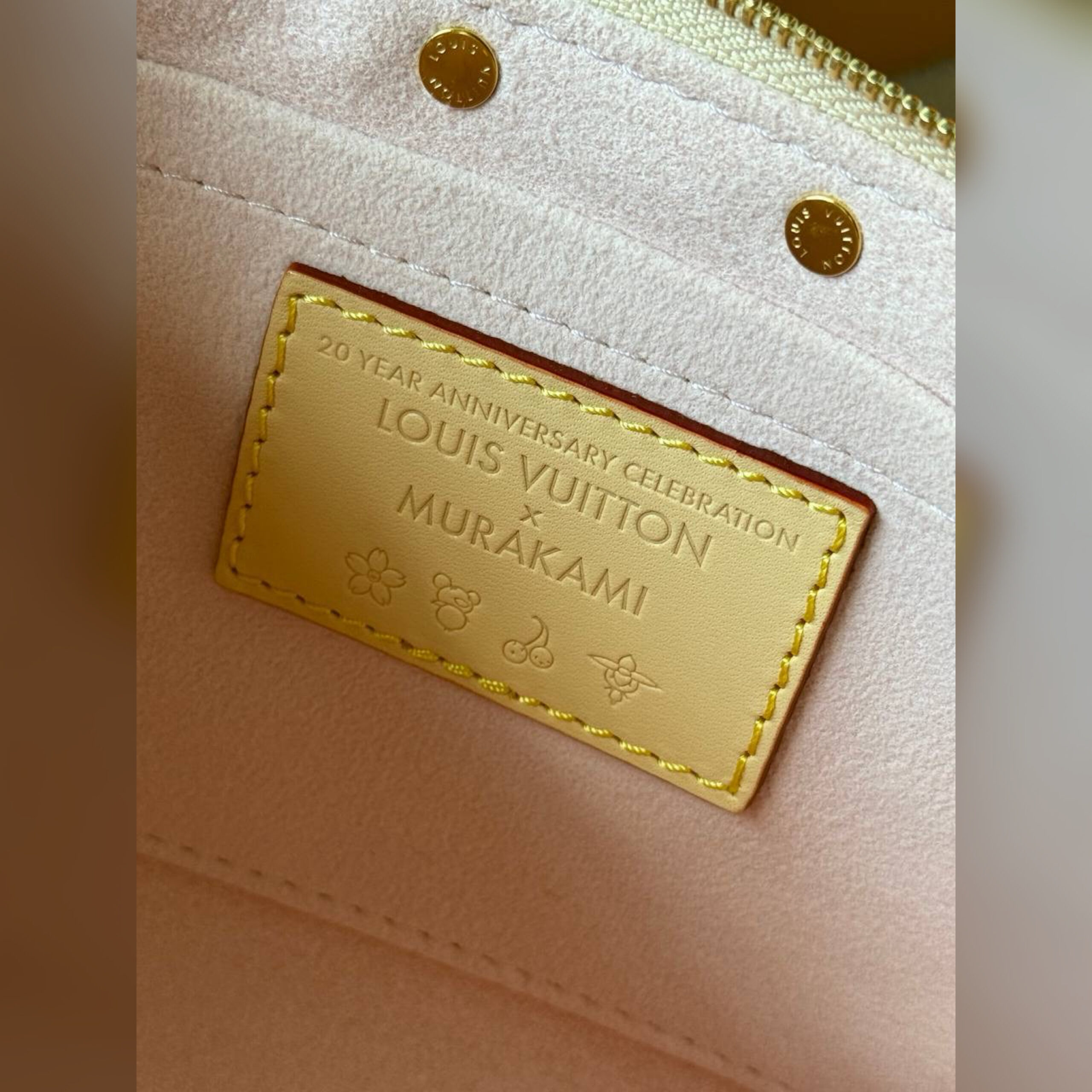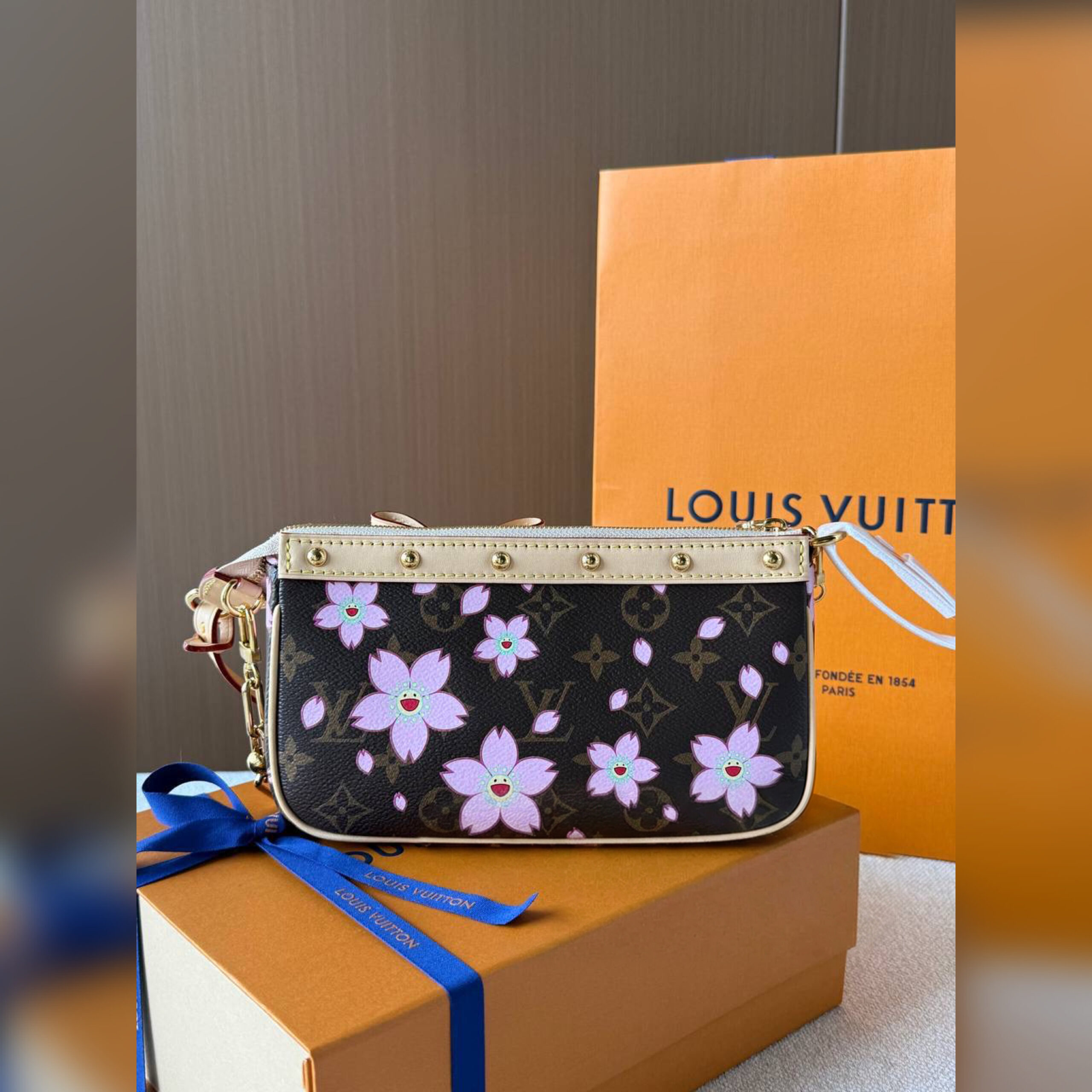 Ключевые элементы коллекции Louis Vuitton x Murakami придают сумке Pochette Accessoires выразительную ноту. Модель из легендарной канвы Monogram украшена ярким принтом в авторском стиле японского художника Такаси Мураками. Декоративный бант из кожи дополняет замок с гравировкой LV. Золотистые гвоздики и съёмная цепочка вносят в дизайн бунтарский акцент.