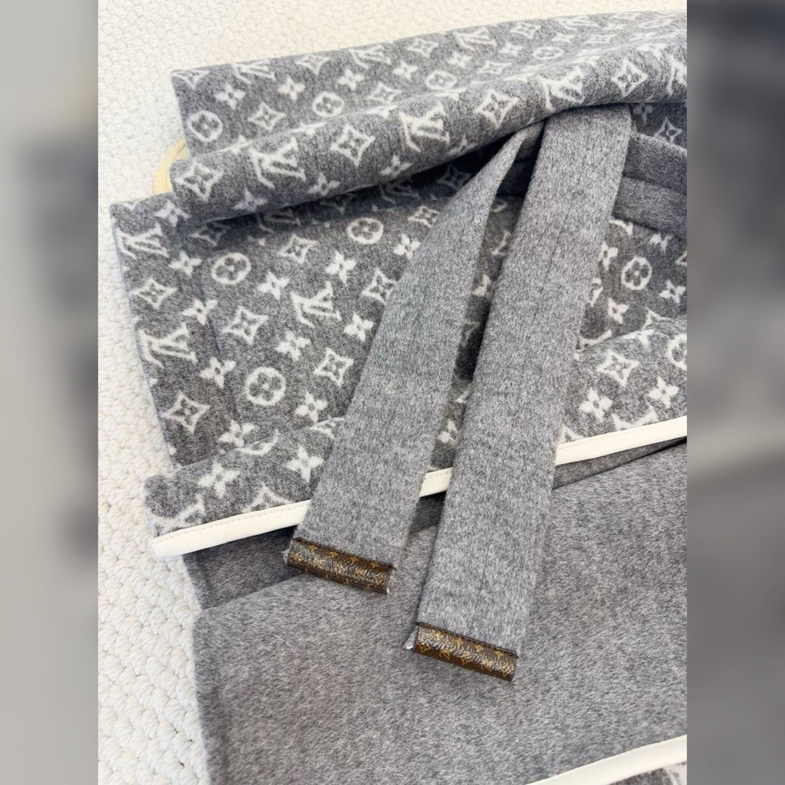 Модель дополнена искусной отделкой из кожи и канвы Monogram. Изделие украшено жаккардовым узором Monogram с одной стороны, а вторую сторону оставили однотонной.