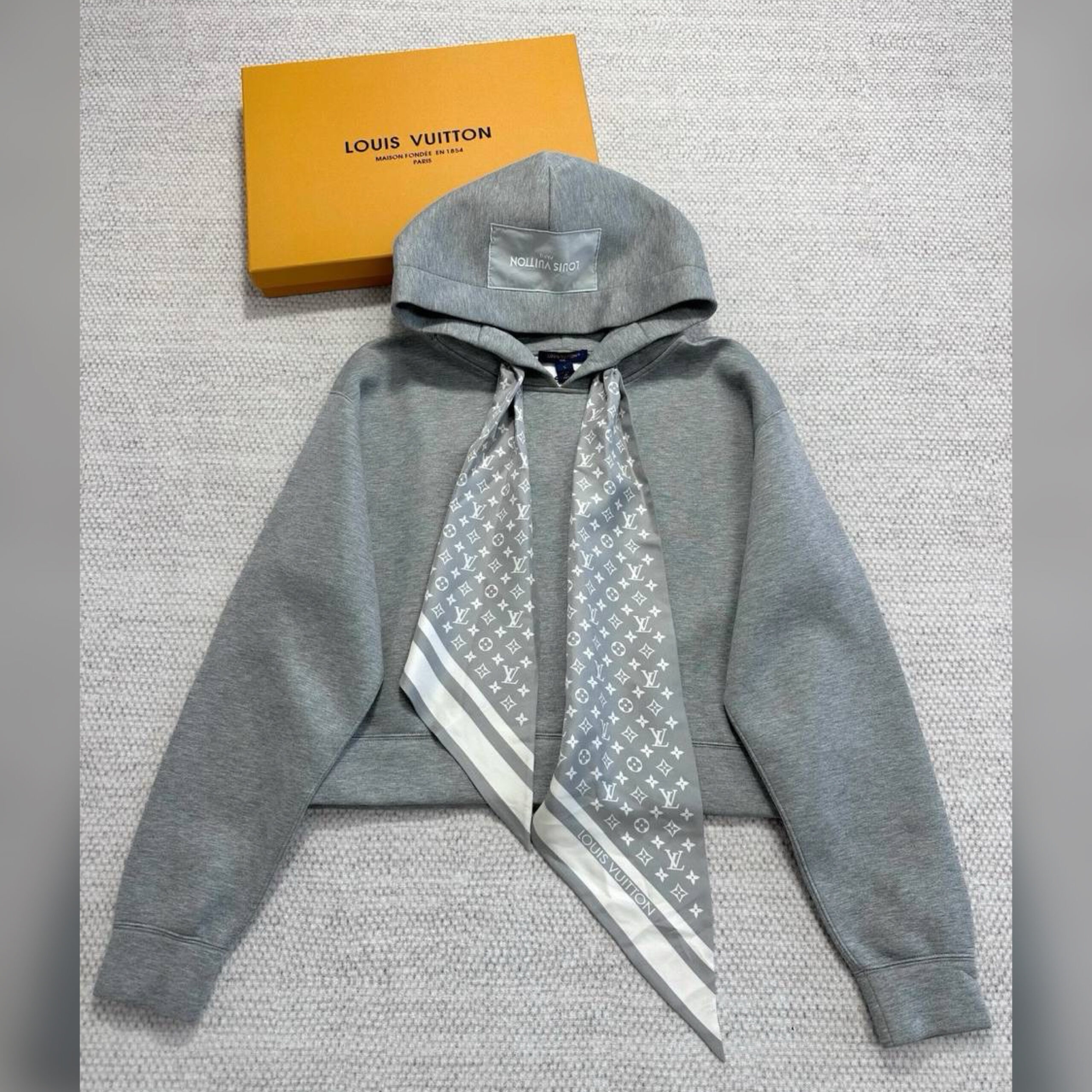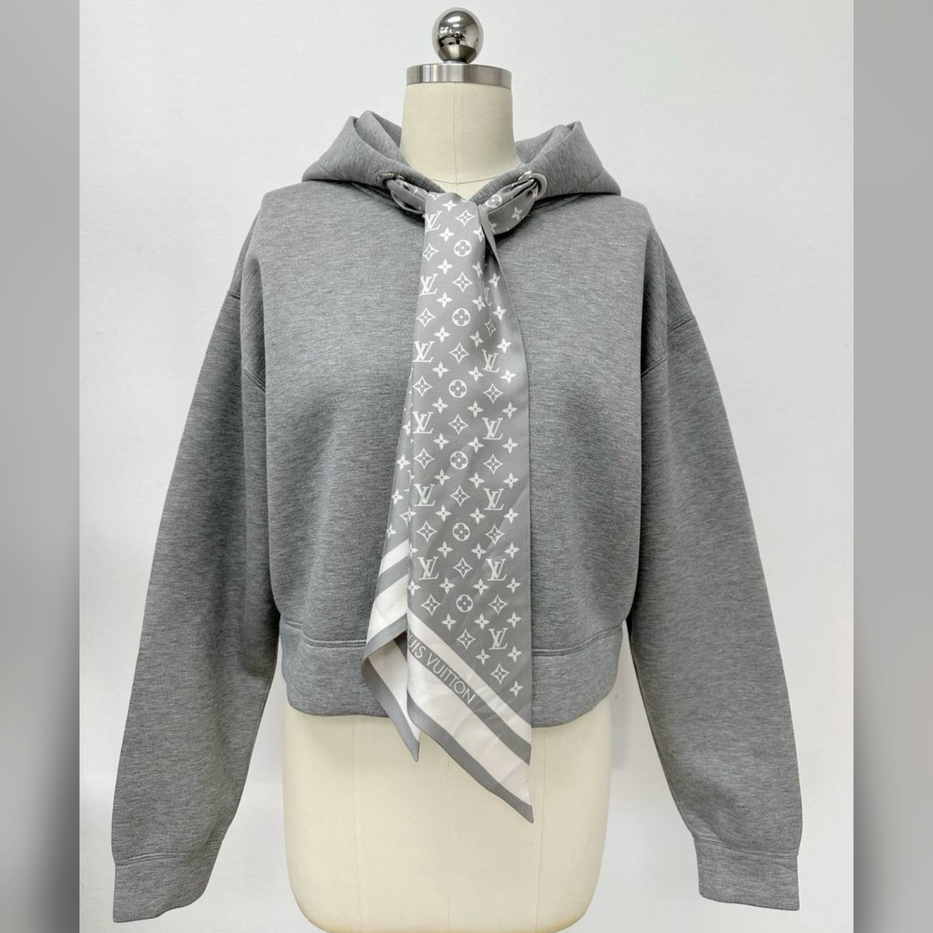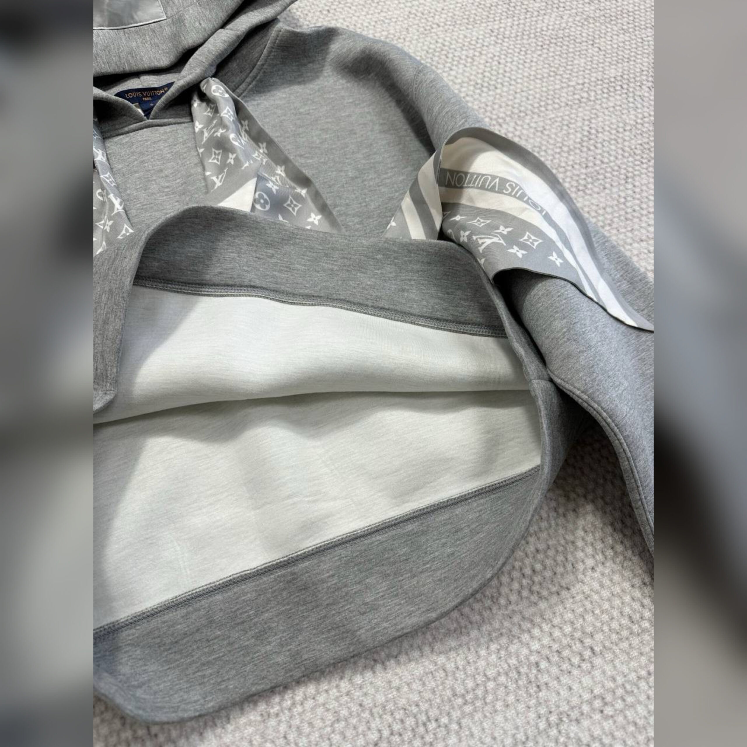 Объемный капюшон украшен биркой Louis Vuitton, а в его люверсы продет шелковый шарф Monogram, создающий эффектный контраст.