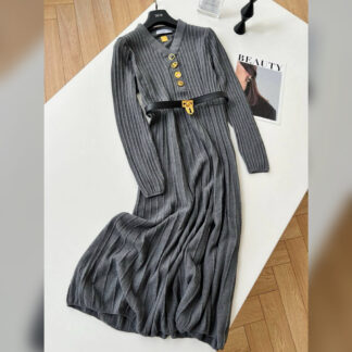 Макси-платье с длинными рукавами выполнили из мягкого трикотажа. Модель с фирменными пуговицами на укороченной планке и плиссированной юбкой дополнили съемным кожаным поясом с фигурной пряжкой.