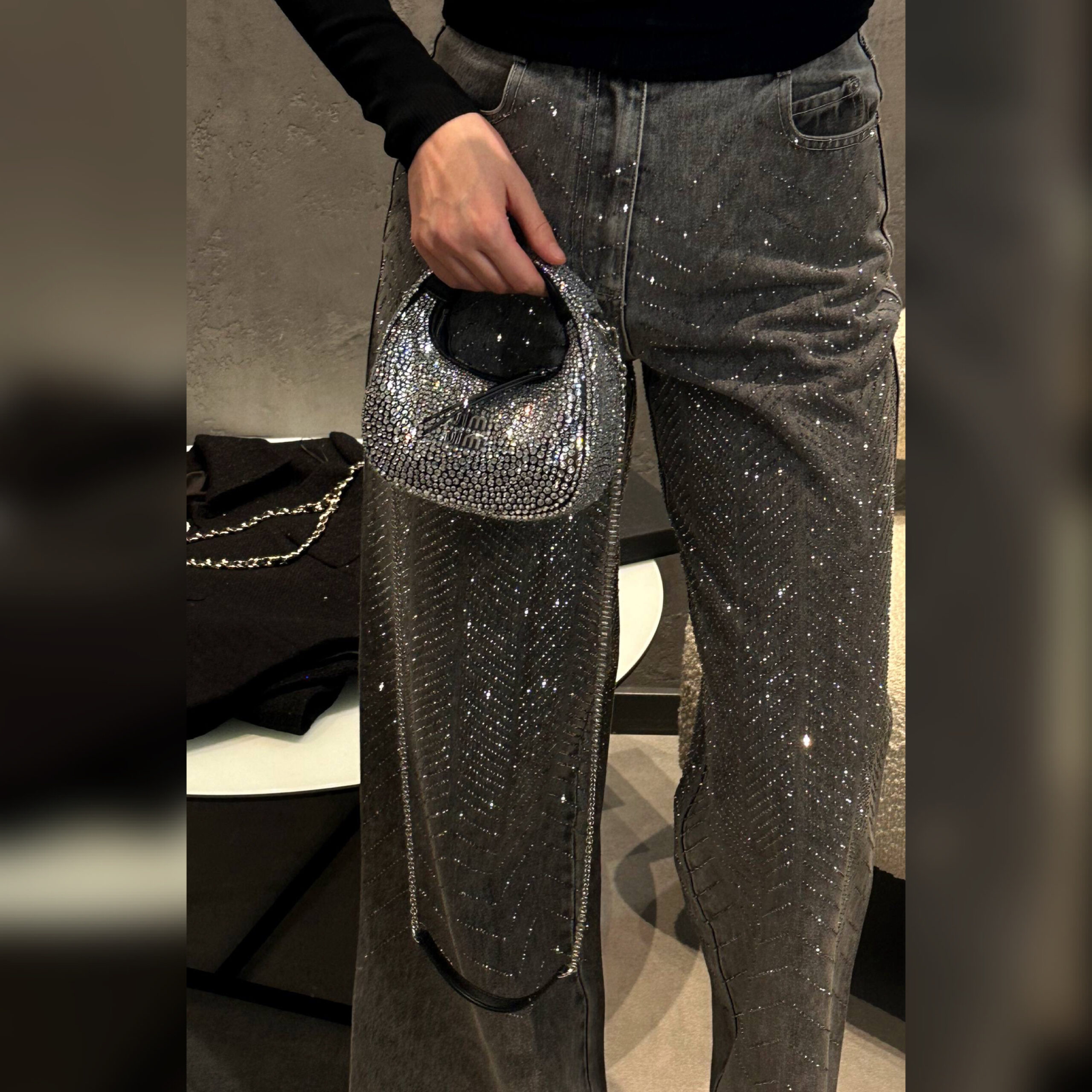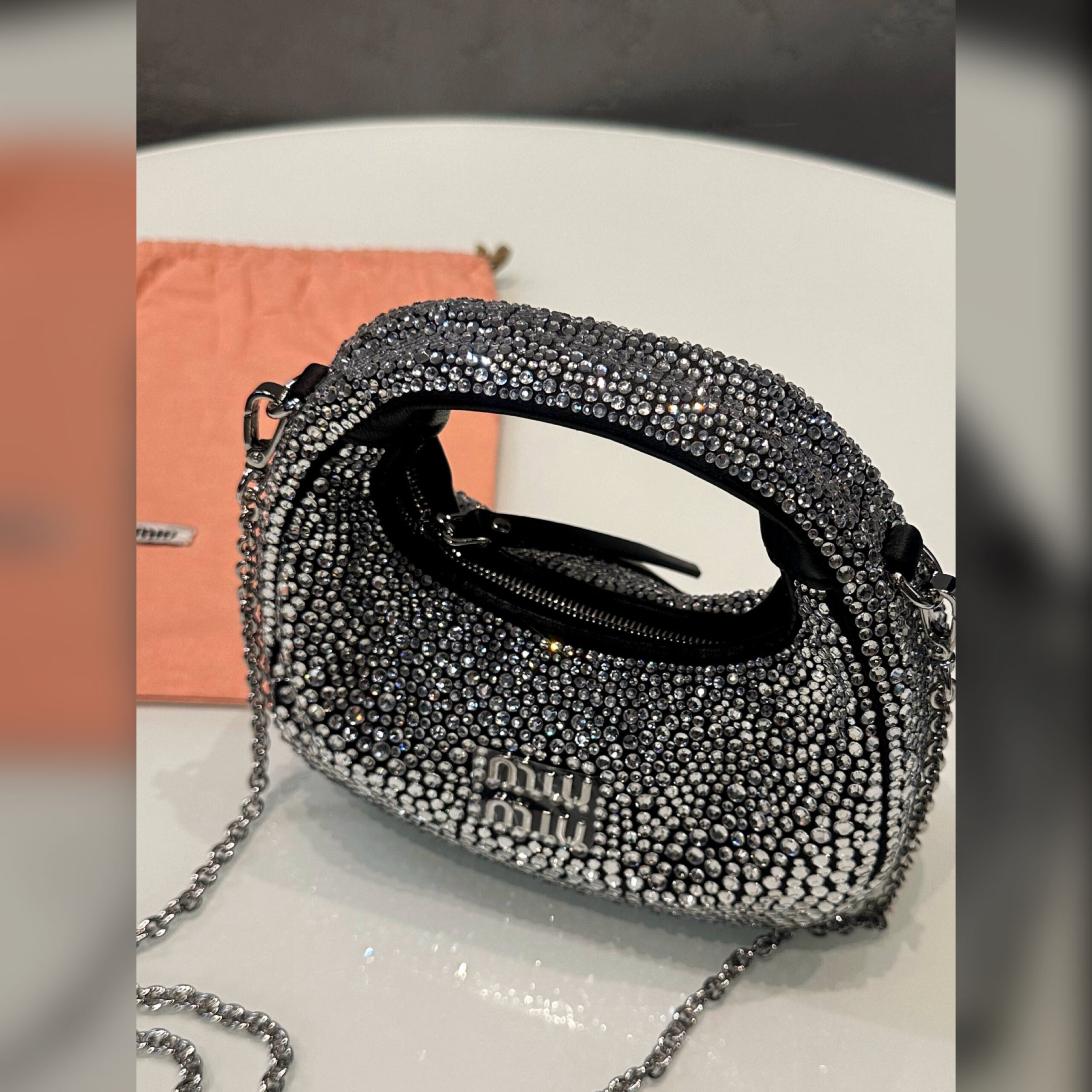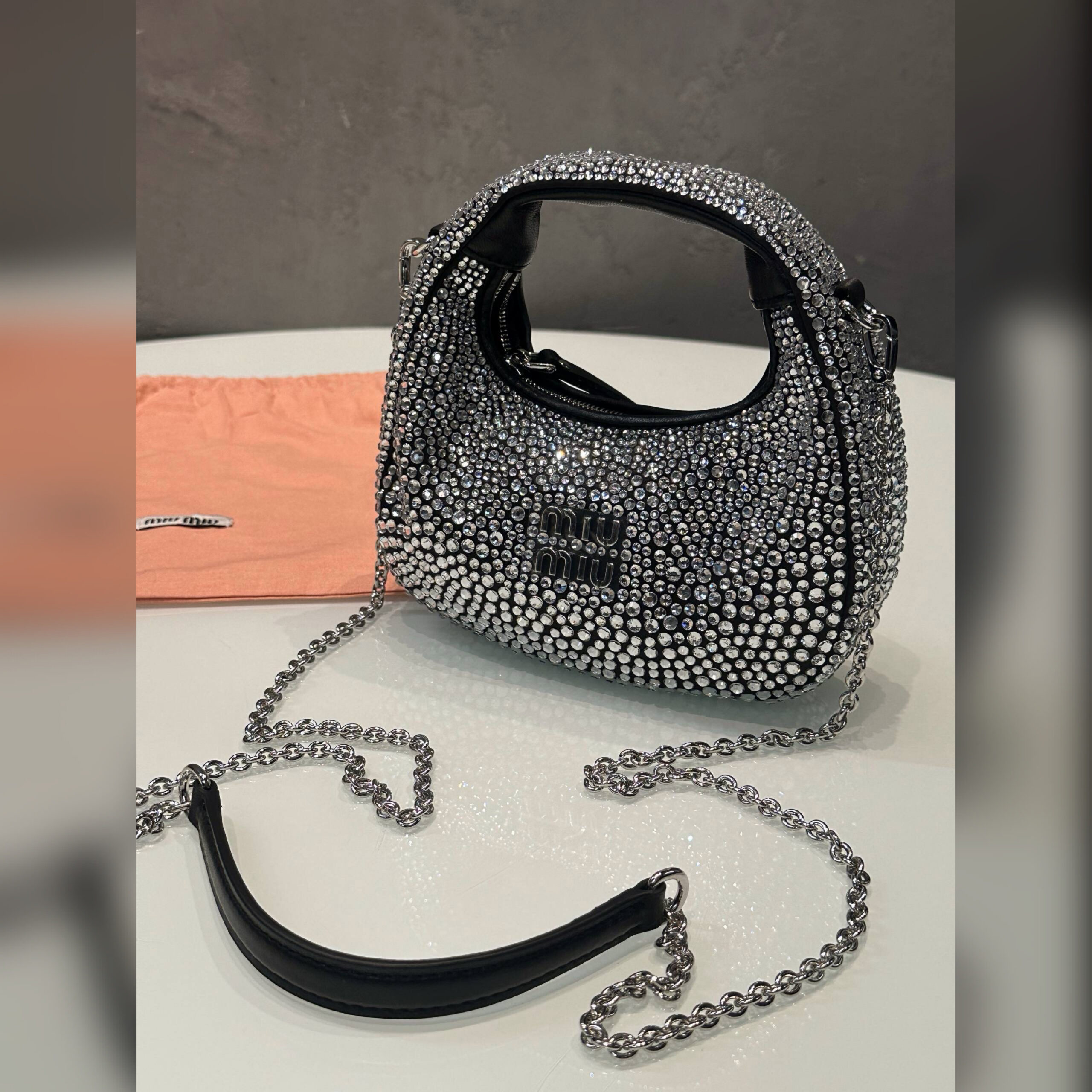 Лаконичный силуэт миниатюрной сумки Starlight Wander Миучча Прада компенсировала прозрачными кристаллами по всей поверхности, эффектно преломляющими свет в движении.