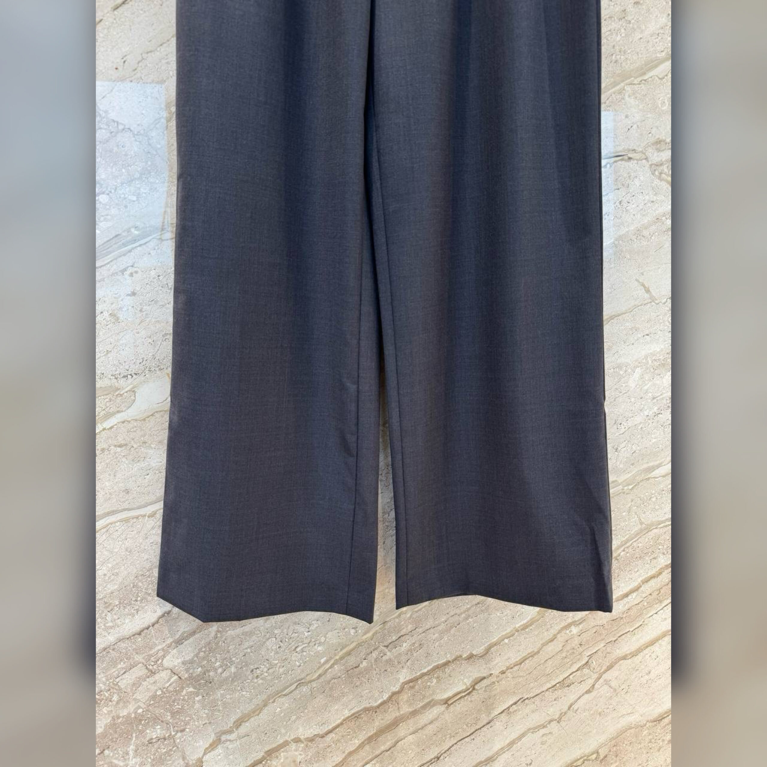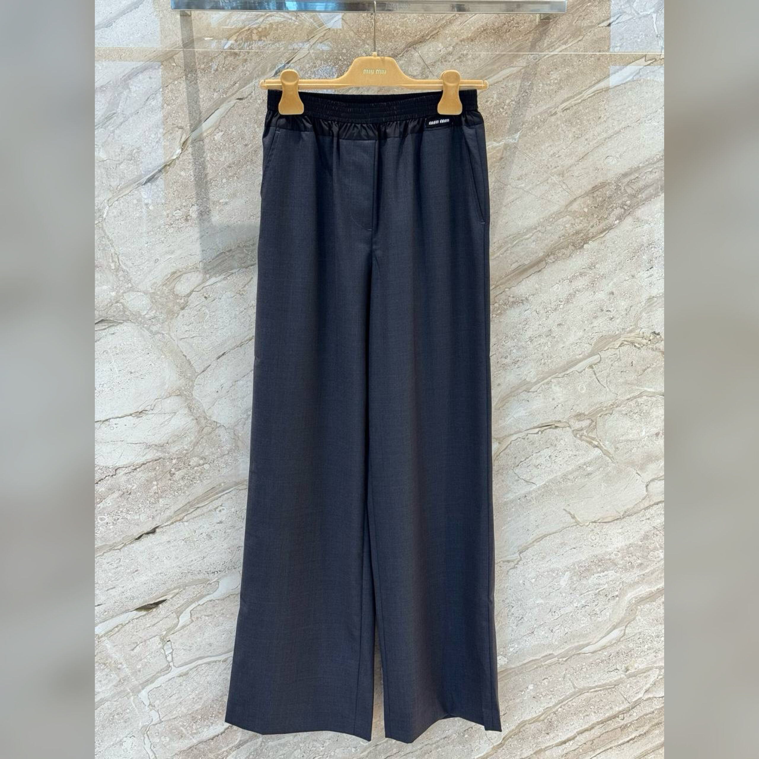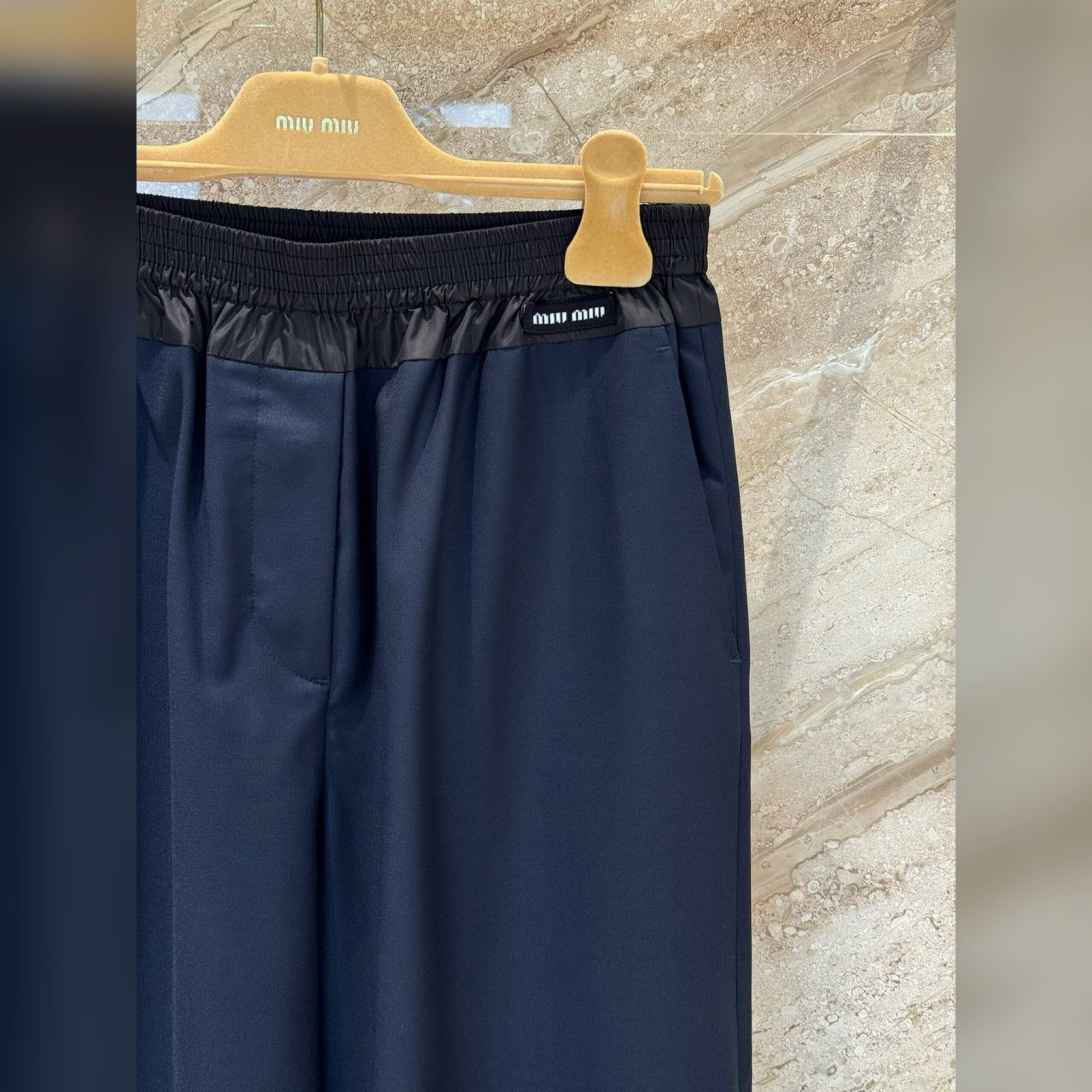 Формальный характер модели приобретает новое звучание в крое брюк с эластичным контрастным поясом и расслабленной посадкой, отражая экспериментальное видение Миу Миу.