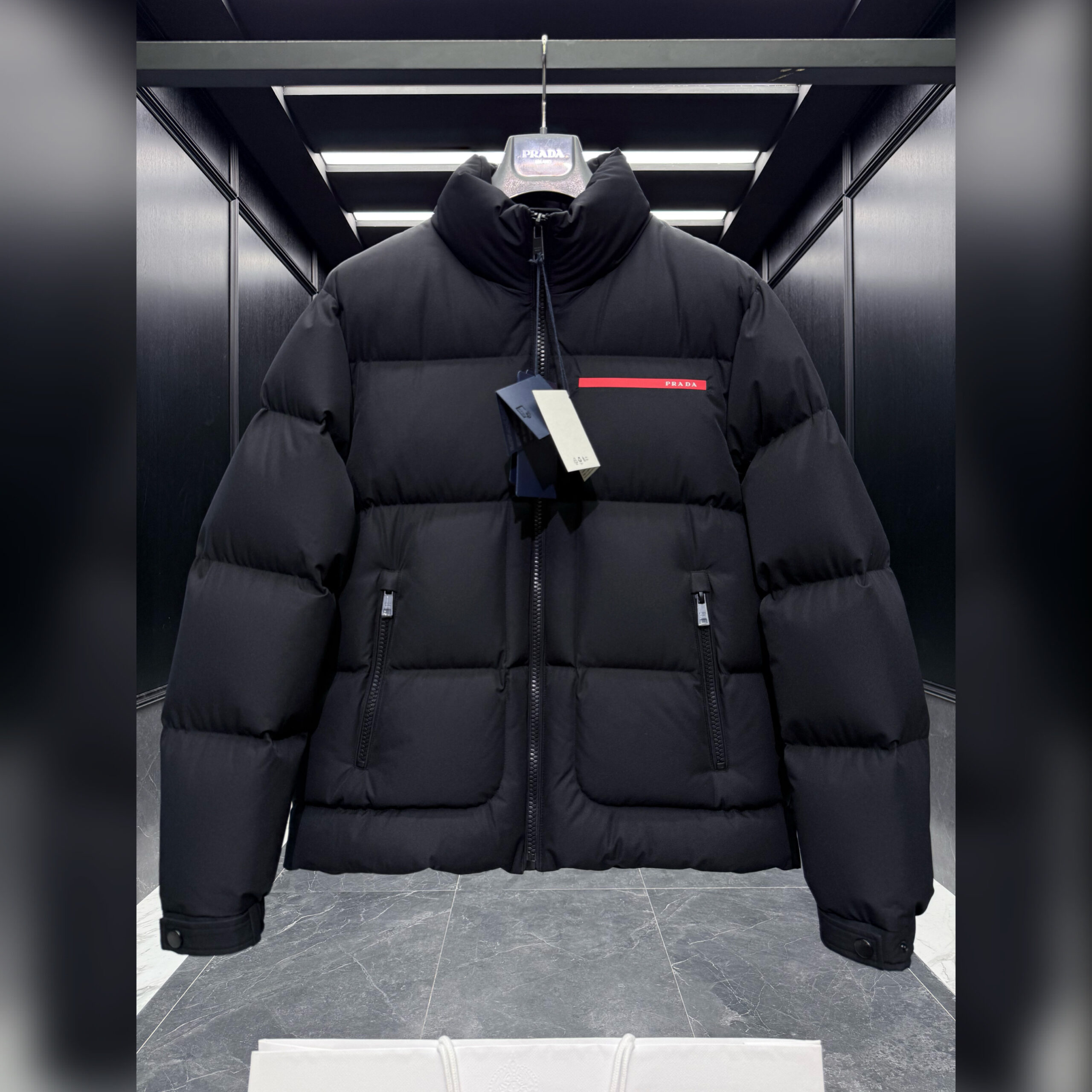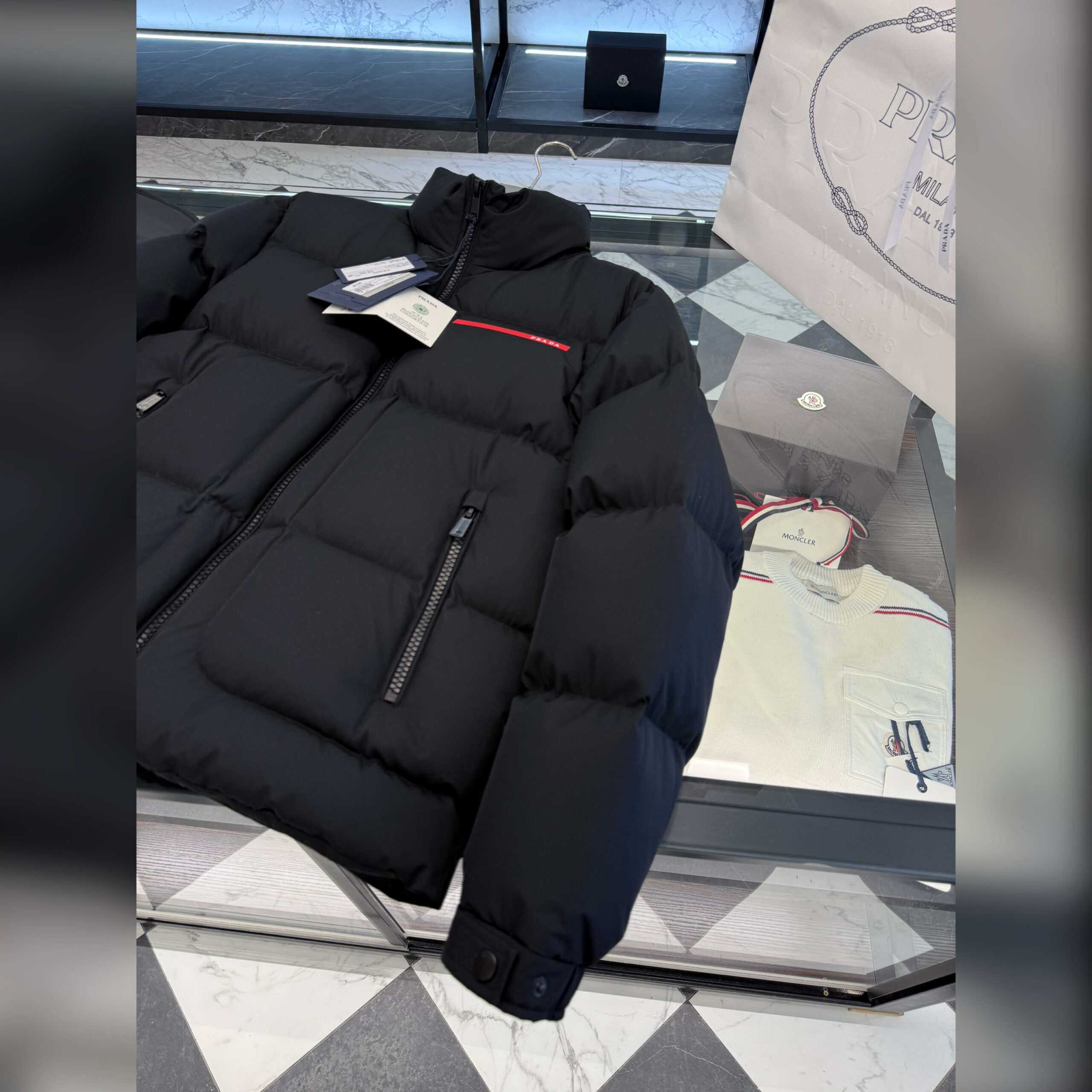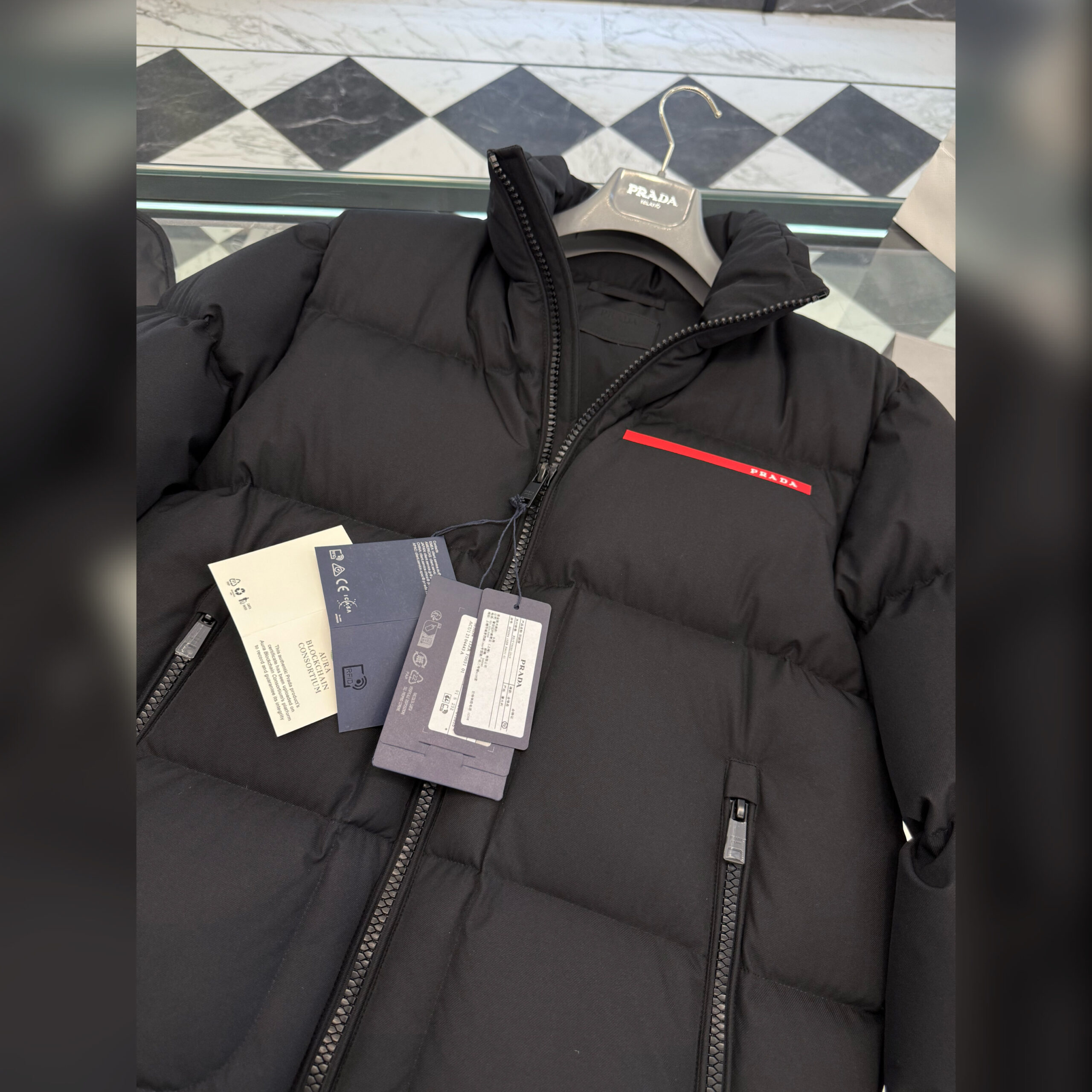 В осенне-зимнюю коллекцию Миучча Прада включила стеганый пуховик универсального черного цвета. Для изготовления куртки с воротником-стойкой дизайнер выбрала прочный матовый текстиль, который не промокает и легко очищается от загрязнений. Легкий наполнитель не только удерживает тепло внутри, но и придает модели объем. На груди – знаковая для линии Linea Rossa алая лента.