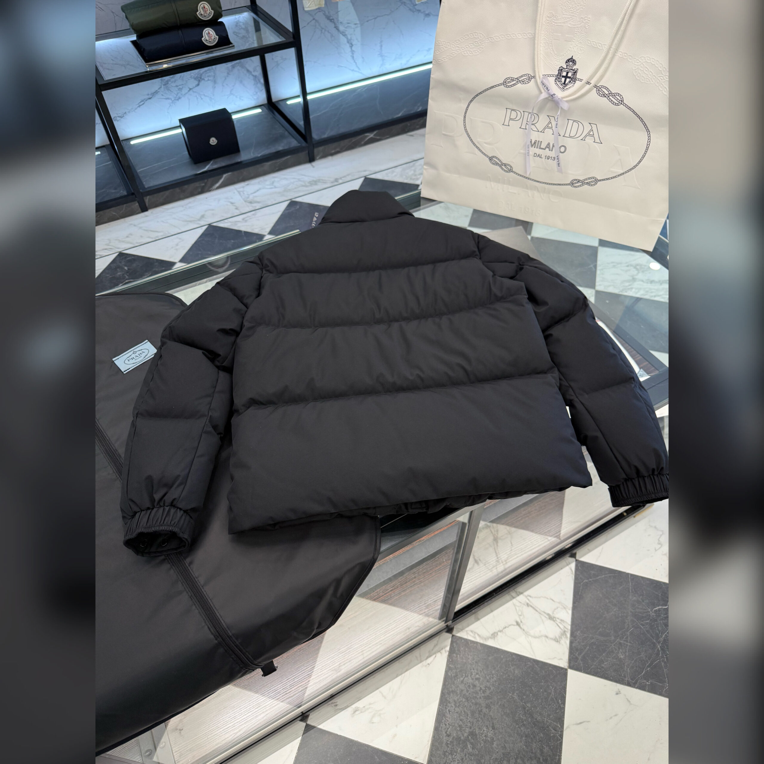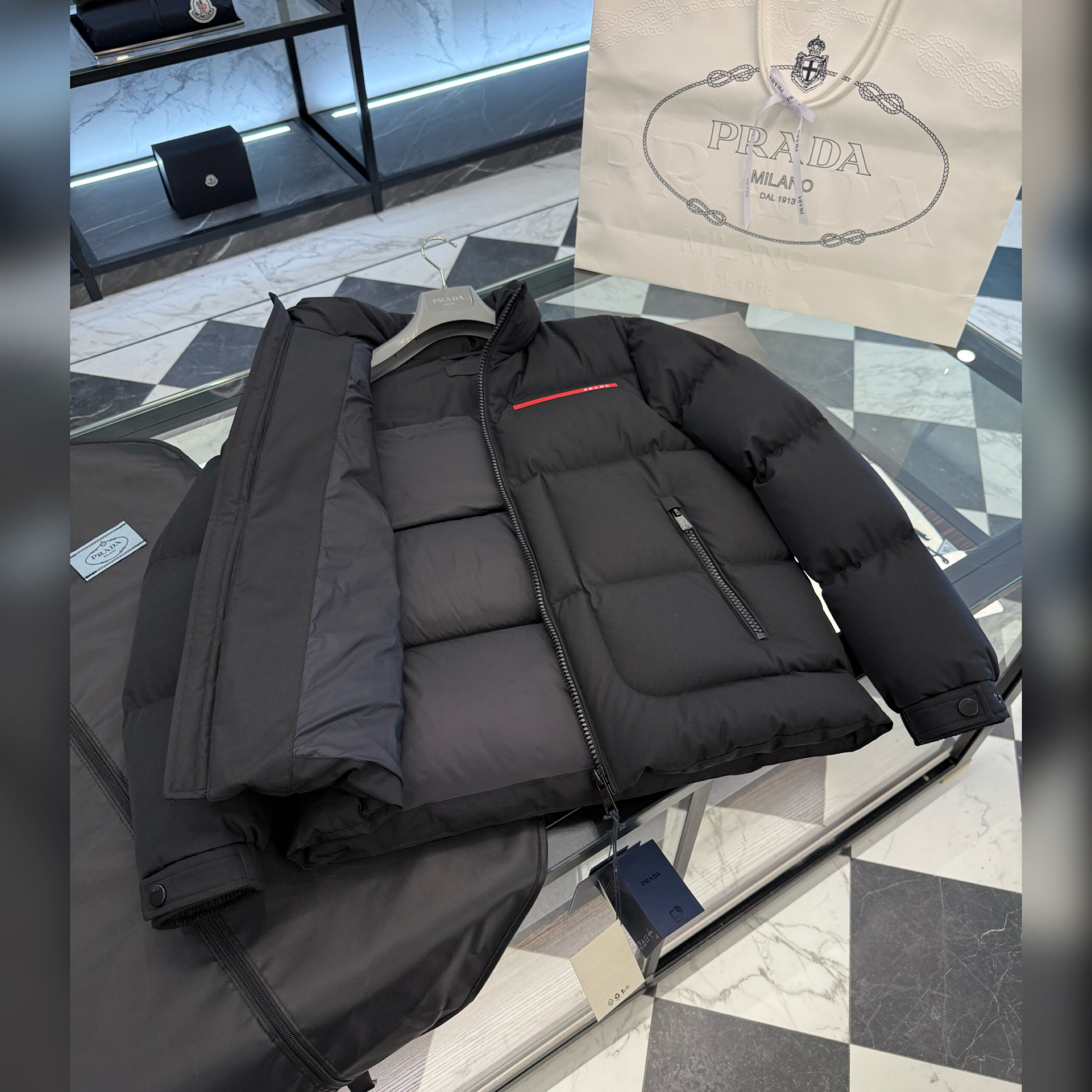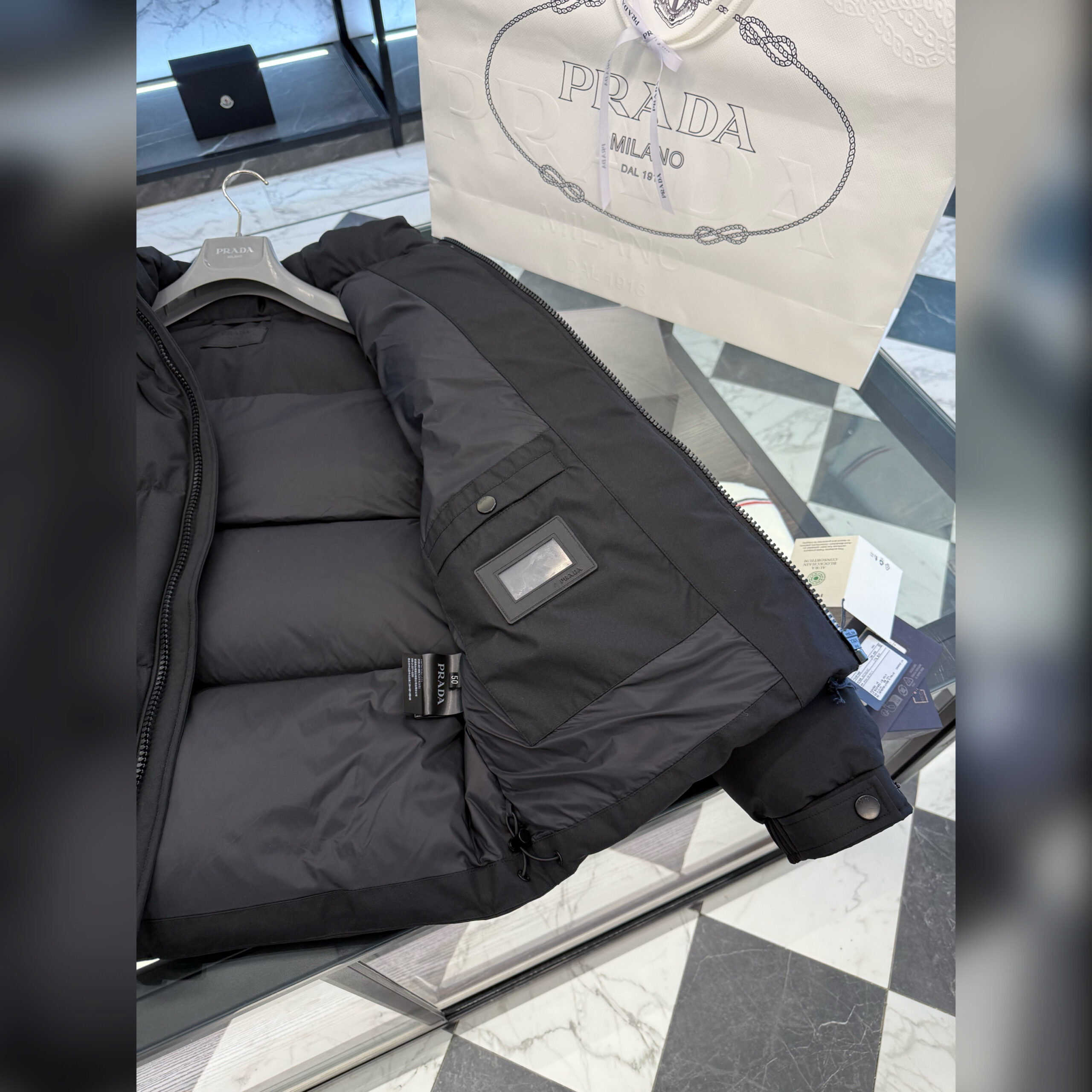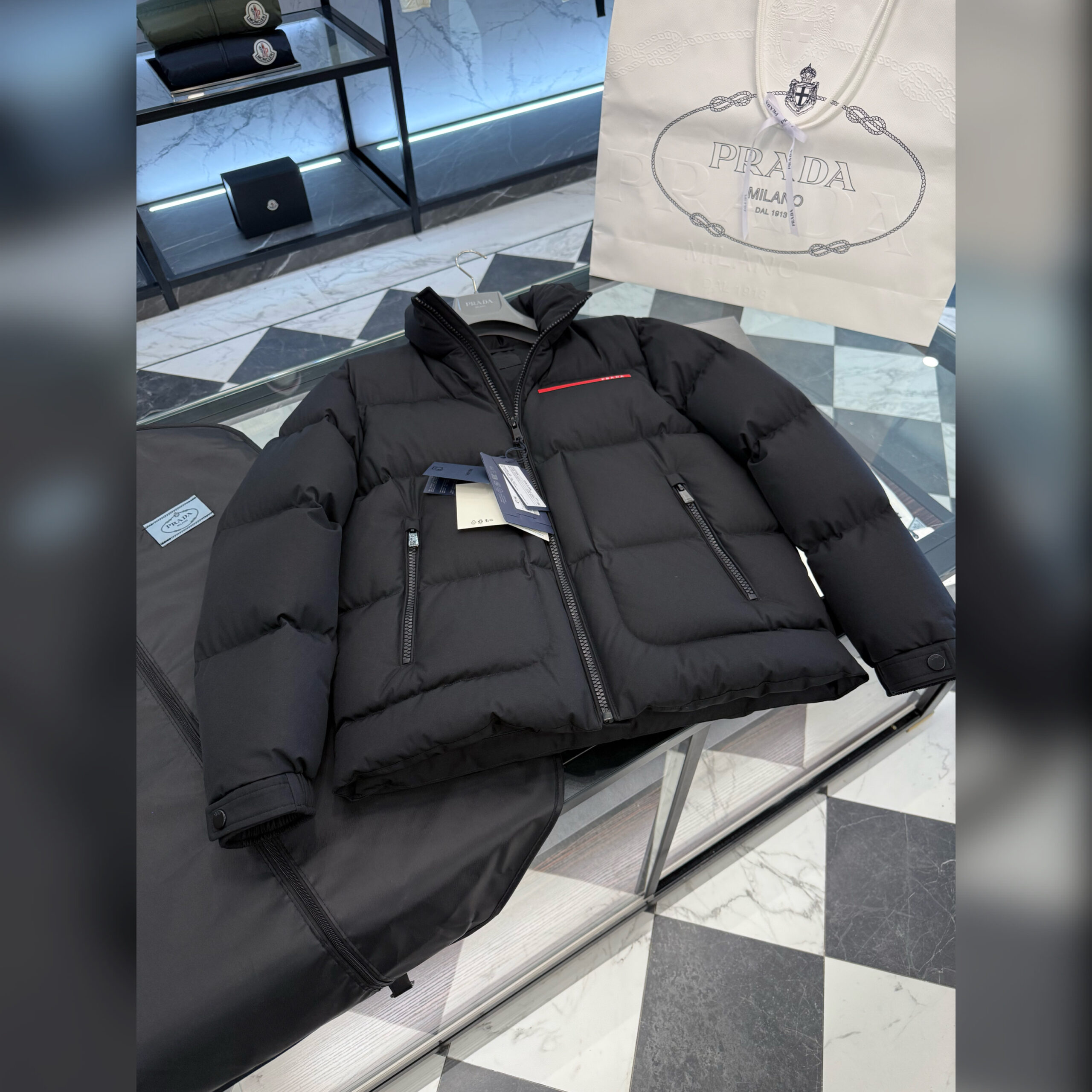 В осенне-зимнюю коллекцию Миучча Прада включила стеганый пуховик универсального черного цвета. Для изготовления куртки с воротником-стойкой дизайнер выбрала прочный матовый текстиль, который не промокает и легко очищается от загрязнений. Легкий наполнитель не только удерживает тепло внутри, но и придает модели объем. На груди – знаковая для линии Linea Rossa алая лента.