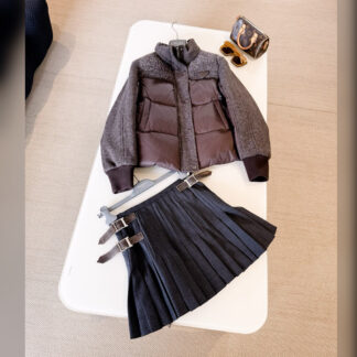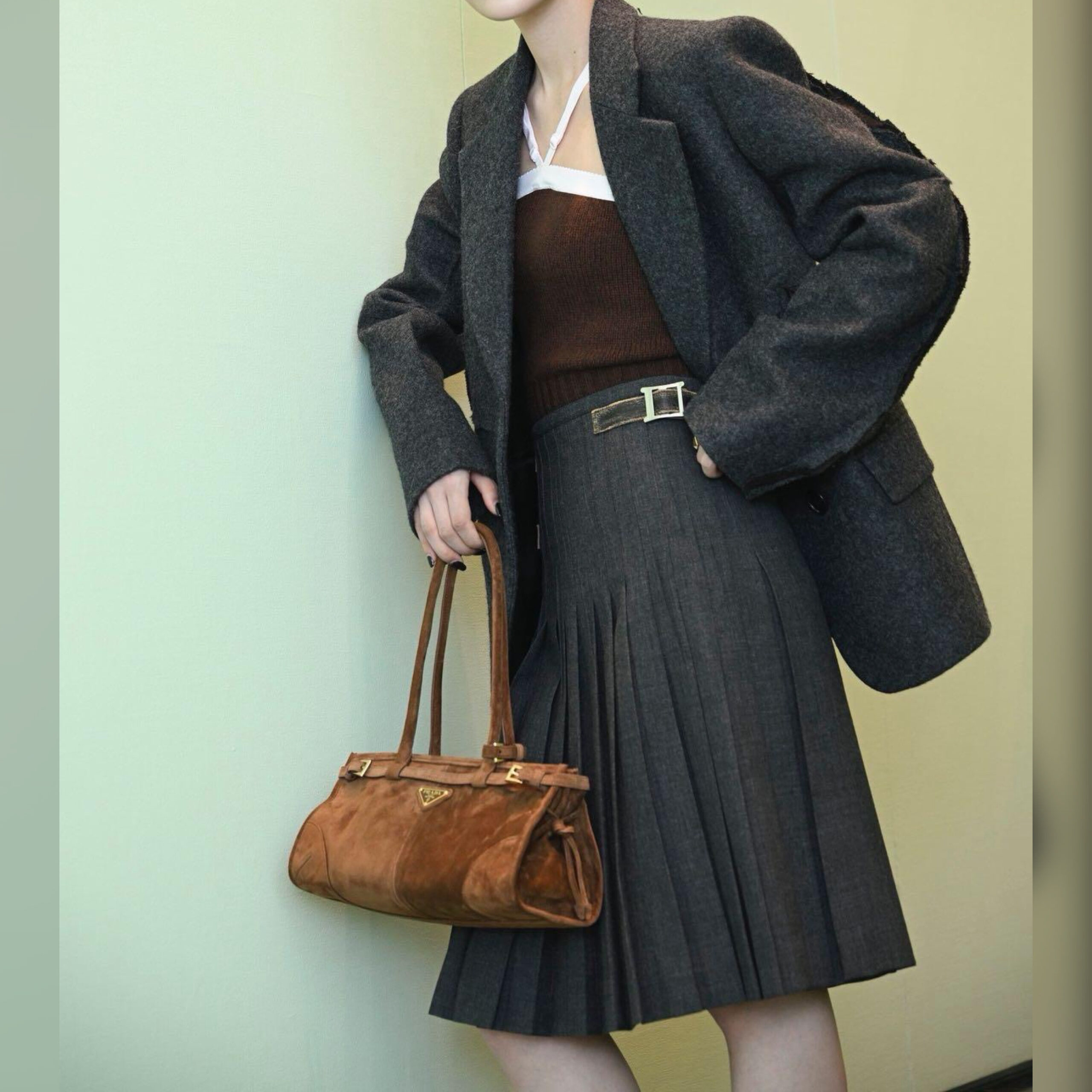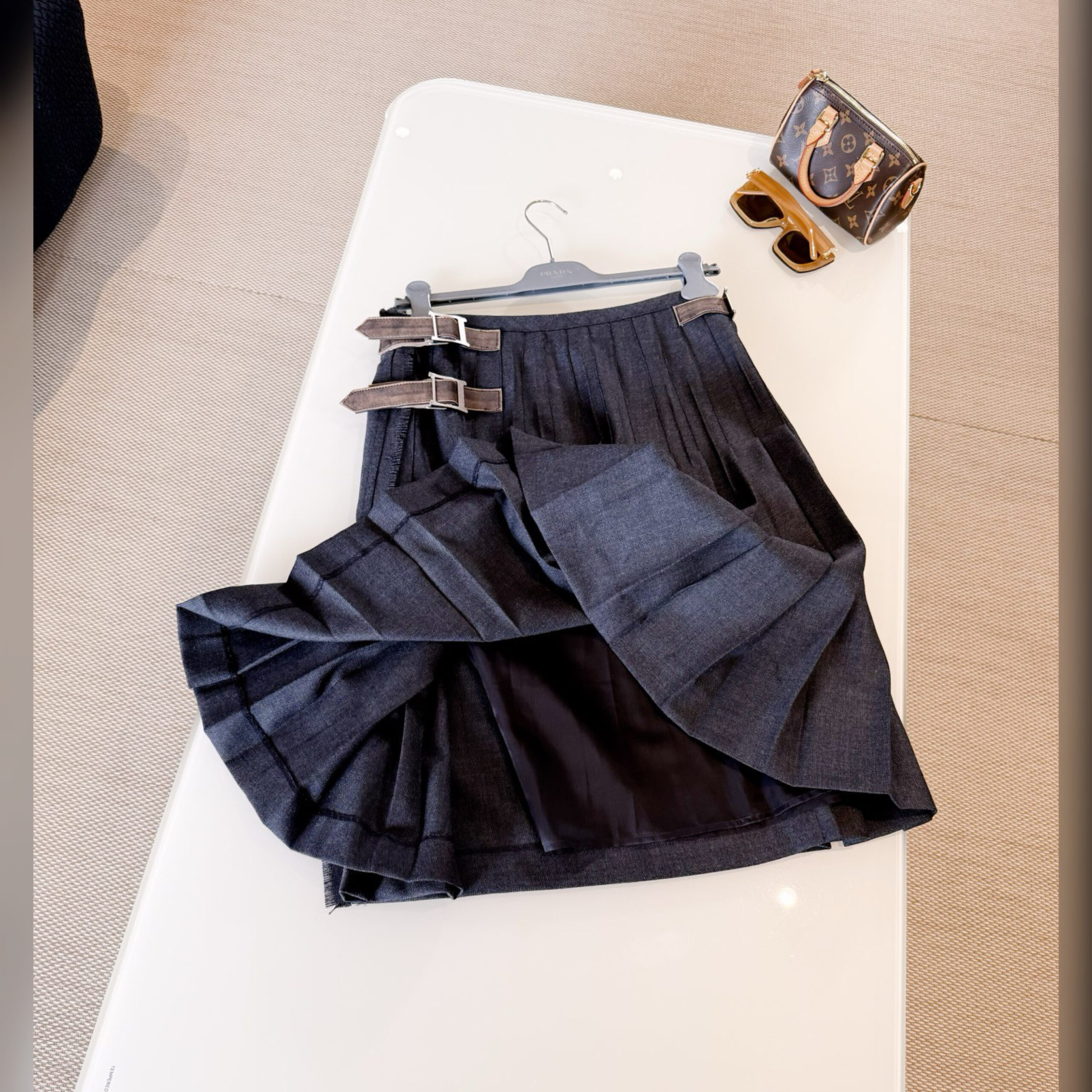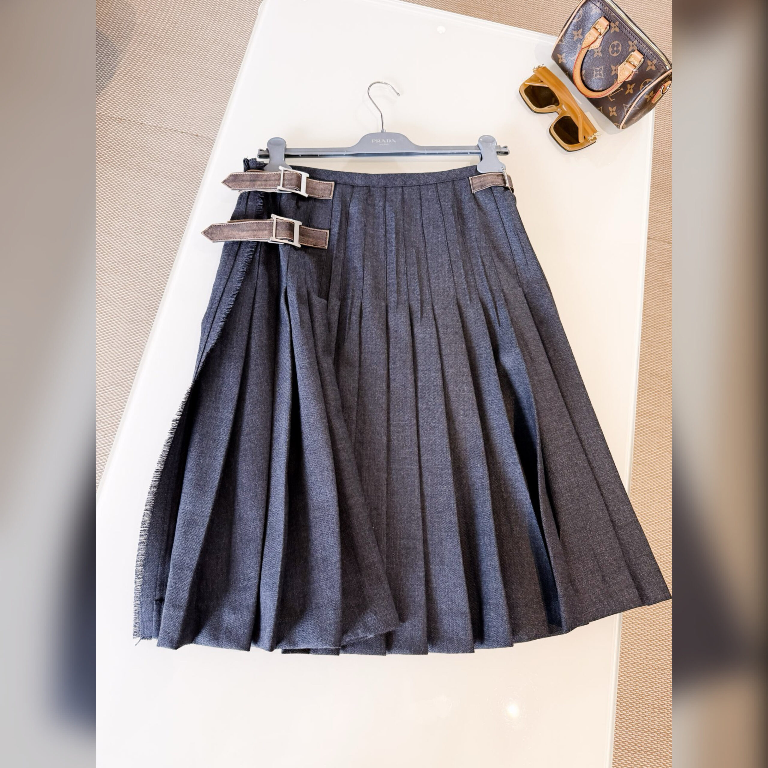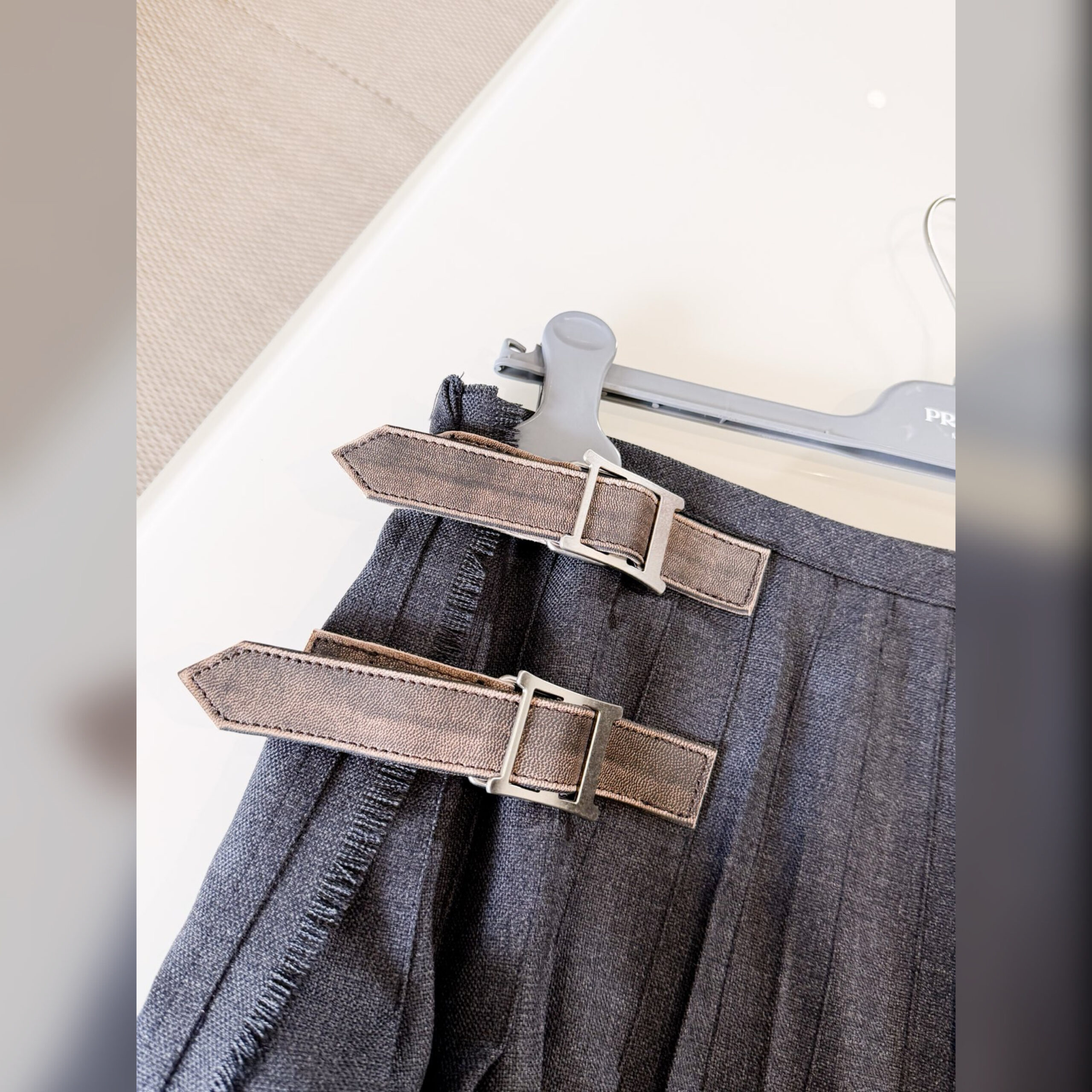 Юбка-миди с расклешенным силуэтом и плиссировкой украшена изысканными деталями. Модель, изготовленная из шерсти, дополнена кожаными ремнями с винтажным эффектом и бахромой.