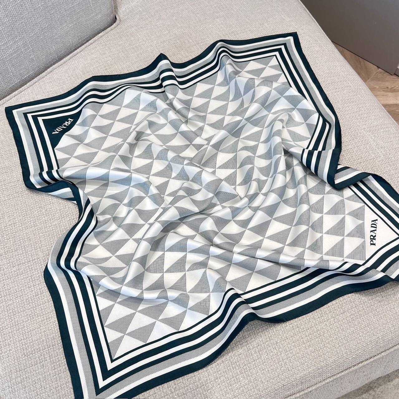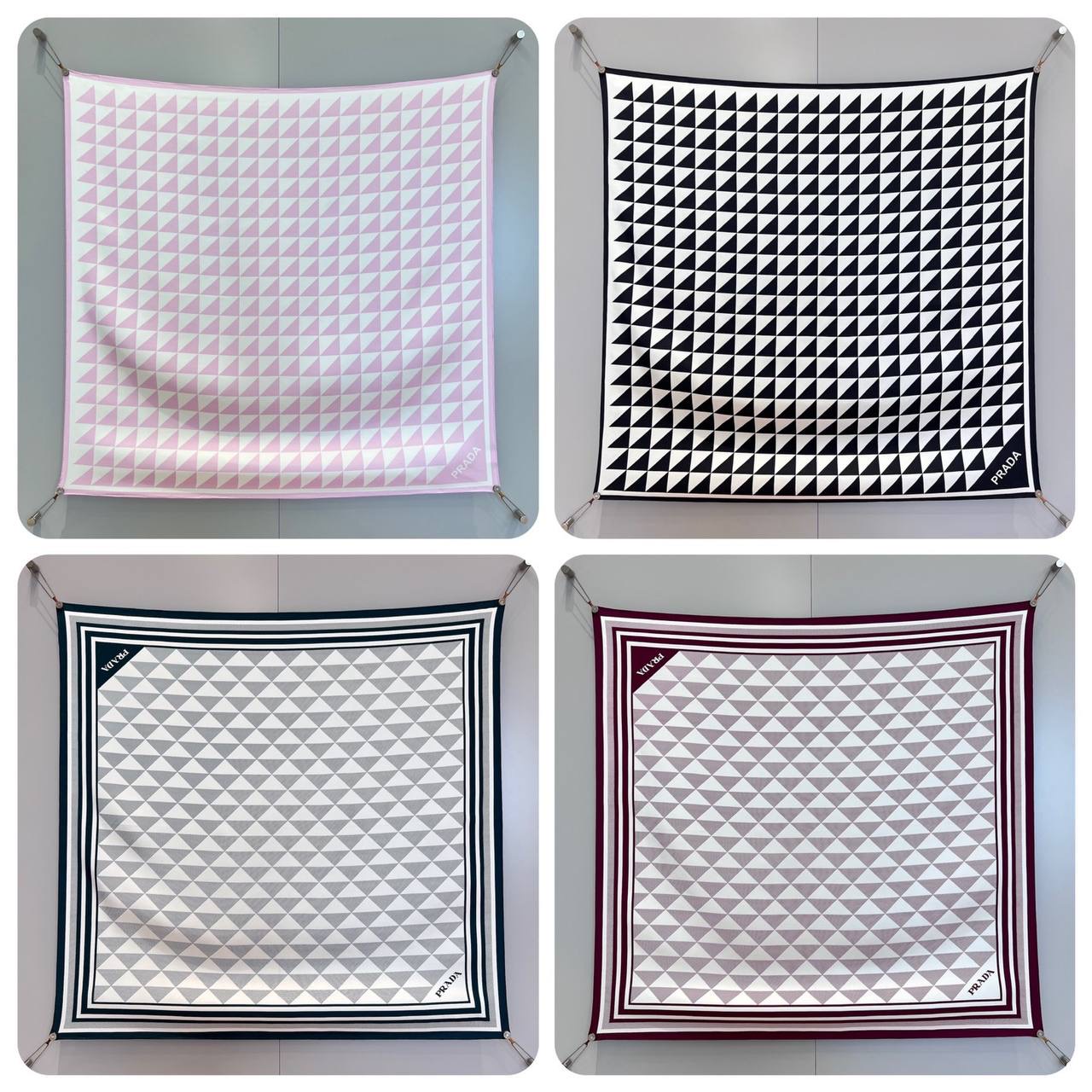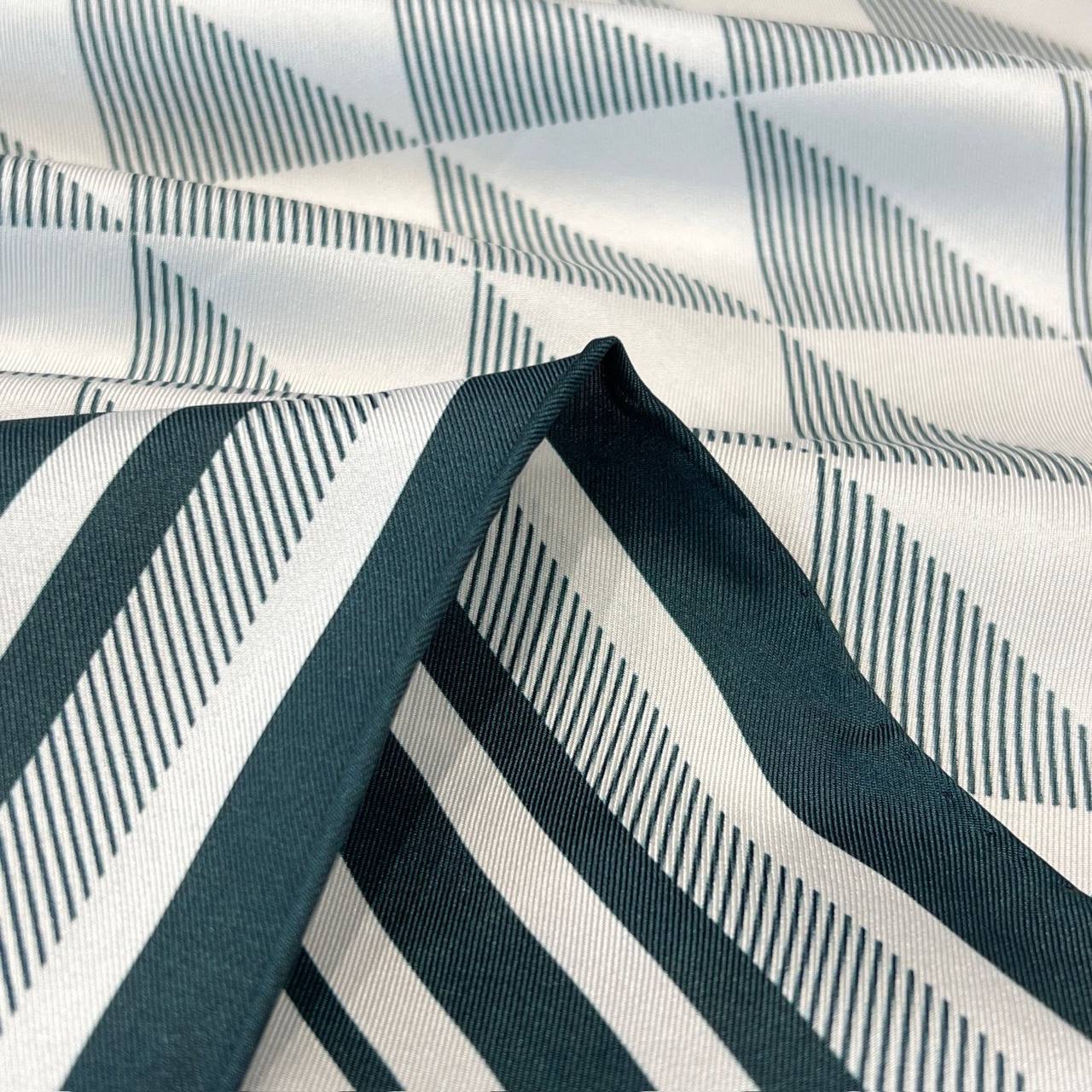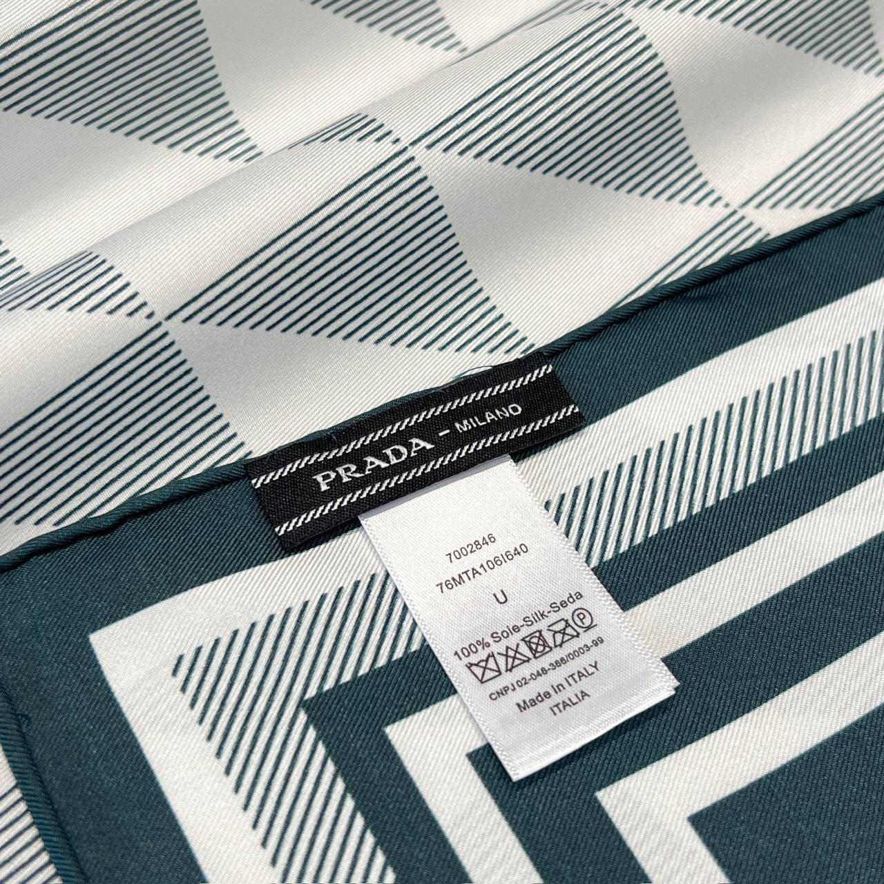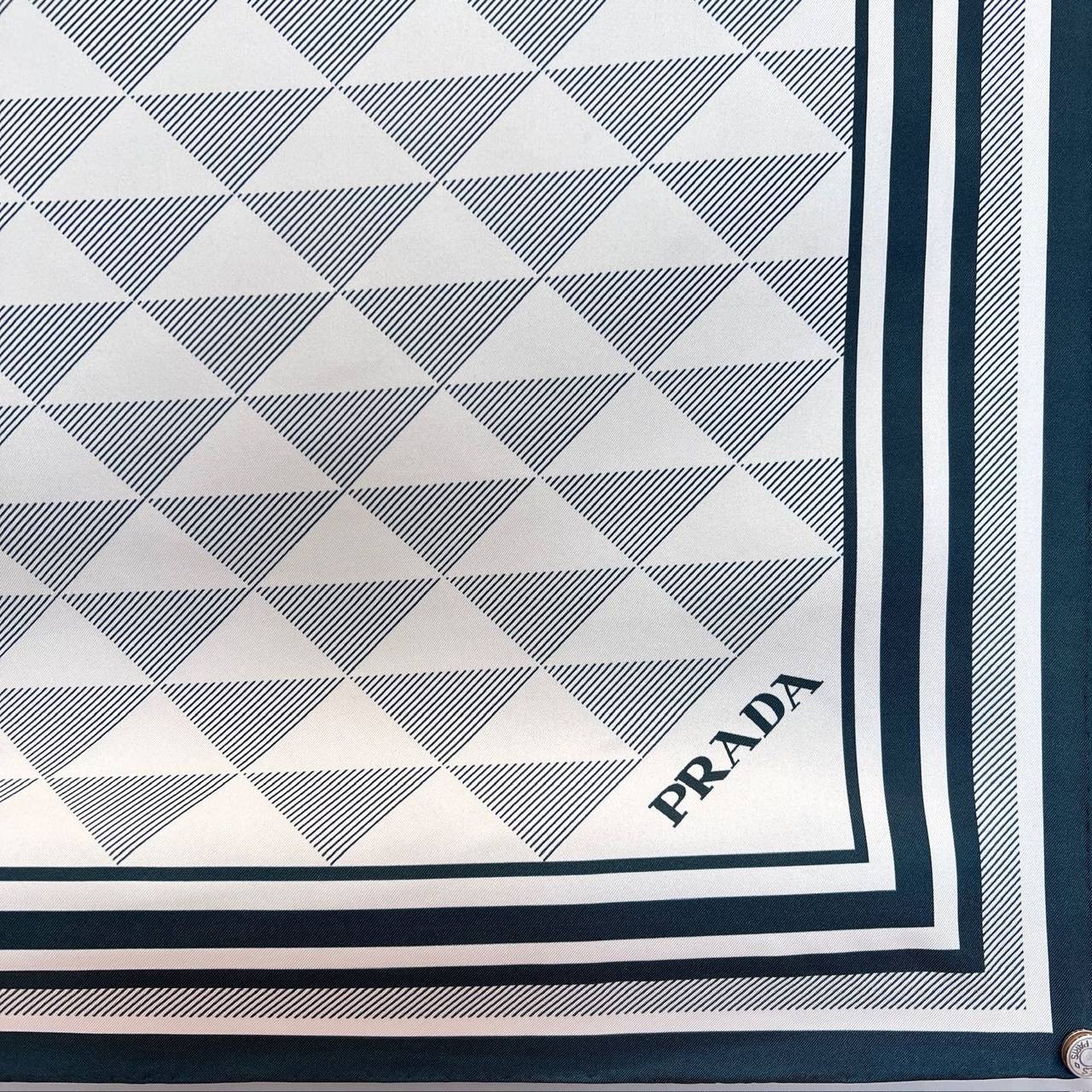 Платок с графичным мотивом, вдохновленным фирменной треугольной эмблемой, украсили контрастным кантом и логотипом марки. Для изготовления аксессуара использовали мягкий, но прочный шелковый твил, который хорошо драпируется и почти не мнется. Изделие подшили вручную роликом.