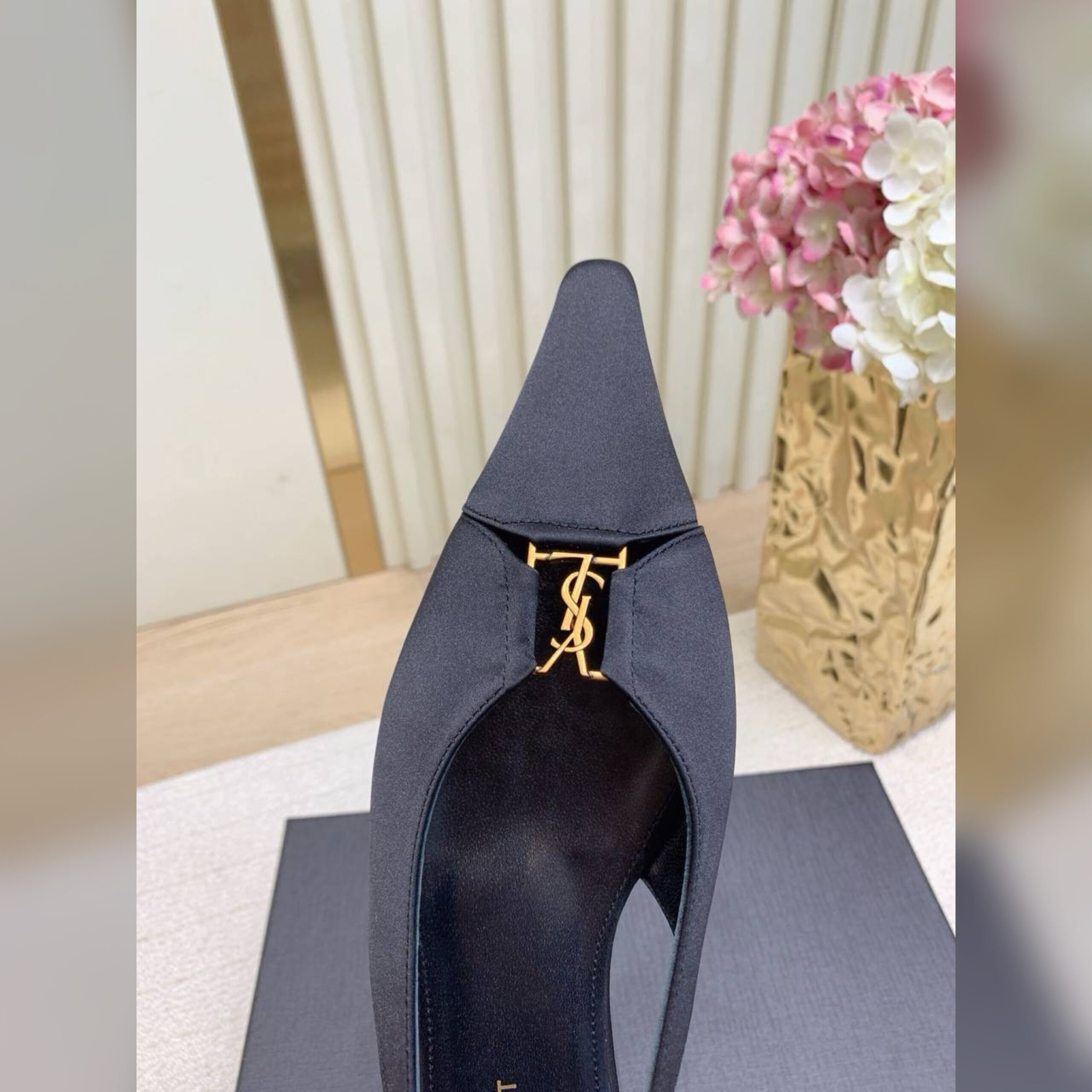 Дизайнер марки, основанной Ивом Сен-Лораном, поместил в фокус внимания декор в виде монограммы Кассандра. Эту деталь расположили на союзке модели.