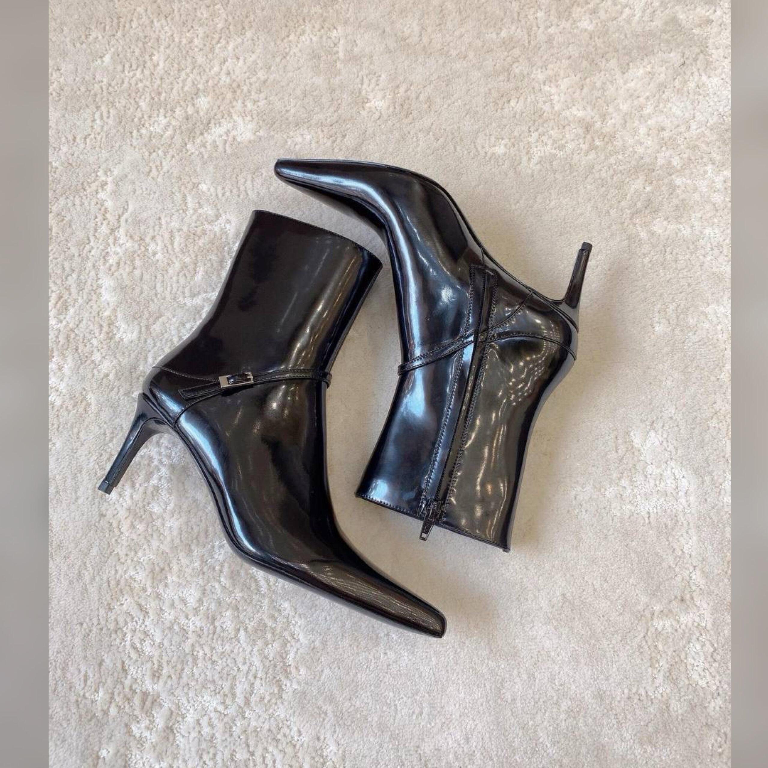 Ботильоны с прямоугольной пряжкой на декоративном ремешке выполнили из глянцевой телячьей кожи. Модель на изящном тонком каблуке застегивается на молнию сбоку.