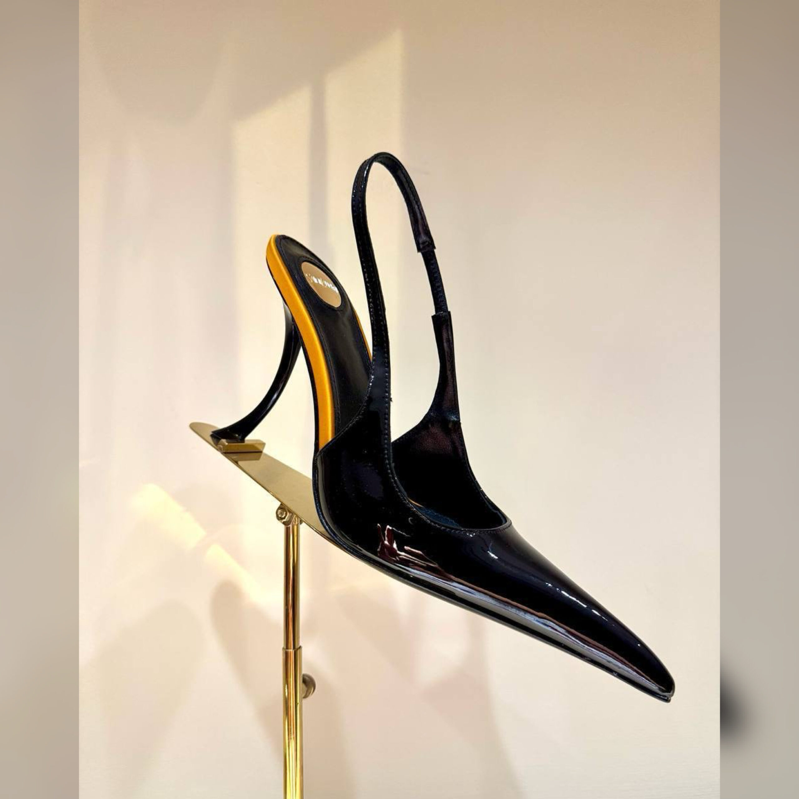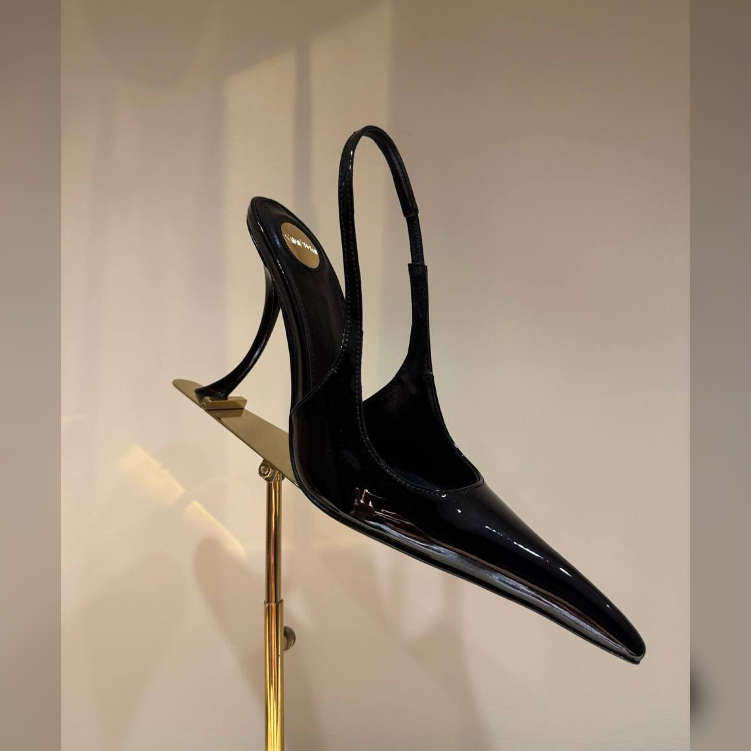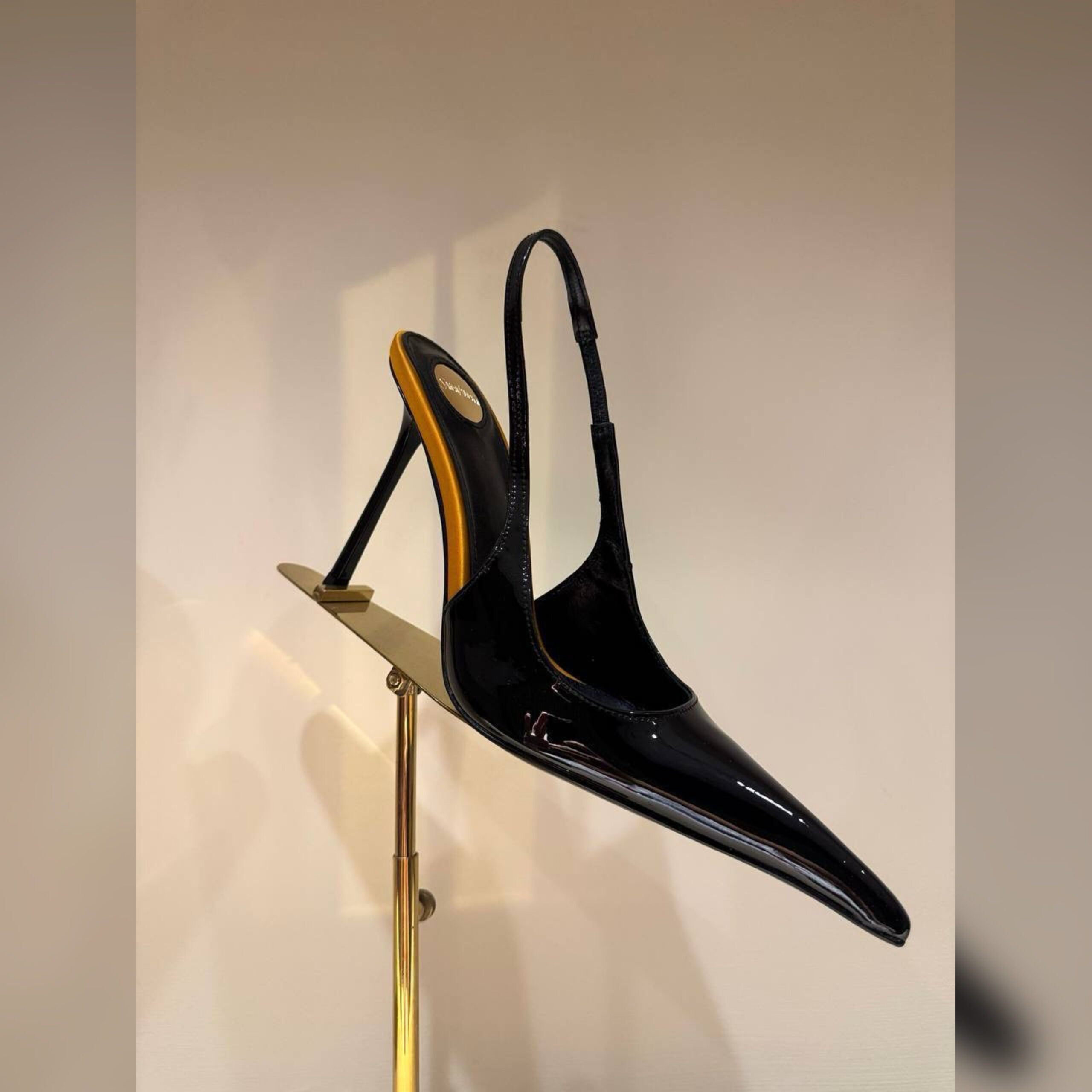 Туфли Vendome с зауженным мысом изготовили из гладкой телячьей кожи с лаковым покрытием и из фактурной замши. Модель с эластичным ремешком поставили на высокую шпильку.
