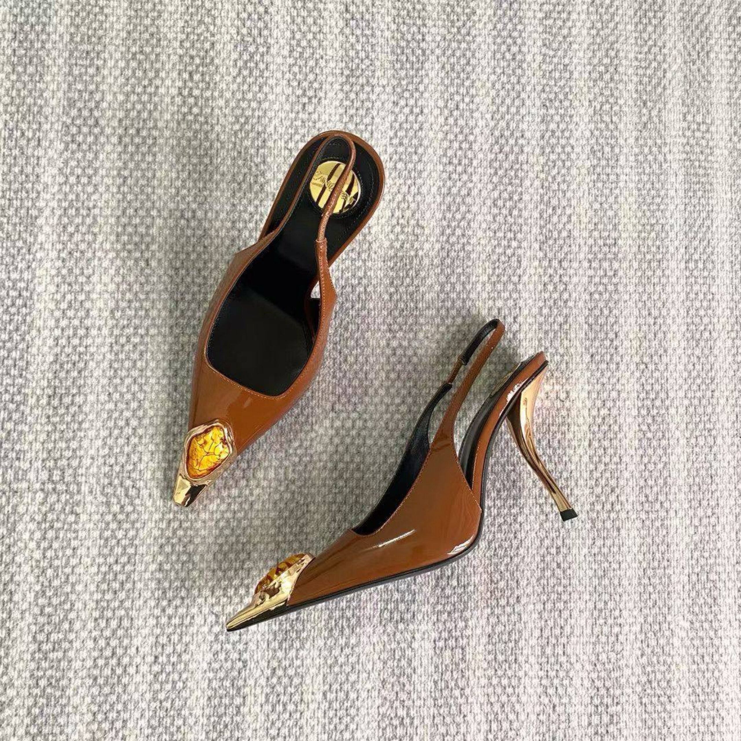 Туфли-слингбэки с зауженным мысом и узким ремешком на открытом заднике мастера марки, основанной Ивом Сен-Лораном, выполнили из гладкой лакированной кожи.